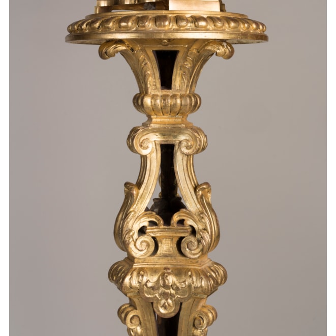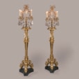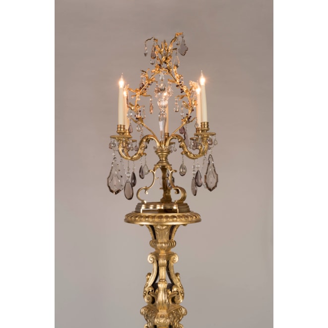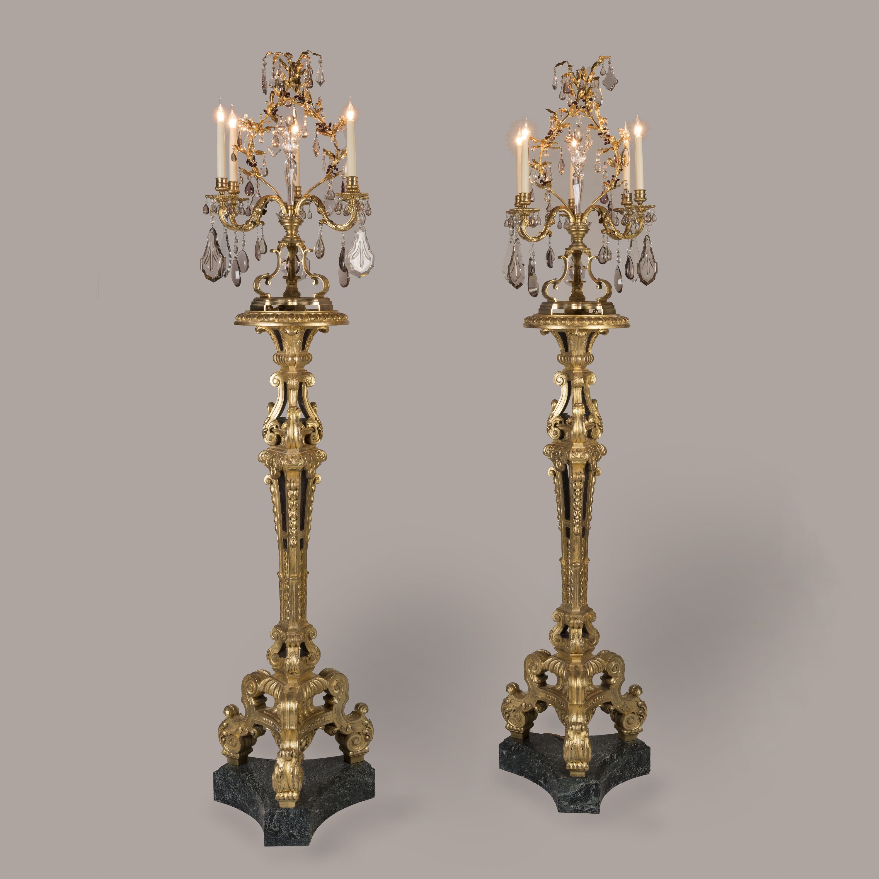 Supported on incurved tripartite plinths, the pair of torchères hand-carved in the French style, with three scrolled legs and a triangular tapering shaft adorned with descending husks, the circular gadrooned tops on a spreading acanthus leaf neck support. Together with their striking crystal and ormolu five-light girandoles.
