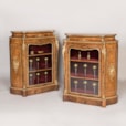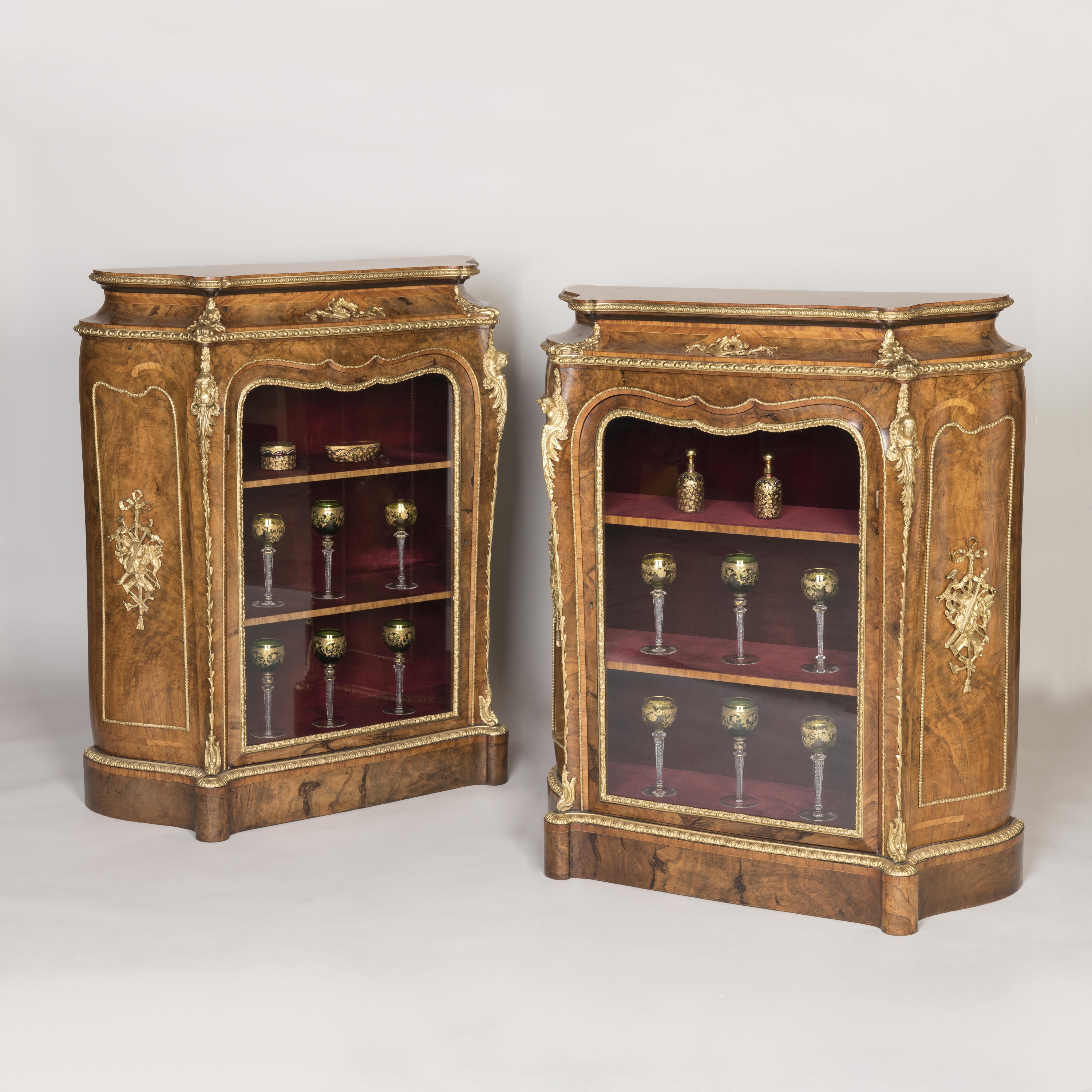This pair of cabinets are characteristic of the French influence in English cabinetwork around the mid nineteenth century. The quarter-veneering seen in the tulipwood is a typical continental technique, as is the use of ormolu, while the curved glass doors are an English feature following the lines of a magnificent upright burr-walnut piano that was a great hit at the Crystal Palace.