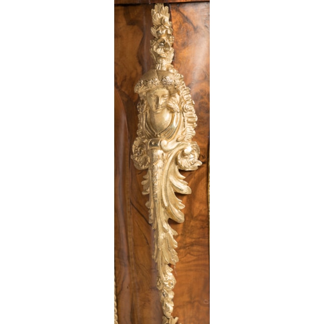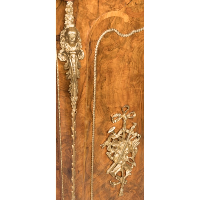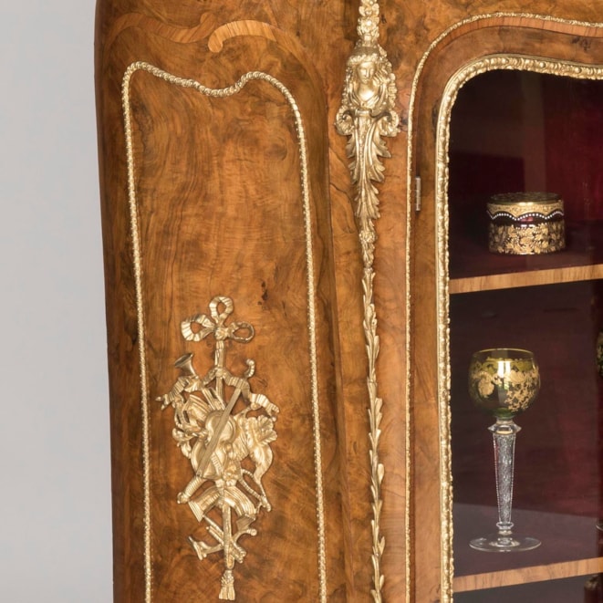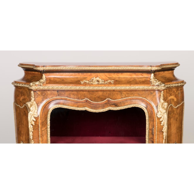 Designed in the Franglais manner combining English and French features, the side cabinets of serpentine outline veneered in burr walnut with tulipwood crossbanding and gilded bronze mounts, having curved sides decorated with musical trophies, the glazed central doors enclosing a shelved interior, the rounded corners of the cabinets with figural espagnolettes; with an upper platform of smaller graduated size. Stamped by the maker 'GILLOW.'