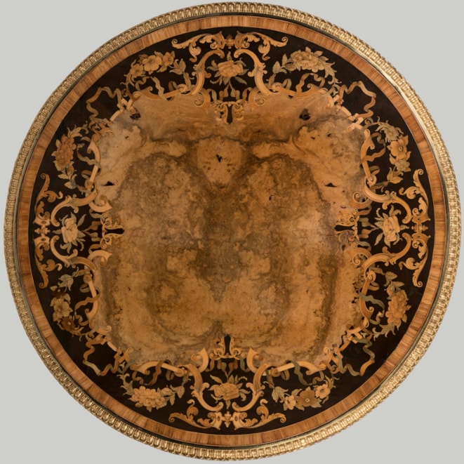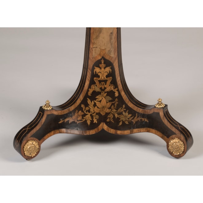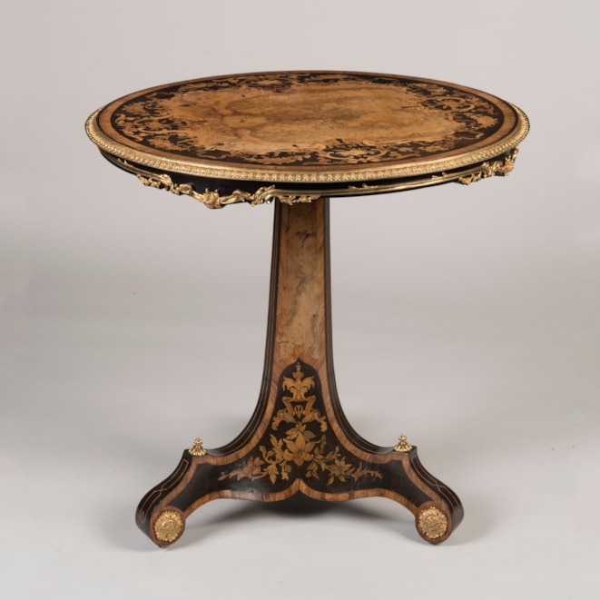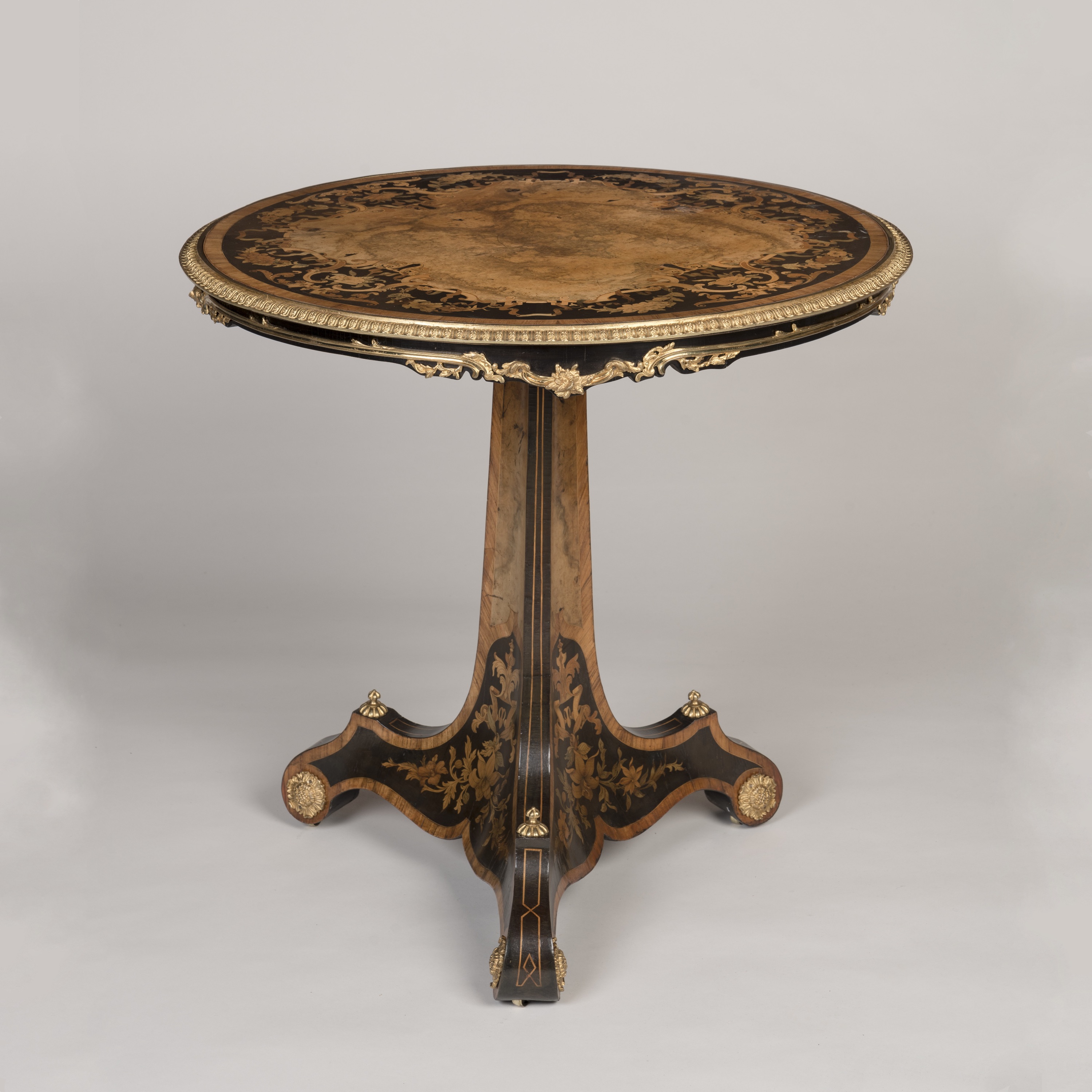 Constructed primarily in burr walnut with tulipwood crossbanding and having many other specimen and stained woods including harewood used in the marquetry work, beautifully heightened with a variety of finely cast gilt bronze mounts. The table rises from tripartite feet of inwardly scrolling form, fitted with concealed brass castors, with ormolu rosettes and pointed finials on each leg, the concave triangulated central column inlaid with flowers. The circular top with a striking bookmatched burr walnut at its centre, surrounded by a reserve with a continuous design of complex marquetry of ribbon-tied flowers on a dark background within an ormolu guard.