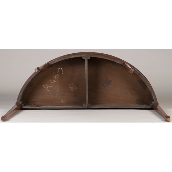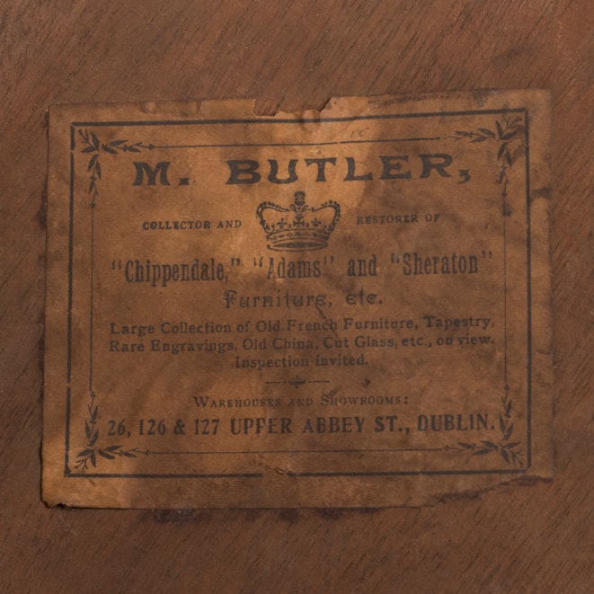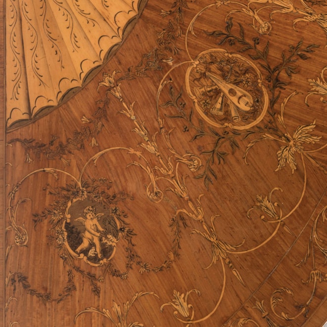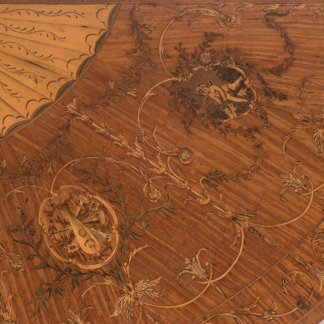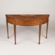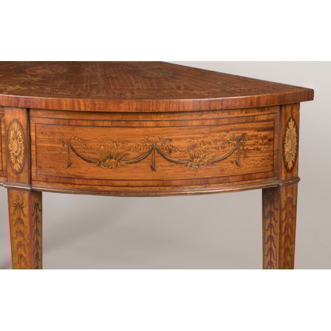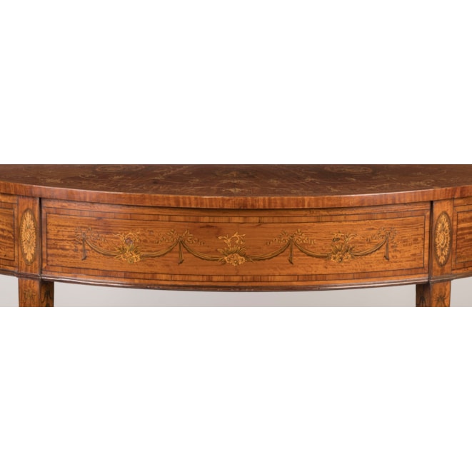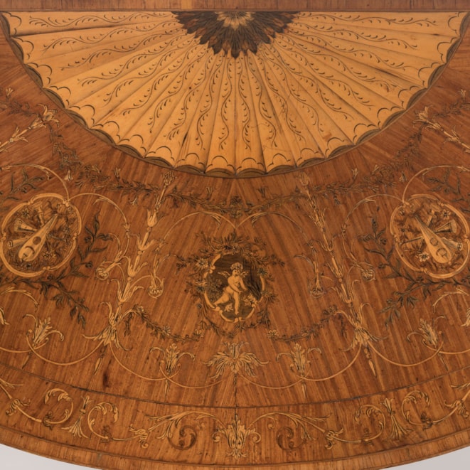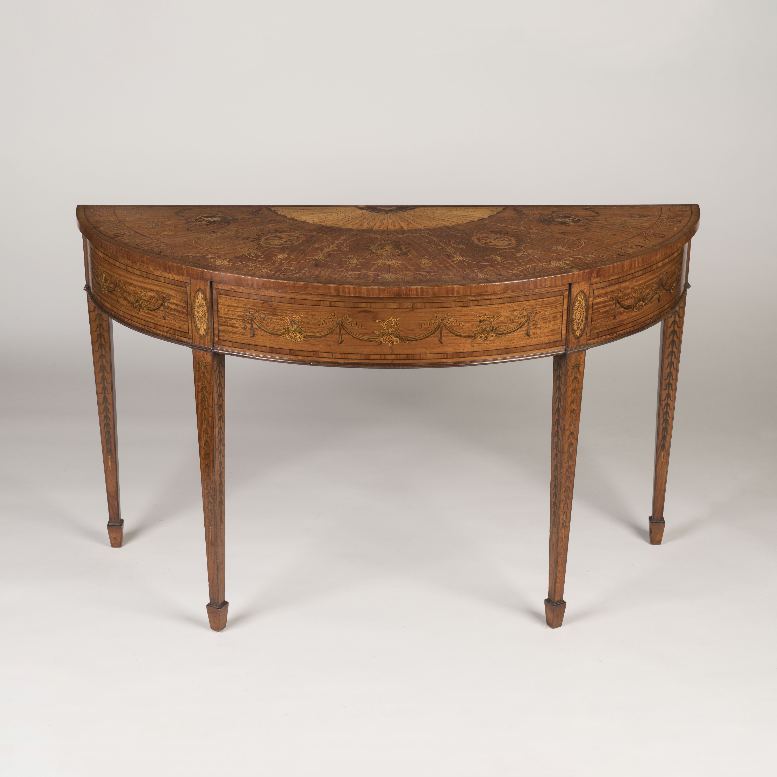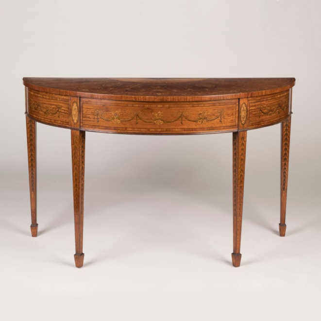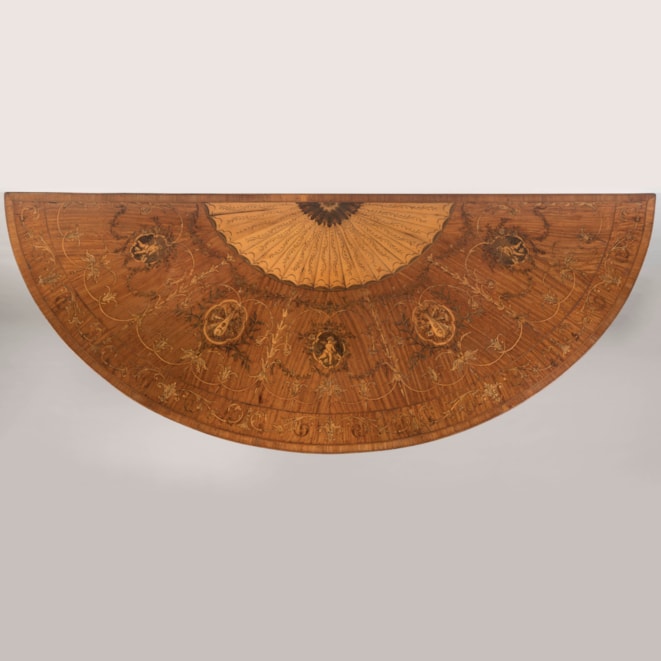 Drawing on the work of the designer Thomas Chippendale, the table of demi-lune outline, constructed in a beautifully figured and grained satinwood, inlaid and cross banded; rising from tapering square legs terminating in spade feet, the legs inlaid with pendant bellflower husks and paterae above; the apron of conforming semi-elliptical shape, crossbanded, with marquetry panels of neoclassical cartouches interspersed with ribbon-tied floral bouquets; the tops having radially laid veneers in a fan shape, with five marquetry oval emblems of musical instruments and cupids surrounded by scrolling foliage. Bearing the retailer's paper label "M. Butler" of Dublin.