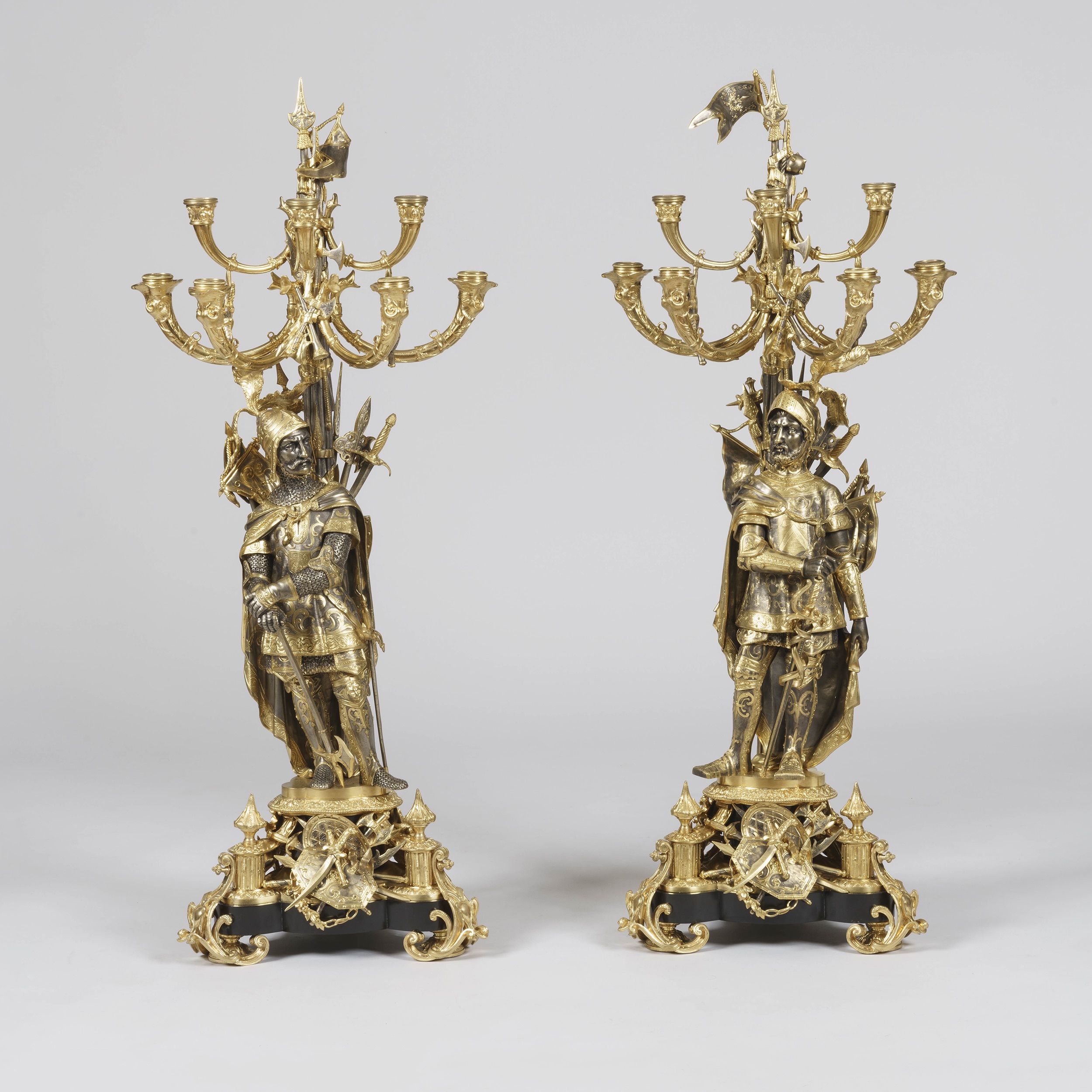 Rising from sumptuous scrolling ormolu tripod bases incorporating a slate support and exquisite military regalia; the chivalrous men, one holding a sword and the other his axe, posing in a noble contrapposto fashion; their armour, faces, and helmets decorated to the highest degree of detail and showing marked differences between the two knights. The seven clustered ormolu branches decorated with further military regalia including axes, swords, and flails, and terminating in a swallowtail emblematic flag.