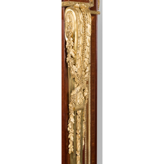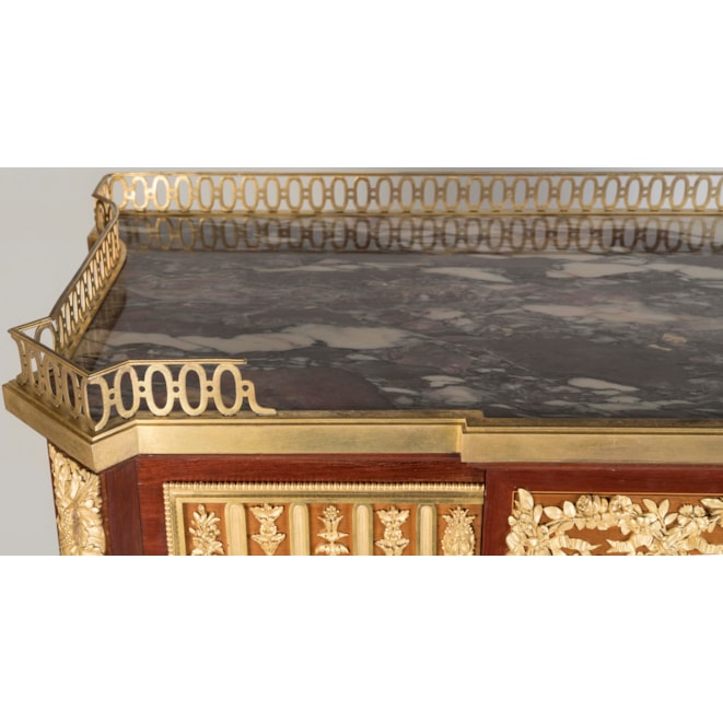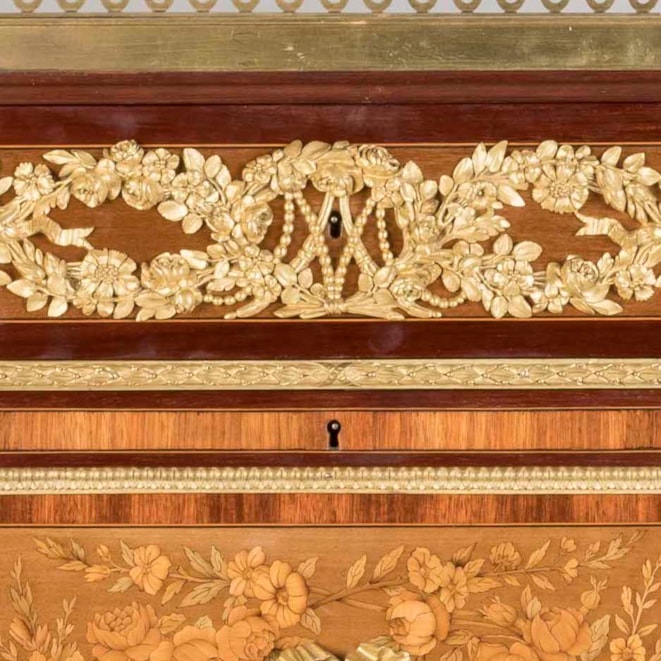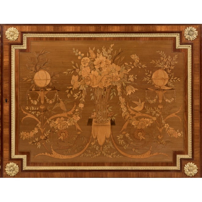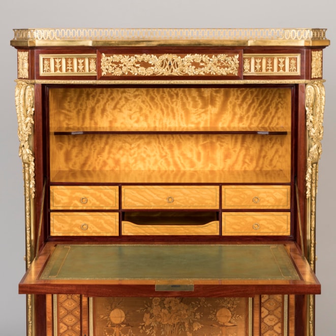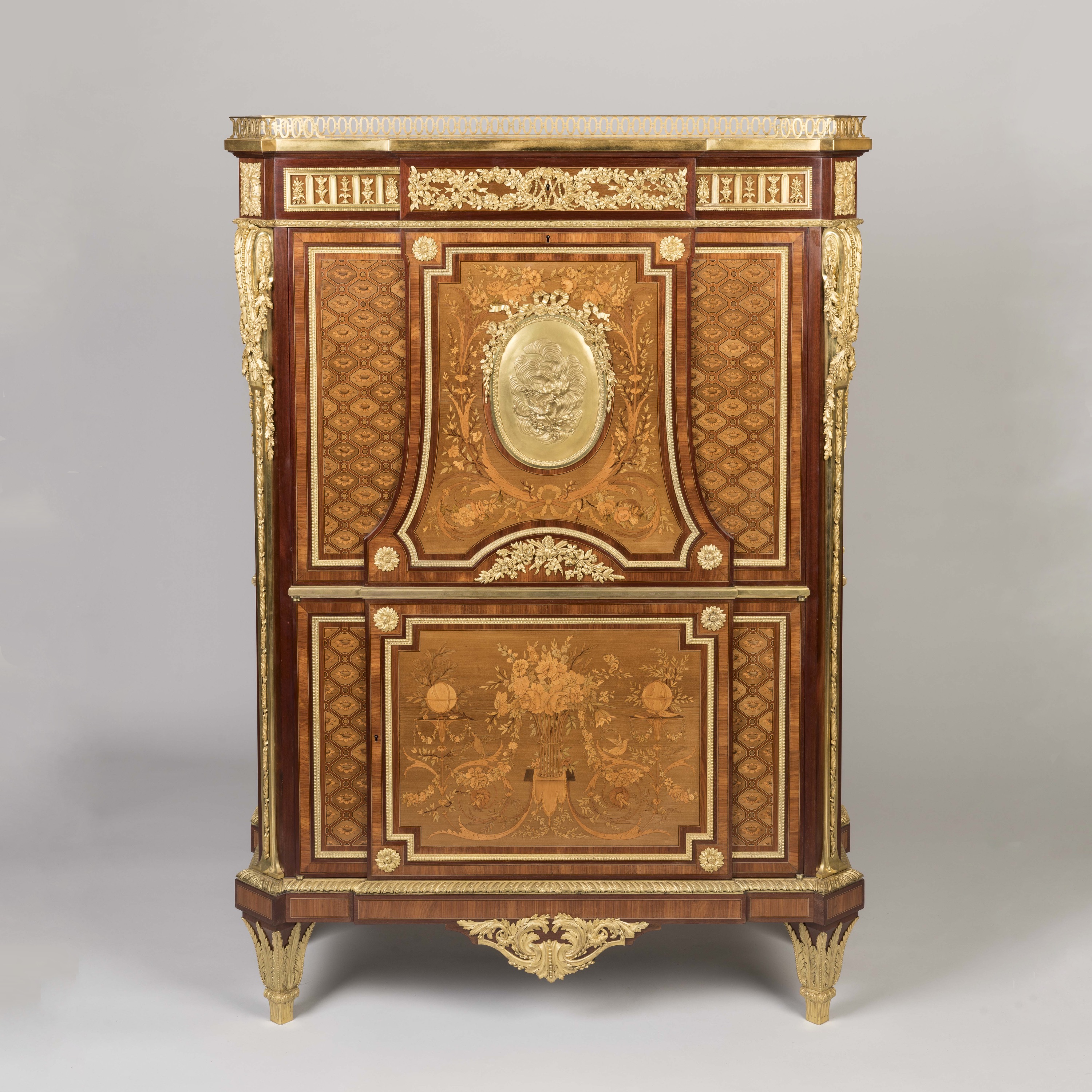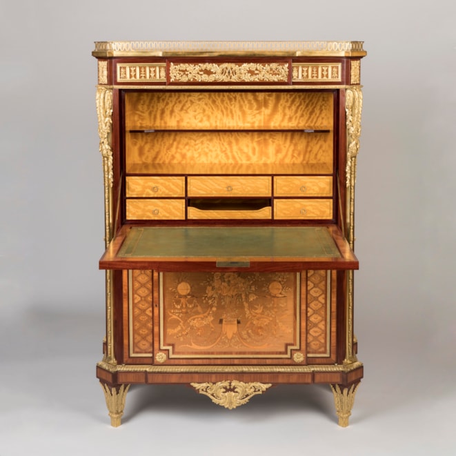 Of upright rectangular form with canted corners and slight breakfront profile, veneered with panels of marquetry executed in various woods and with panels of tulip wood banding and boxwood stringing, all bordered by amaranth, exuberantly dressed with gilt bronze mounts of the highest quality, and having a fleur de pêcher marble top within a plain ormolu band surmounted by a three-quarter pierced gallery. Rising from tapering feet shod with acanthus cast sabots, the lower apron with a strong gilt bronze mount of scrolling foliates; the lower section housing a cupboard behind two panels which together present a symmetrical marquetry composition of scrolling vines that support a draped pedestal with a tall basket overflowing with fruit and flowers at center and a garlanded stand at either side, the left with emblems of Astronomy and the right emblems of Geography; within ormolu cast borders and flanked by Riesener's famous trellis marquetry panels which also adorn the sides of the secretaire. Above, the fall-front panels defined by a trapezoidal marquetry composition of flowers, fruit, and scrolling vines centred on an oval reserve for the principal bronze mount; the marquetry design consisting of two leafy vines, ribbon-tied where they meet, and terminating above in a floral arrangement. The oval relief bronze plaque representing two billing doves against a background of swirling clouds, with Cupid's bow and quiver and a floral garland visible. The interior with a leather writing surface, compartments beautifully veneered in bois citronnier with amaranth banding; an arrangement of two shelves and six drawers. The canted front angles are pilasters, mounted with gilt bronze spandrels, cast as stiff leafed acanthus, having attached sprigs of oak leaves, berries and intertwined forget-me-nots, all within a gilt bronze stepped band. The frieze drawer mounted with a gilt bronze garland of roses, pinks, convolvulus, lilies-of-the-valley, asters and other flowers forming five complete loops, the central one enclosing the initials 'MA' for Marie Antoinette. The lockplate signed by the maker and including his Rue Charlot address, where the firm was located post-1867.