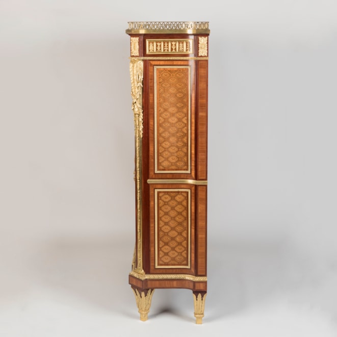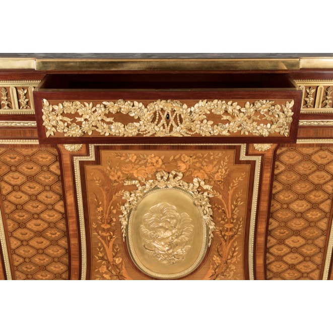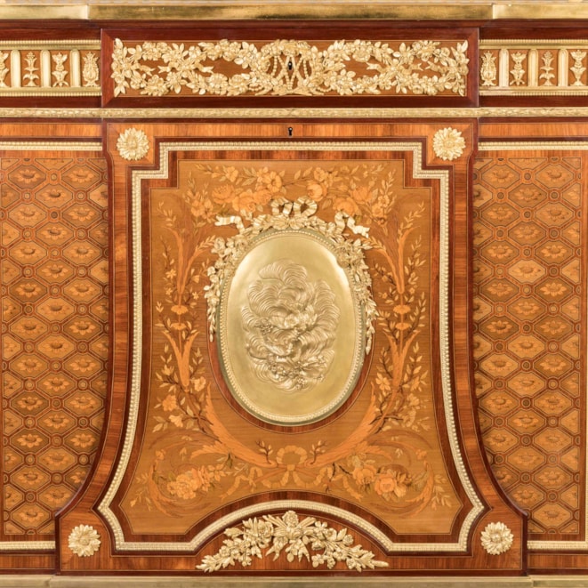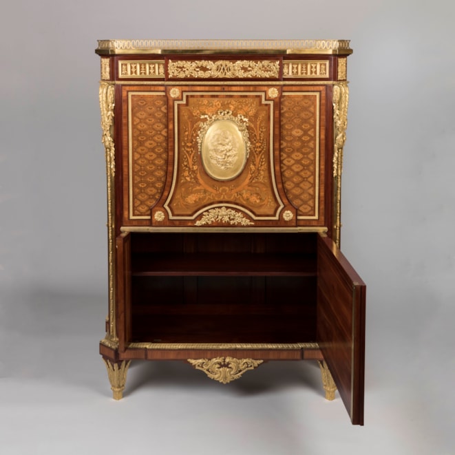 The first cabinet, together with a commode today in the Metropolitan Museum of Art, are “often described as the most famous pieces of eighteenth-century French furniture outside France.” They were made in 1783 for Versailles, and incorporated lacquer panels alongside opulent bronze mounts. Eventually, the commode and secretaire left the royal collections and passed through notable British collections before being acquired by Mrs. William Kissam Vanderbilt for her mansion in New York City.