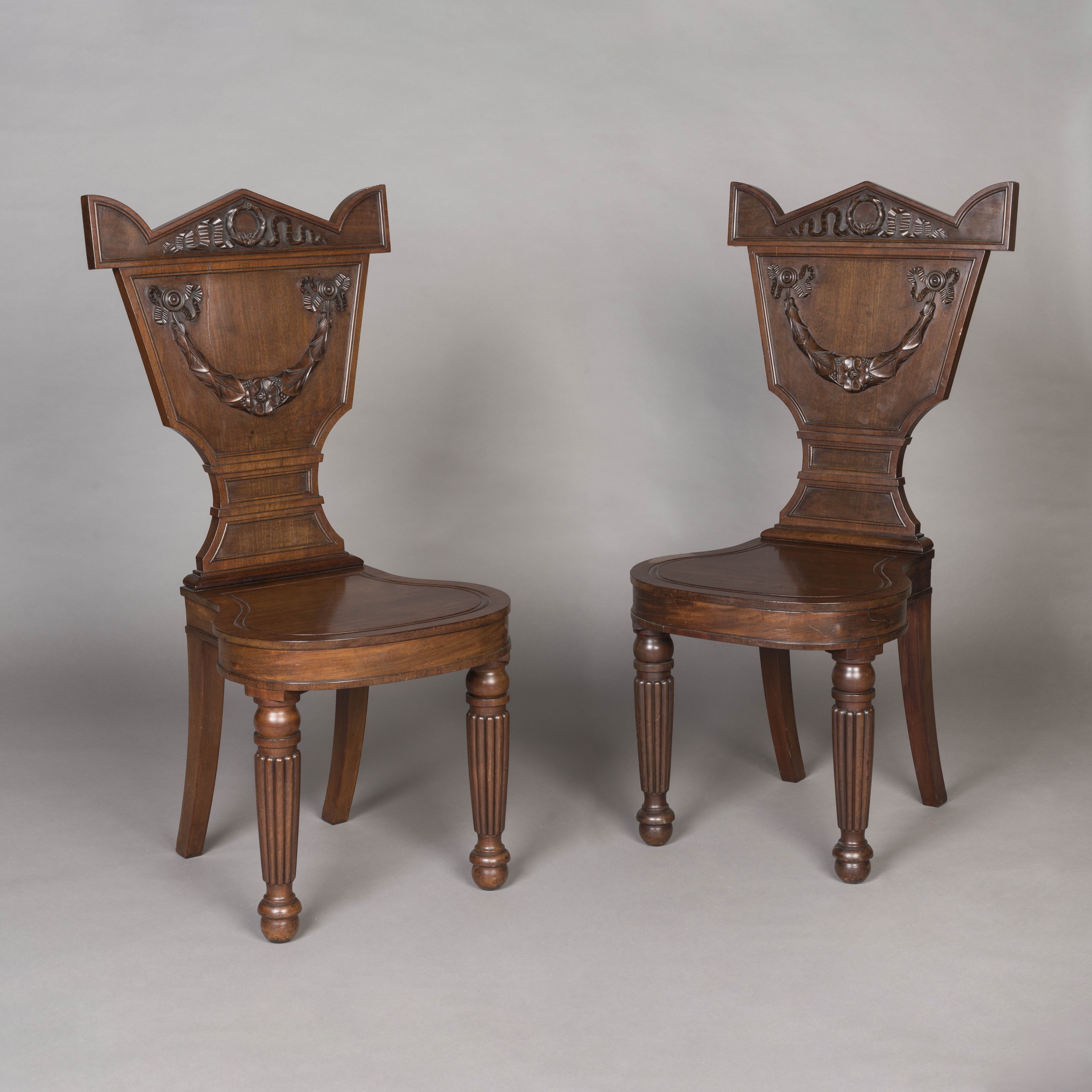 Constructed in mahogany, having beautifully turned and reeded front legs and elegant sabre legs to the rear, the back rest of a most unusual waisted shape and adorned with carved garlands, ribbons, laurel wreaths and English roses. Each stamped "W. Huxley" to the underside.