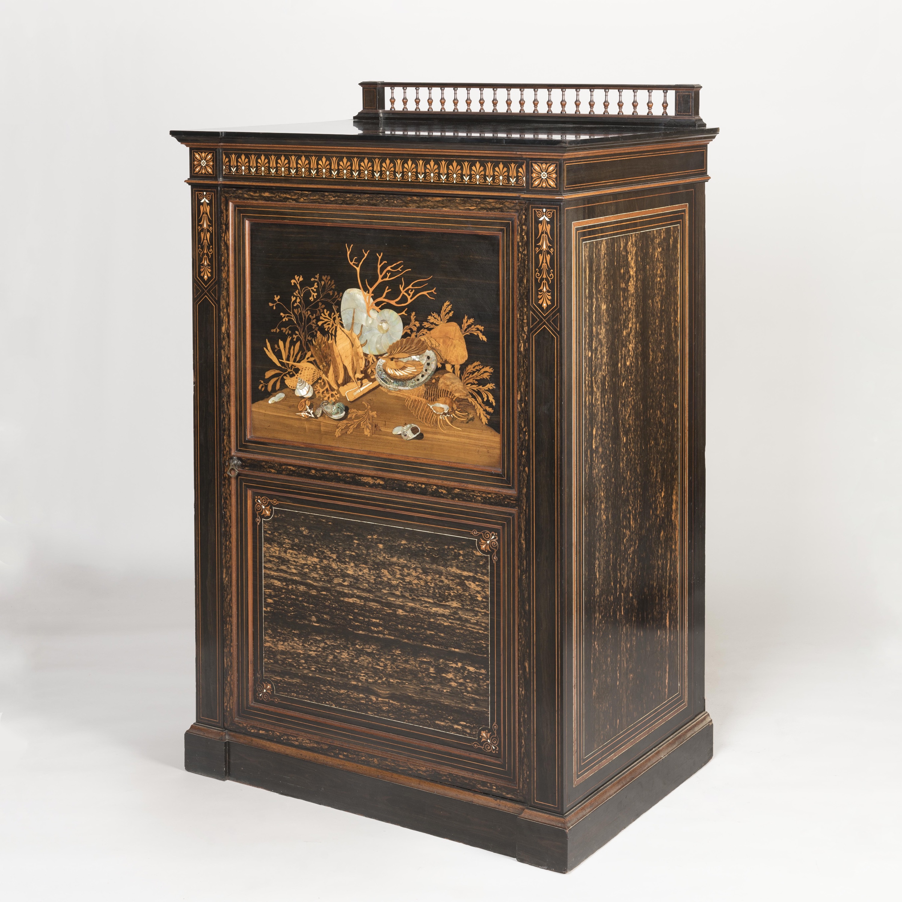 The chest of drawers of rectangular form, constructed in coromandel, with inlays in ebony, boxwood, honeysuckle, mother-of-pearl, abalone, and a host of specimen woods; on a plinth support, the front and sides with large fields of costly coromandel, demarcated with stringing, the pilastered corners and frieze decorated with geometric foliate motifs of lotus, palmettes, and roses taken from the designs of Owen Jones, the large door set with a marquetry still-life composition executed with extreme skill, depicting shells, seaweed, conches and coral; opening to reveal a satinwood-veneered bank of eleven graduated drawers with brass handles and drawer tags, fully mahogany lined. The Chubb patent lock bearing a serial number corresponding to roughly the years spanning 1875-1880.
