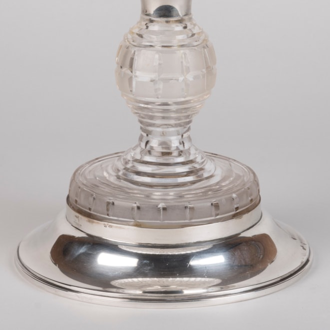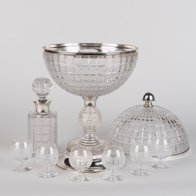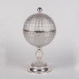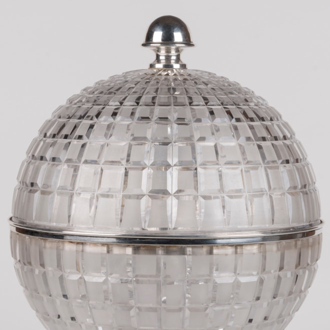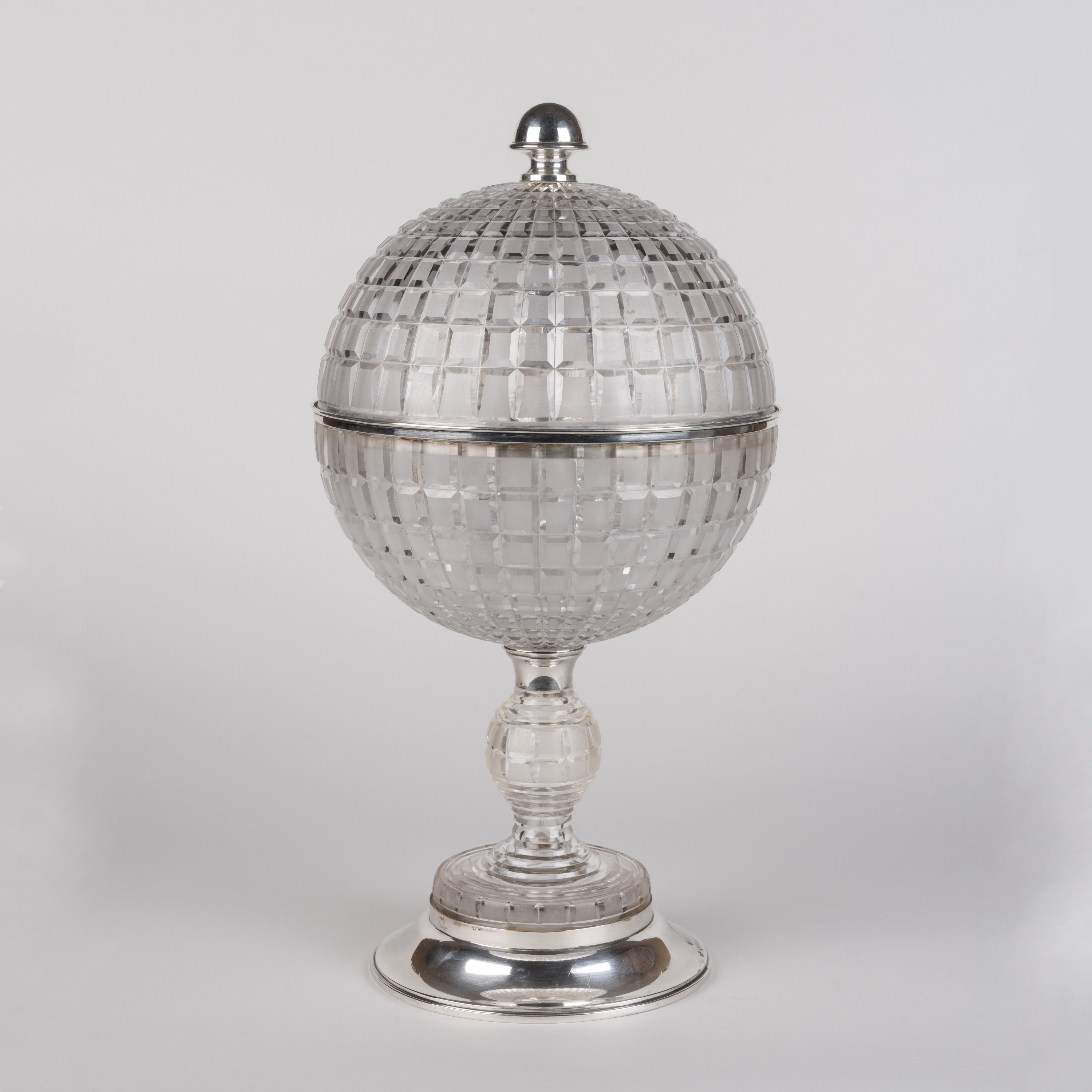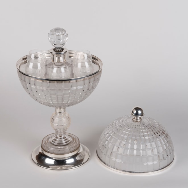 With hallmarked solid silver fittings, the crystal globe supported on a circular foot and stem, the lid opening to reveal the interior designed to house the carafe and six glasses. Bearing Barcelona hallmarks and the fineness mark for high purity content.