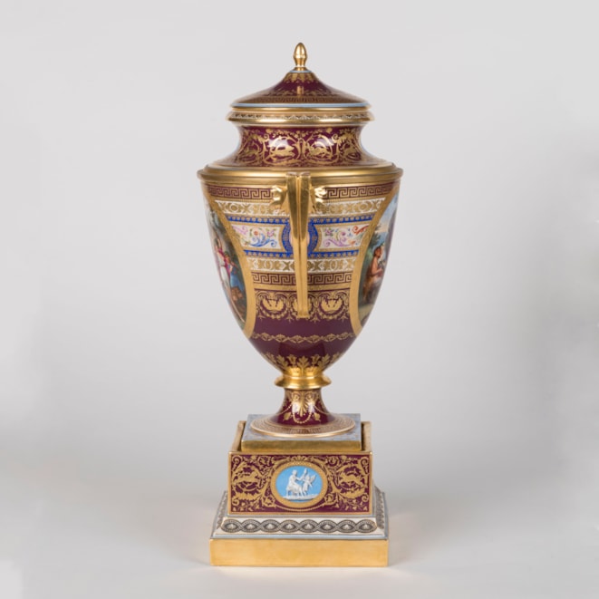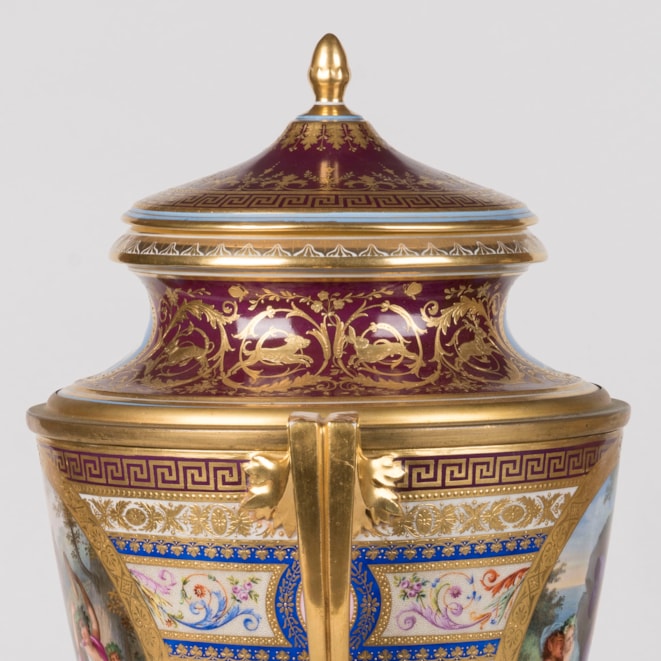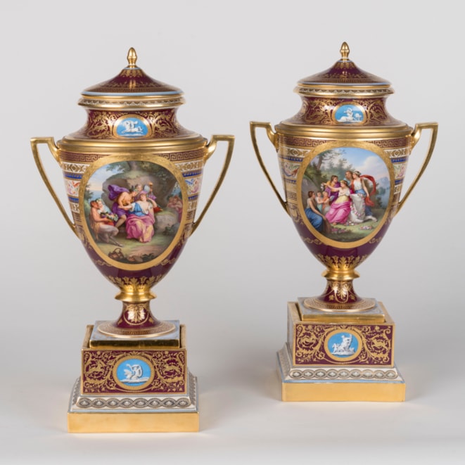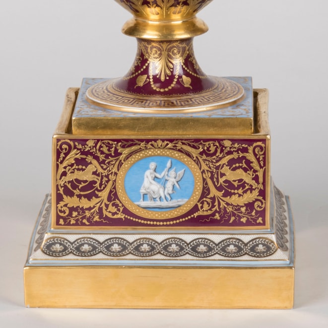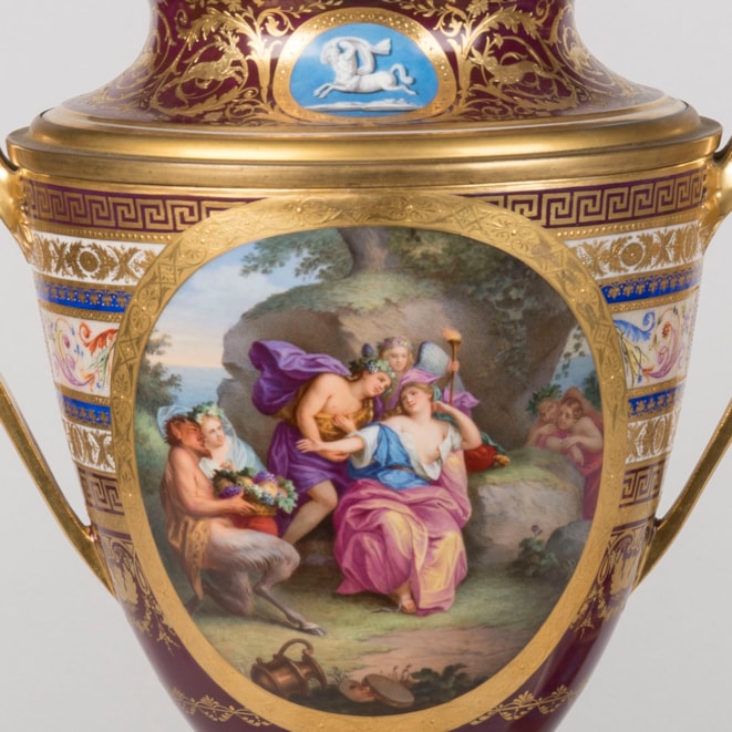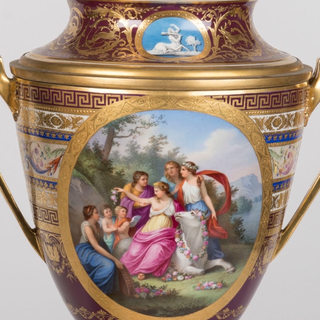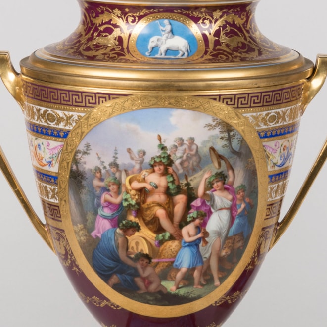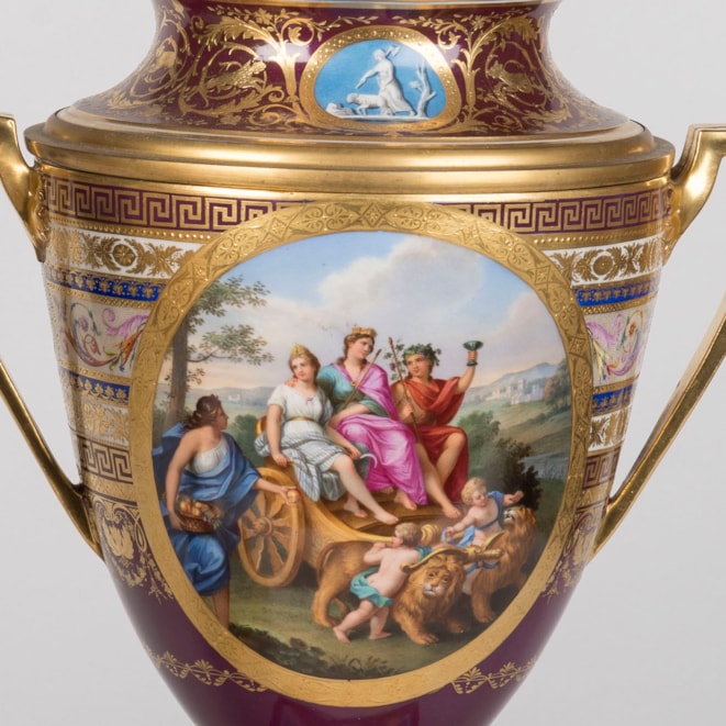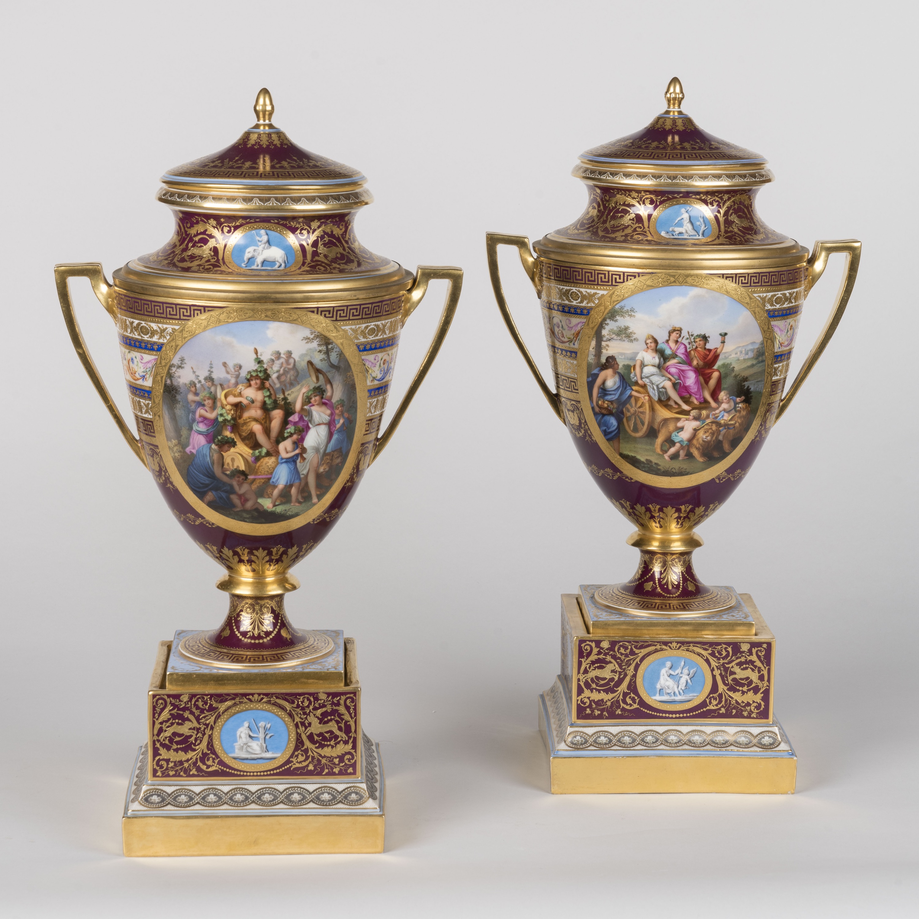 The decoration of the vases is outstanding: the four medallions representing neoclassical mythological scenes of Bacchus, Ceres, Ariadne and Europa surrounded by intricate motives "a grottesca" in vibrant colours and raised gilding.