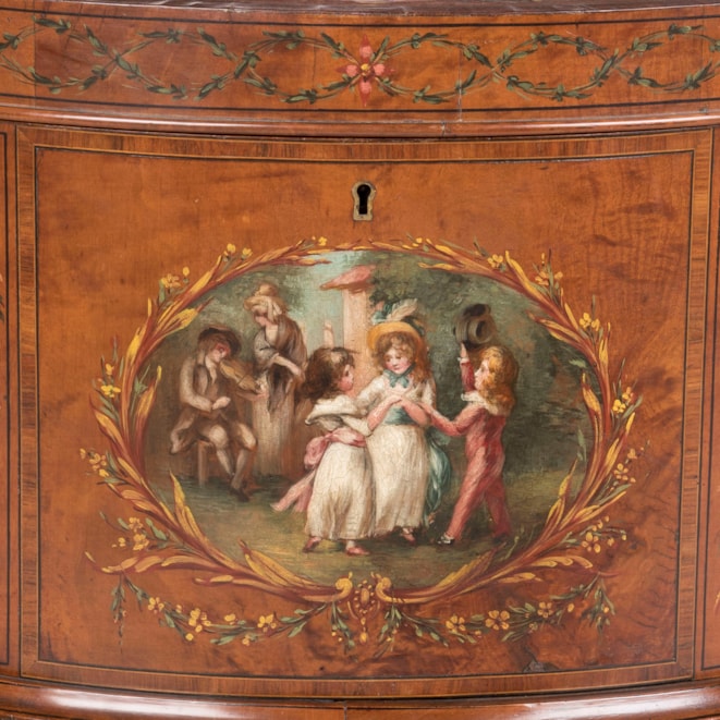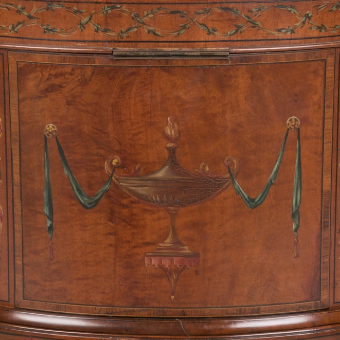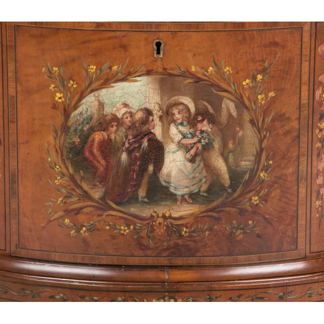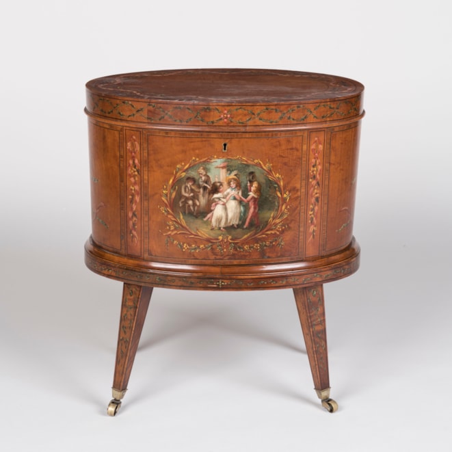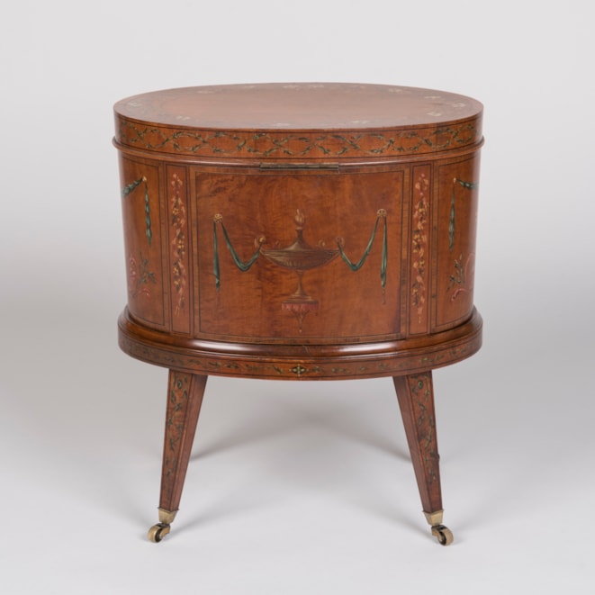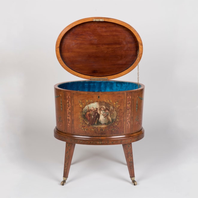 Of elliptical form, constructed in Satinwood, hand painted with floral attributes, and 'Angelica Kauffman' style cartouches of le beau monde, in polychromes; rising from castor shod tapering and splayed legs which conjoin the bodies; the lockable hinged lids reveal fitted interiors.