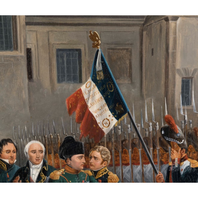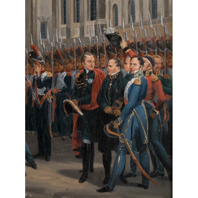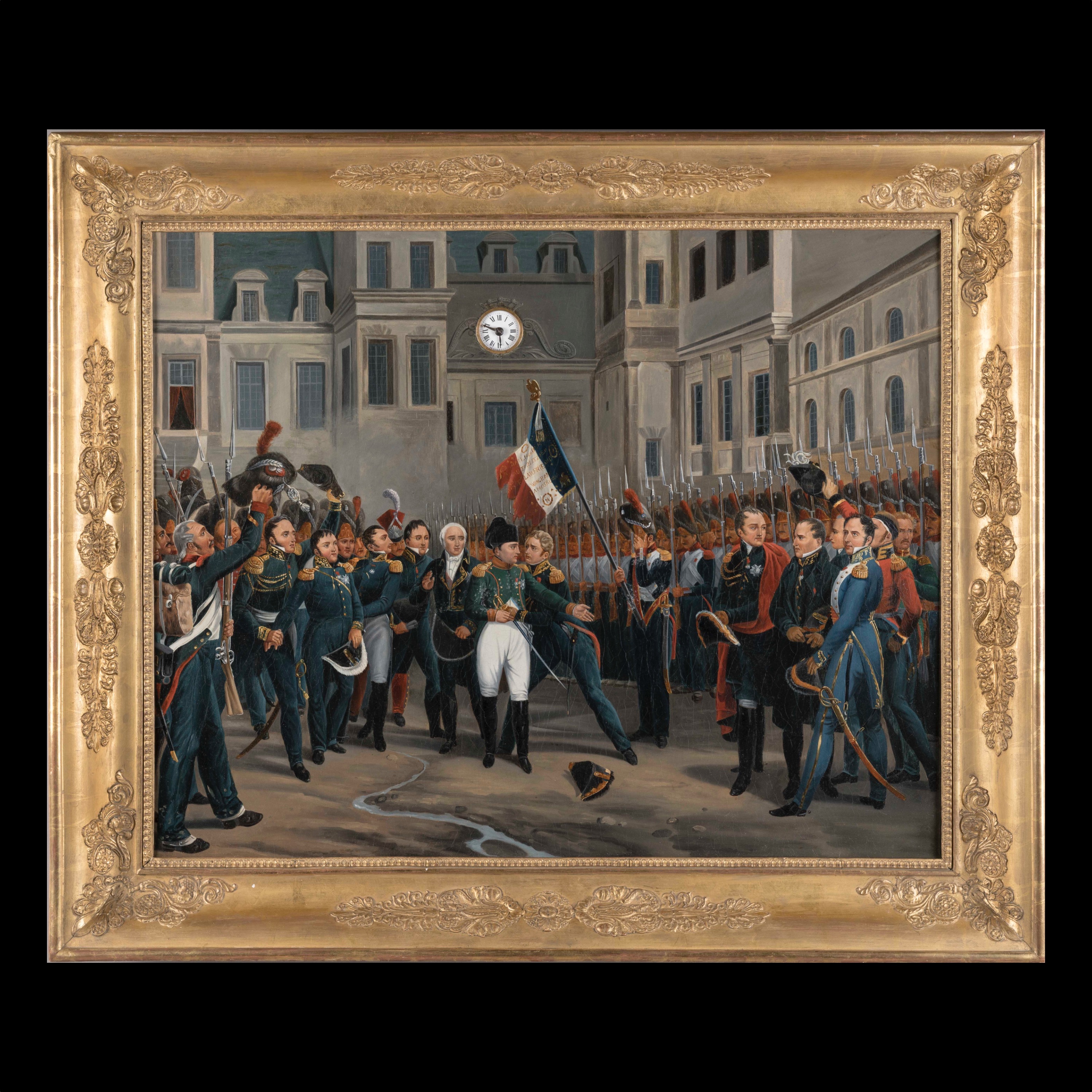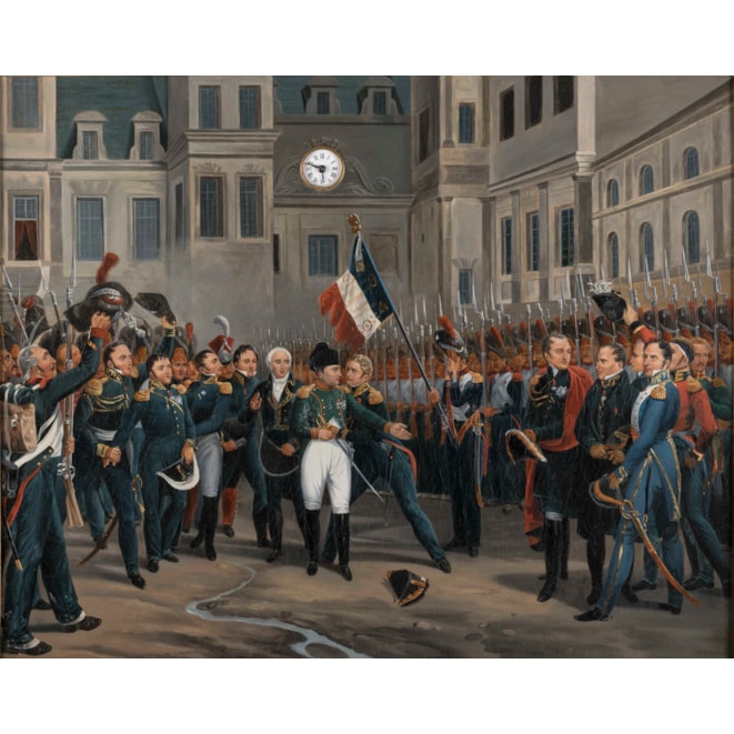 Several versions of "Les adieux de Fontainebleau, 20 avril 1814" based on Vernet's are known, including one residing at the Château de Versailles. Standing in the courtyard of Fontainebleau, the Emperor is saying his final goodbyes following his abdication on his way to the island of Elba. Napoleon would return to France within the year and resume his leadership.