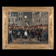 Based on the original work of Horace Vernet "Goodbyes at Fontainebleau," the painted canvas fitted with a circular enamelled clock face with Roman numerals, connected to a twin train movement and a music box, fitted within a French empire style giltwood frame.