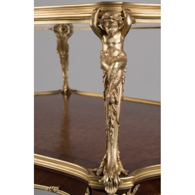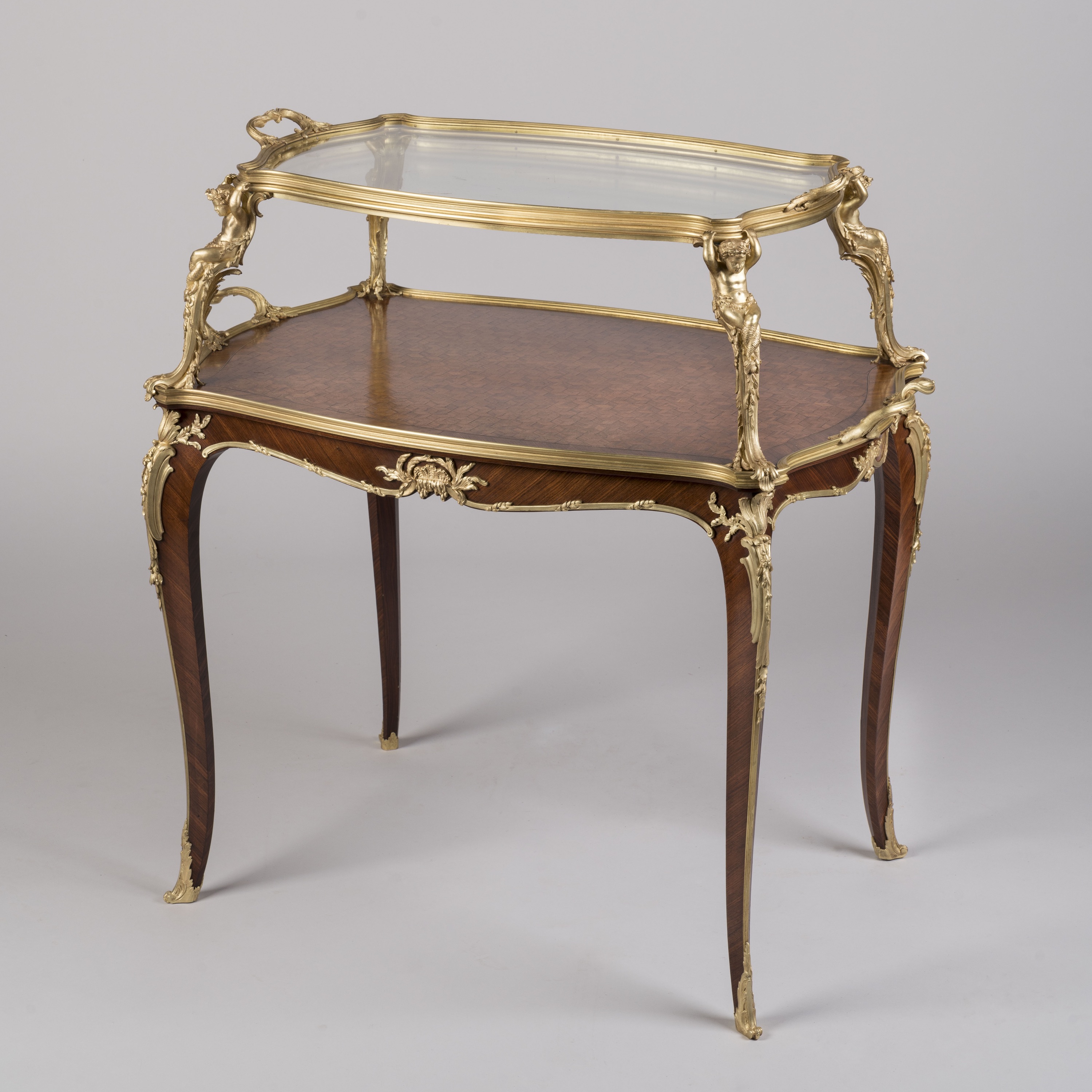 The serpentine dual-handled upper-tier with removable glazed tray supported by four gilt bronze putti tritons, the kingwood lower-tier inlaid with cube satiné parquetry, above a shaped frieze centred to the front and reverse with a characteristic crab-like acanthus scallop shell mount, flanked with foliate and shell cast encadrement on cabriole legs tapering to scrolled sabots. The back of the shell mount incised with makers initials "F.L."