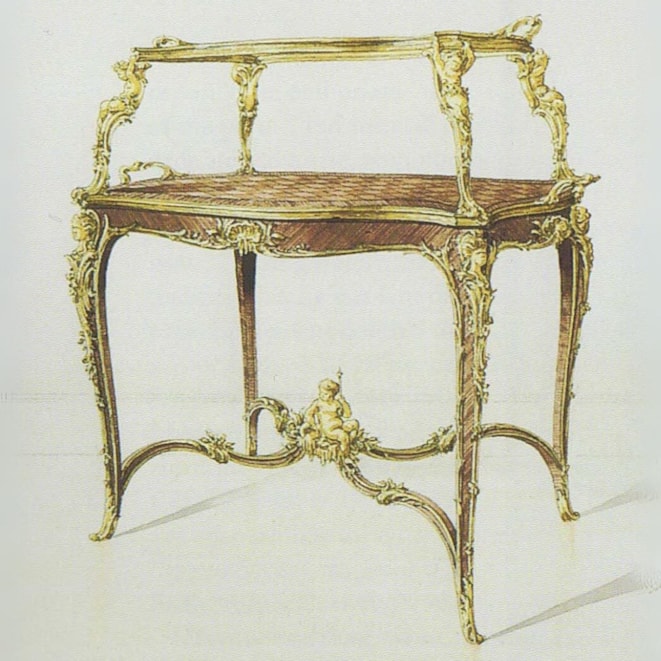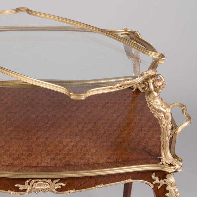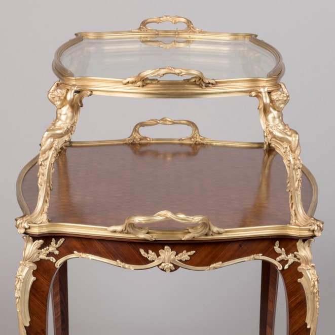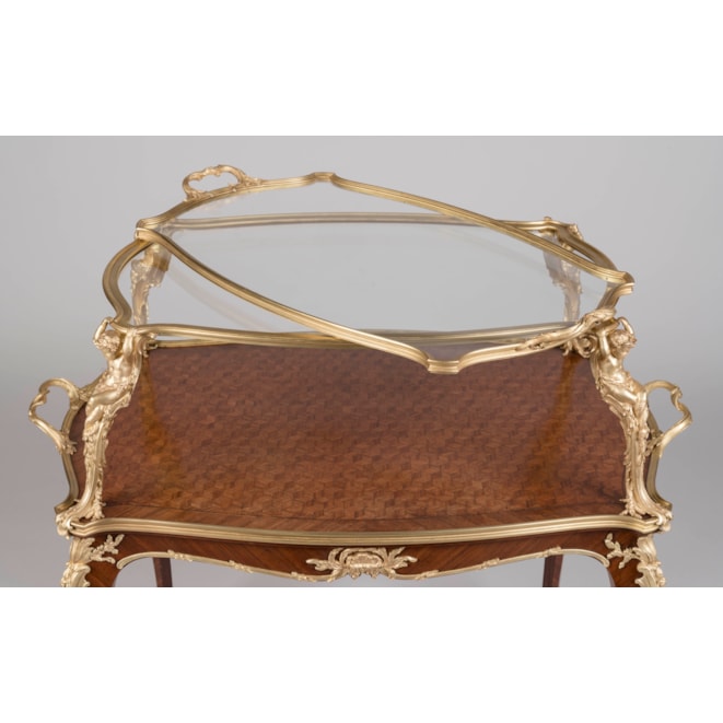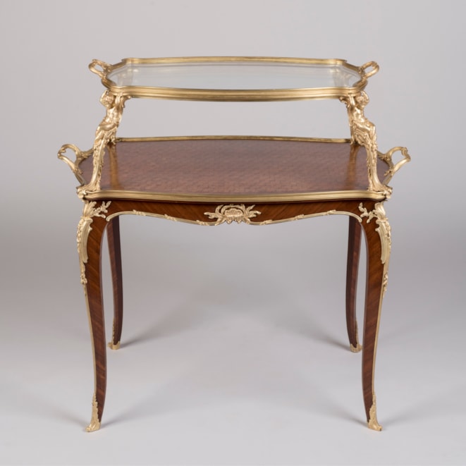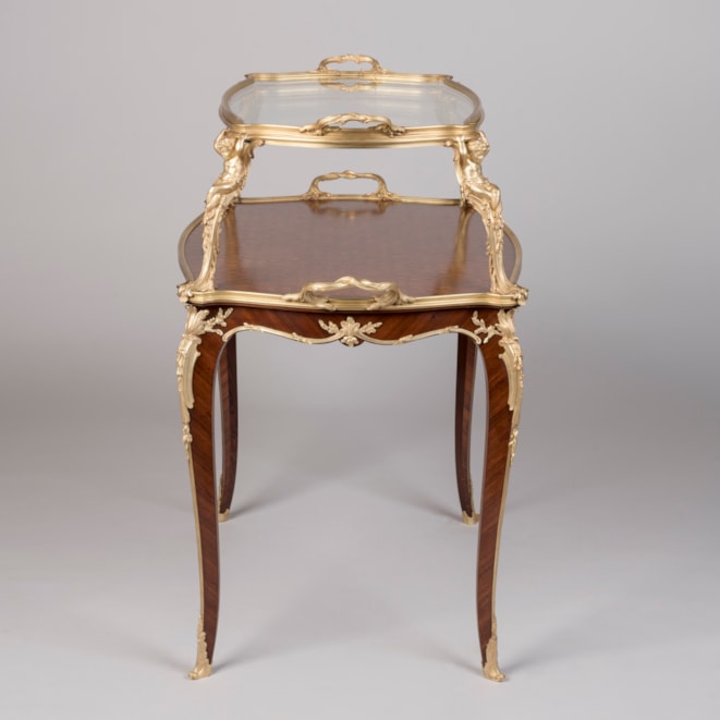 One of François Linke's signature pieces, this model of étagère table can be found in Linke's archives as index No. 610. He exhibited the prototype of this model at the 1900 Paris Exposition Universelle, which employs identical supporting mounts as well as the signature crab-like acanthus mount designed by Leon Messagé. Eleven of these tables à thé are recorded within Linke's archives. He exhibited subtle variants at the Salon des Industries du Mobilier in Paris in 1902 & 1905, as well as a model with slightly different mounts to the legs at St Louis in 1904 and in Liège in 1905. An acclaimed model, the table à thé often displays the same twin-handled ormolu and glazed tray top, and mounts designed by Léon Messagé.