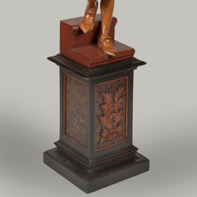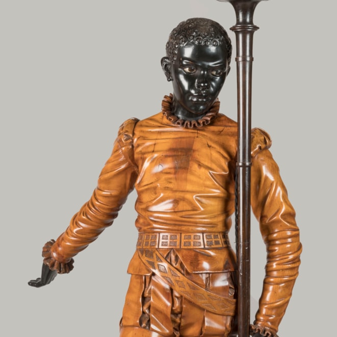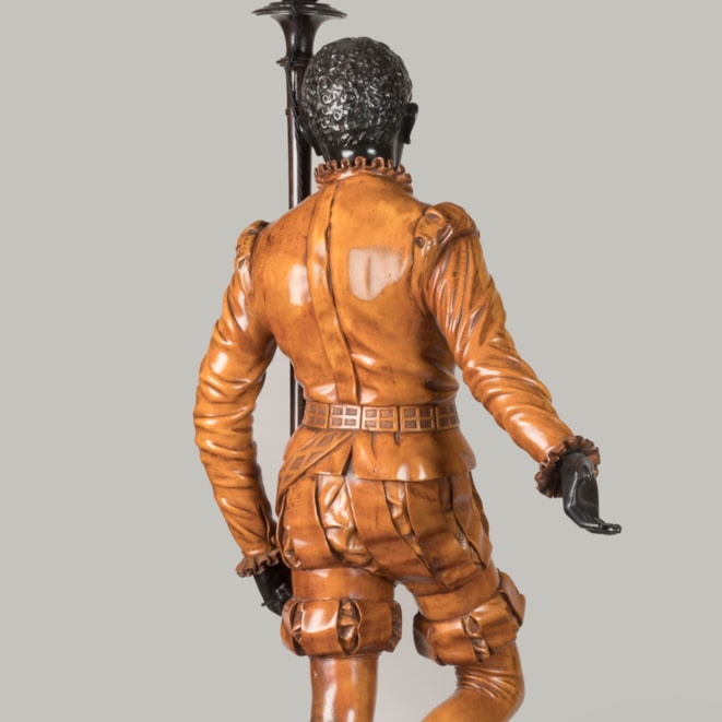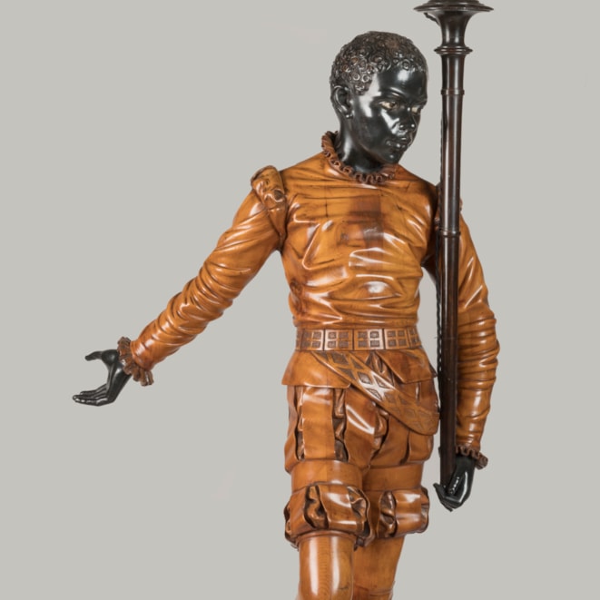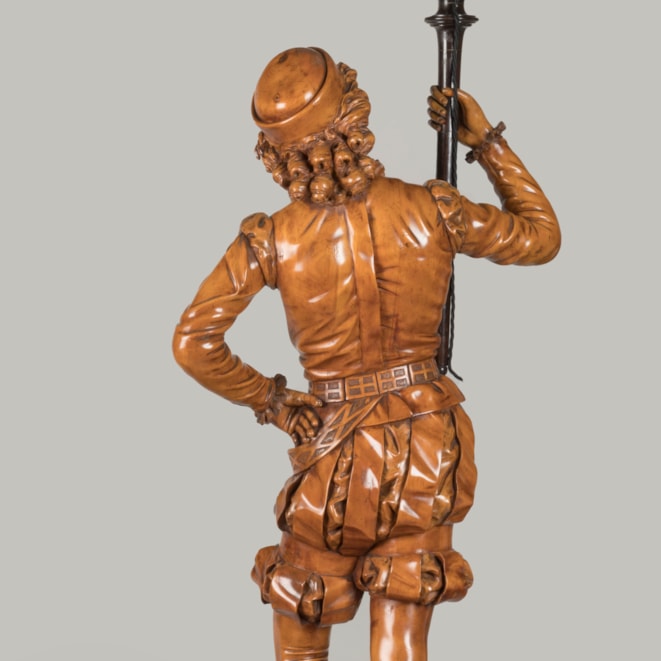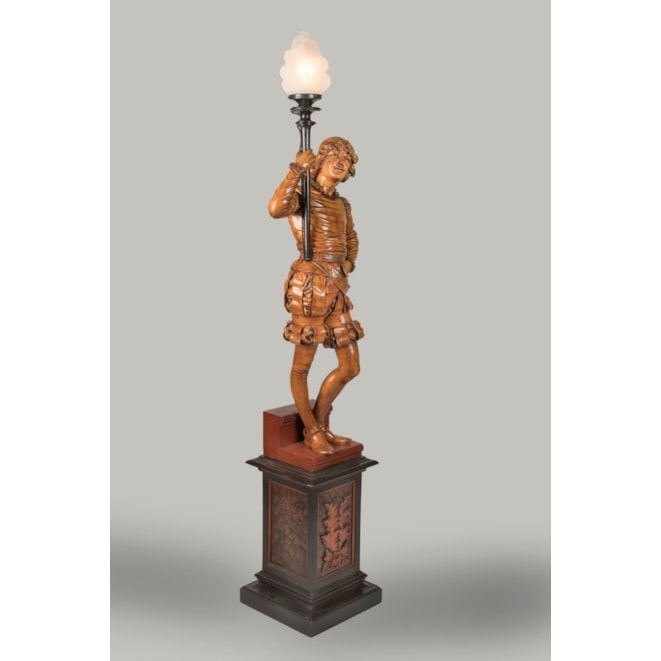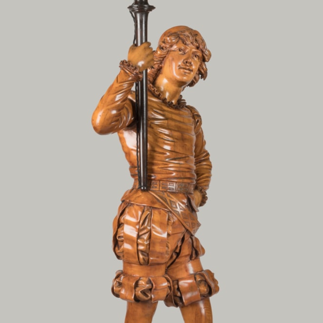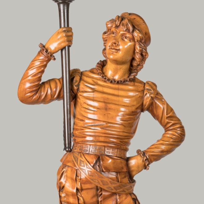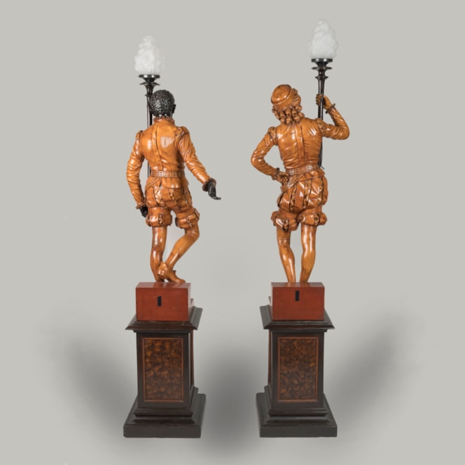 Of solid carved pine, waxed, blackened and beeswax-polished throughout. Each figure carved with virtuosic realism, wearing identical Renaissance style garb complete with slashed breeches and ruffs, both in contrapposto and bearing a torch. Supported on rectangular pedestals adorned with carved foliage.