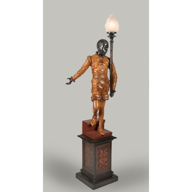 These impressive carved figures are in the style of Andrea Brustolon, one of the greatest carvers of the Italian Renaissance. These 19th century figures are illustrative of the revival of the Italian Renaissance tradition, when artists such as Besarel responded to the demand for luxurious décor.