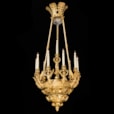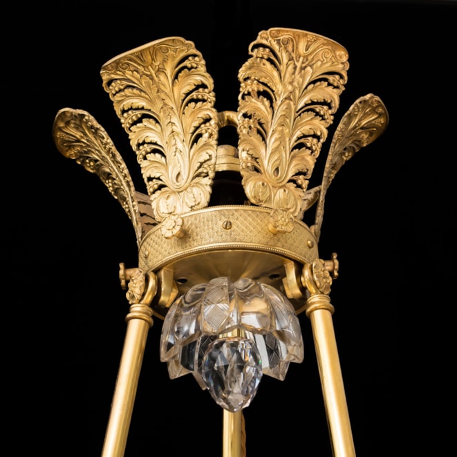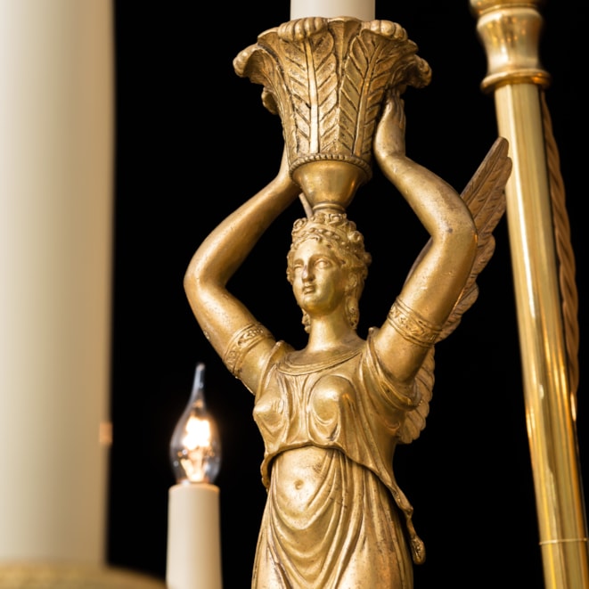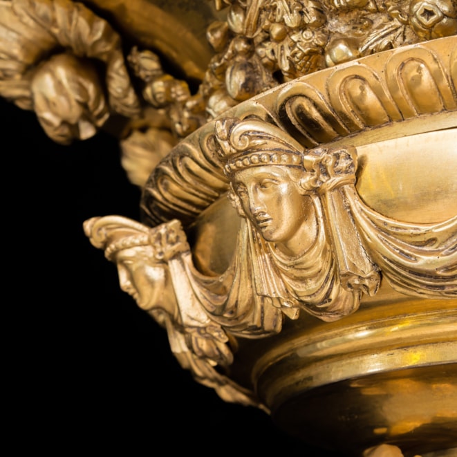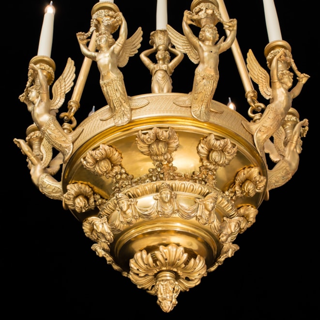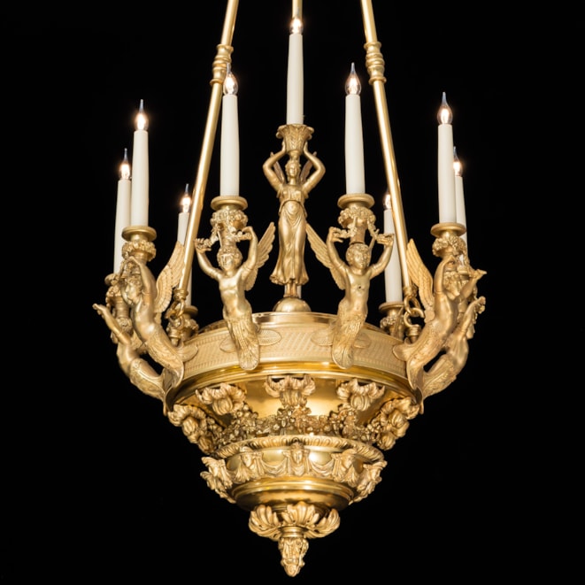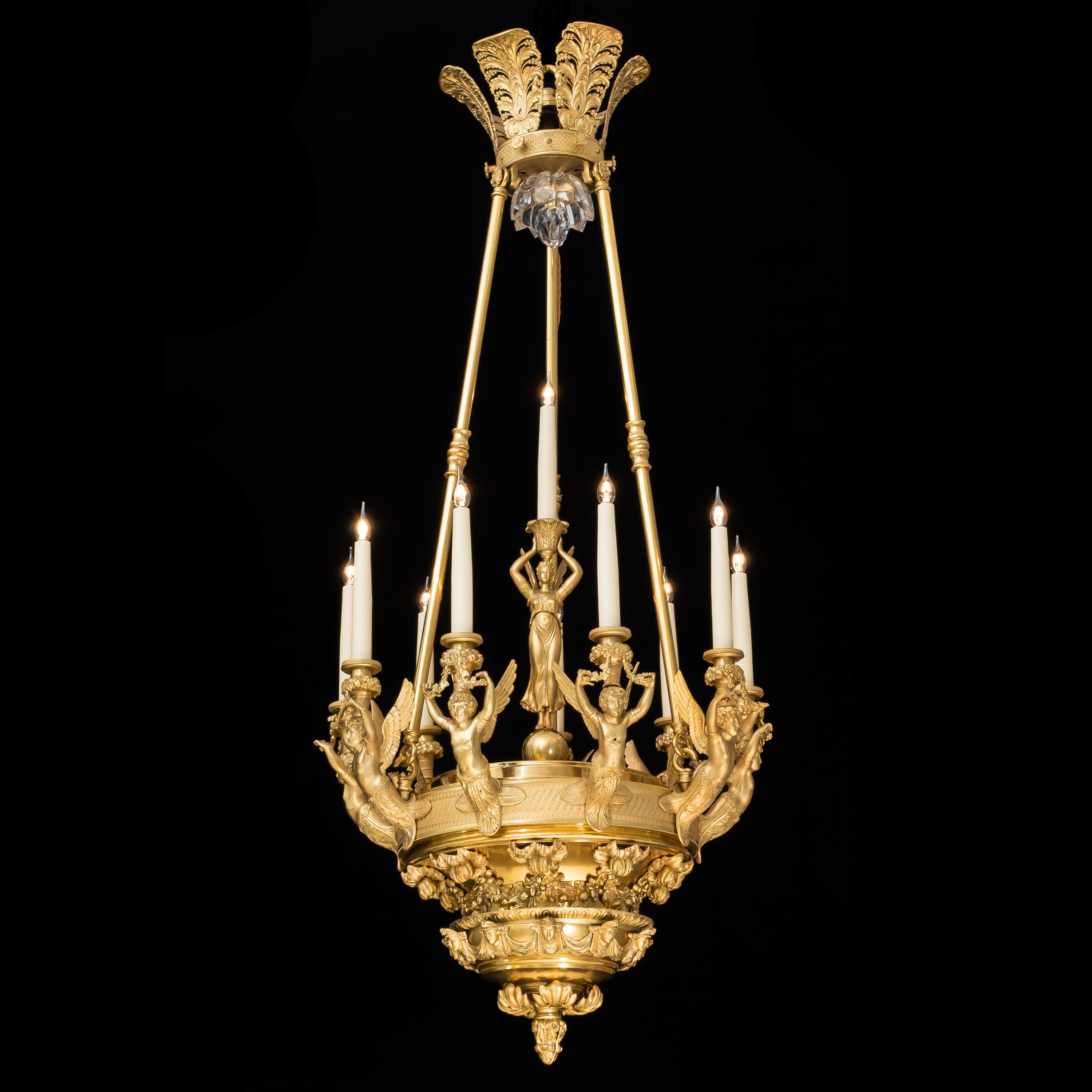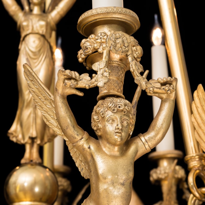 Constructed from gilded bronze, with hand-chased details and burnished highlights, the chandelier composed of a central dish inspired by an Ancient Roman oil lamp adorned with floral garlands and ribbon-tied masks having nine arms modelled from winged amorini and a neoclassical goddess at the centre; suspended from three rods issuing from an acanthus-clad corona with crystal ornament.