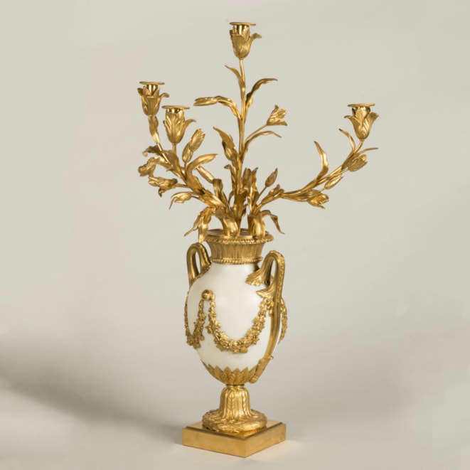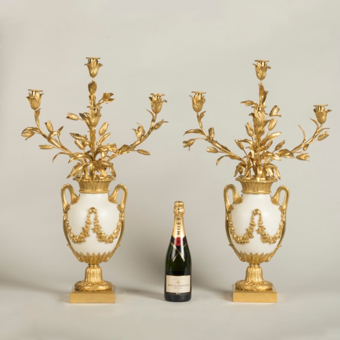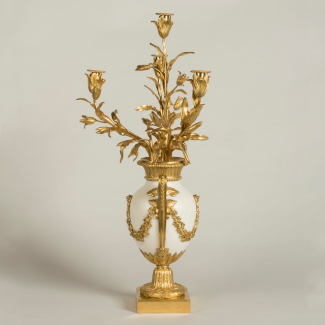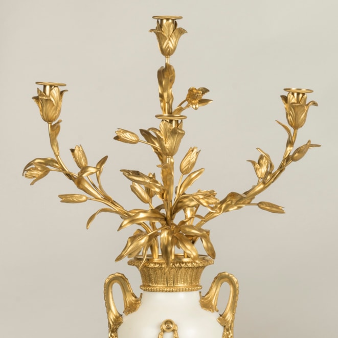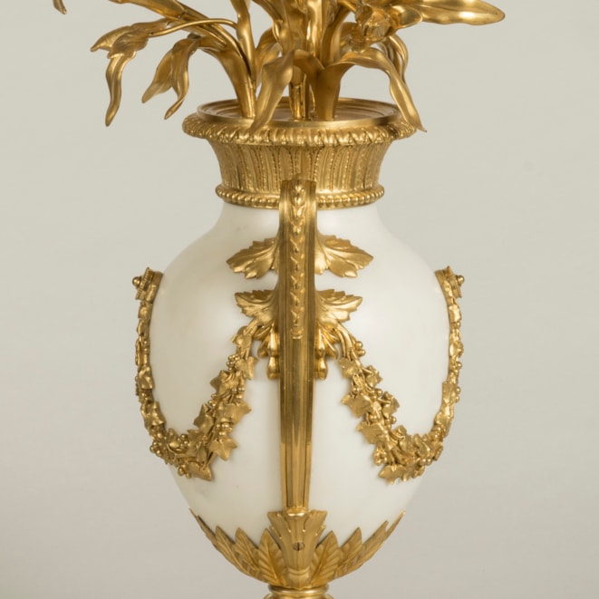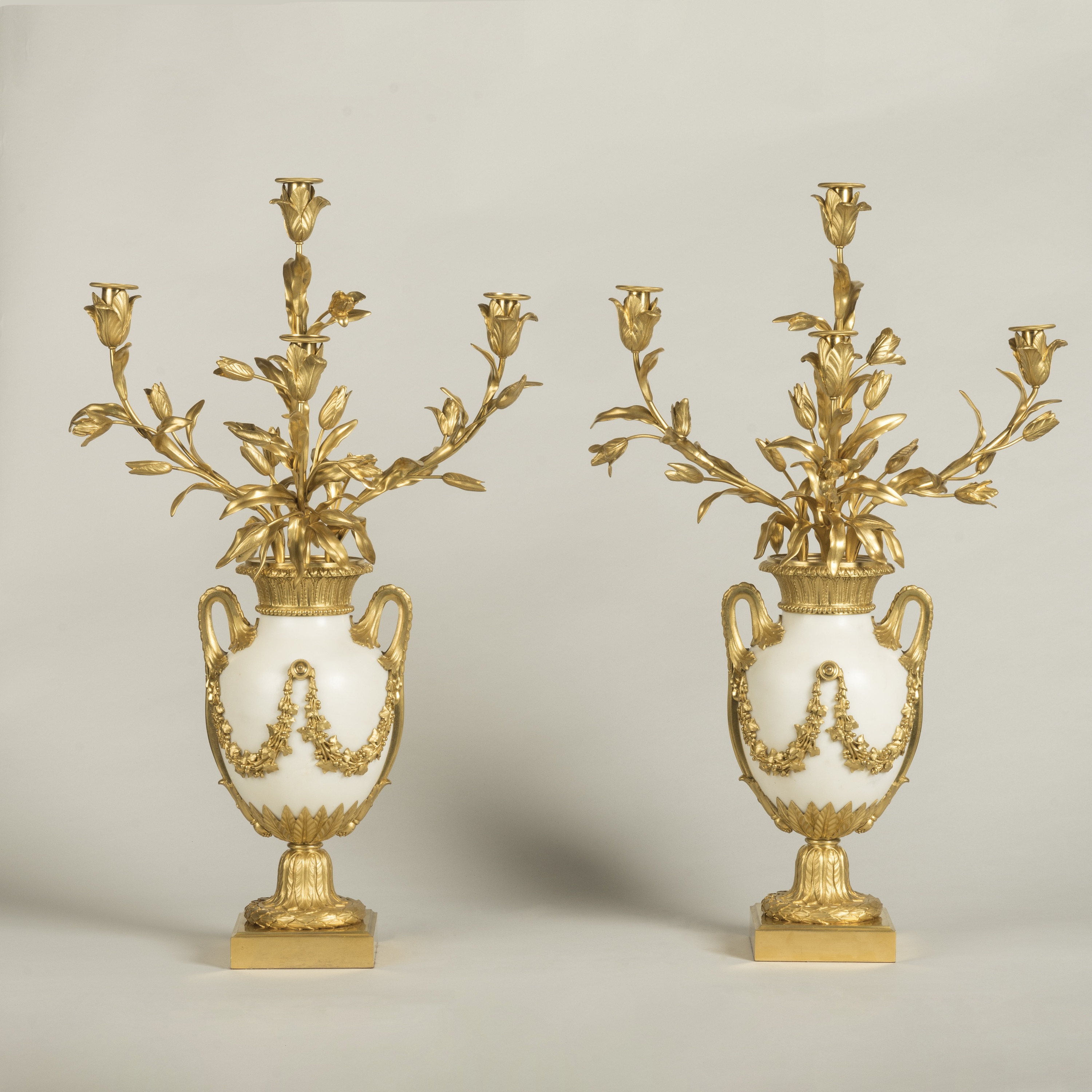 Constructed from Carrara marble with mercury gilded mounts, the vases are supported on square bases with laurel-wreathed socles; the marble ovoid bodies with ormolu foliate twinned handles and floral festooning; each candelabrum issuing a gilded bouquet of flowers with three candleholders.