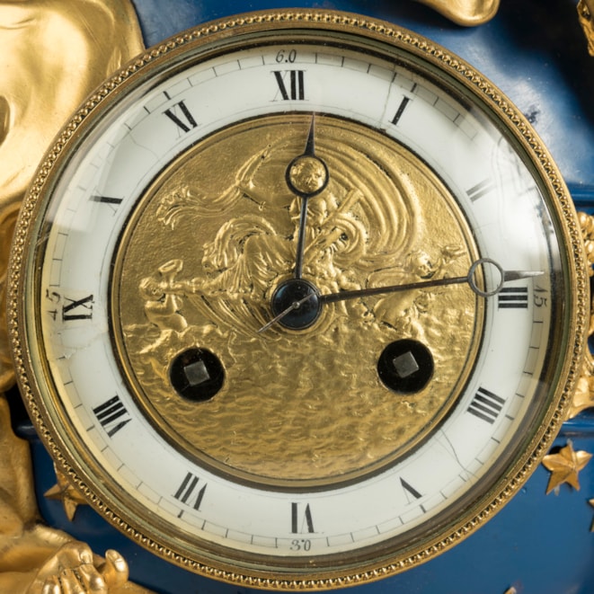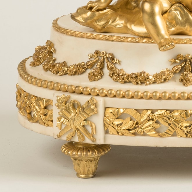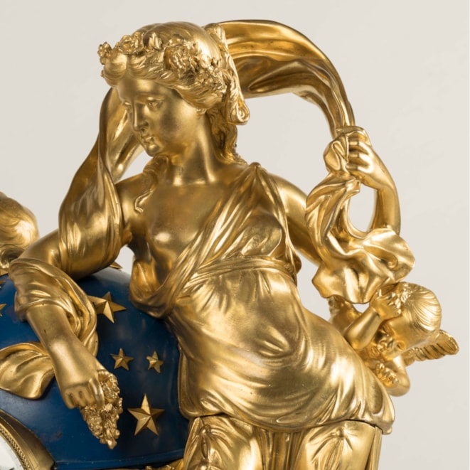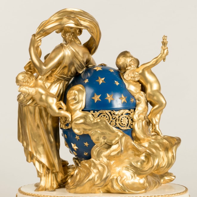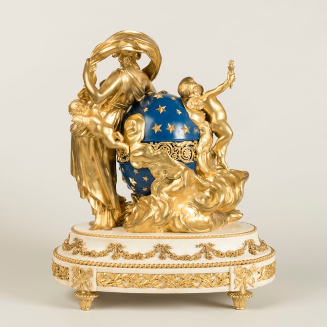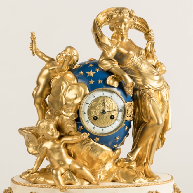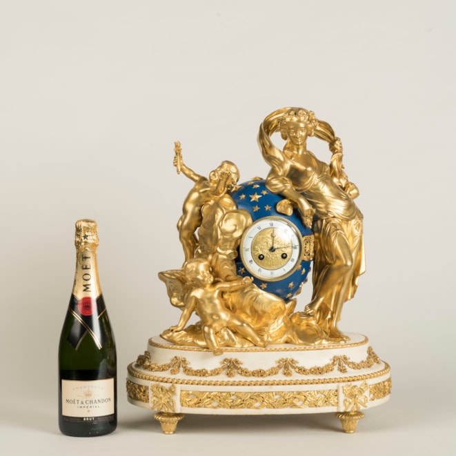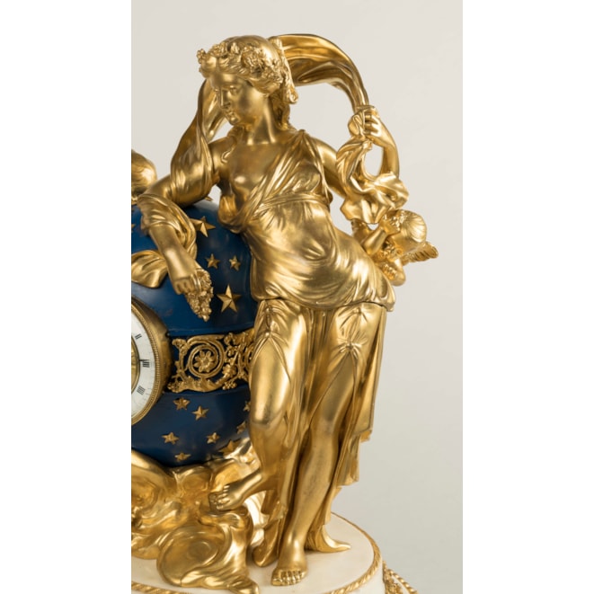 Constructed from a marble platform with a bronze group above; all confidently dressed with exquisite hand-chased and mercury gilded ormolu mounts, rising from three toupie feet, the oval platform with floral swags and emblems of Love; above, the ormolu figural group consisting of a Classical maiden and her two cherubs among swirling clouds; surrounding a blue and gold-star studded globe set with an annular dial demarcating the hours in Roman numerals, housing the movement.