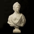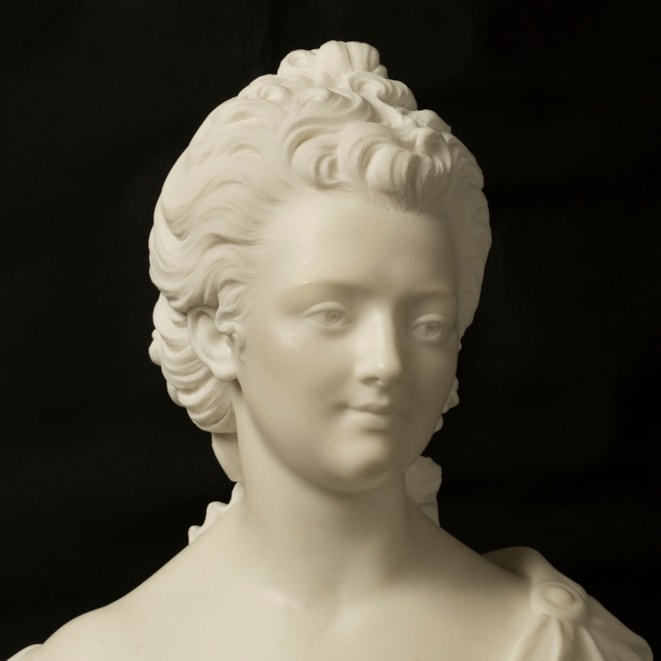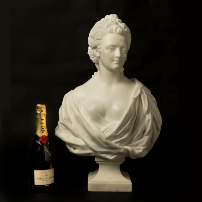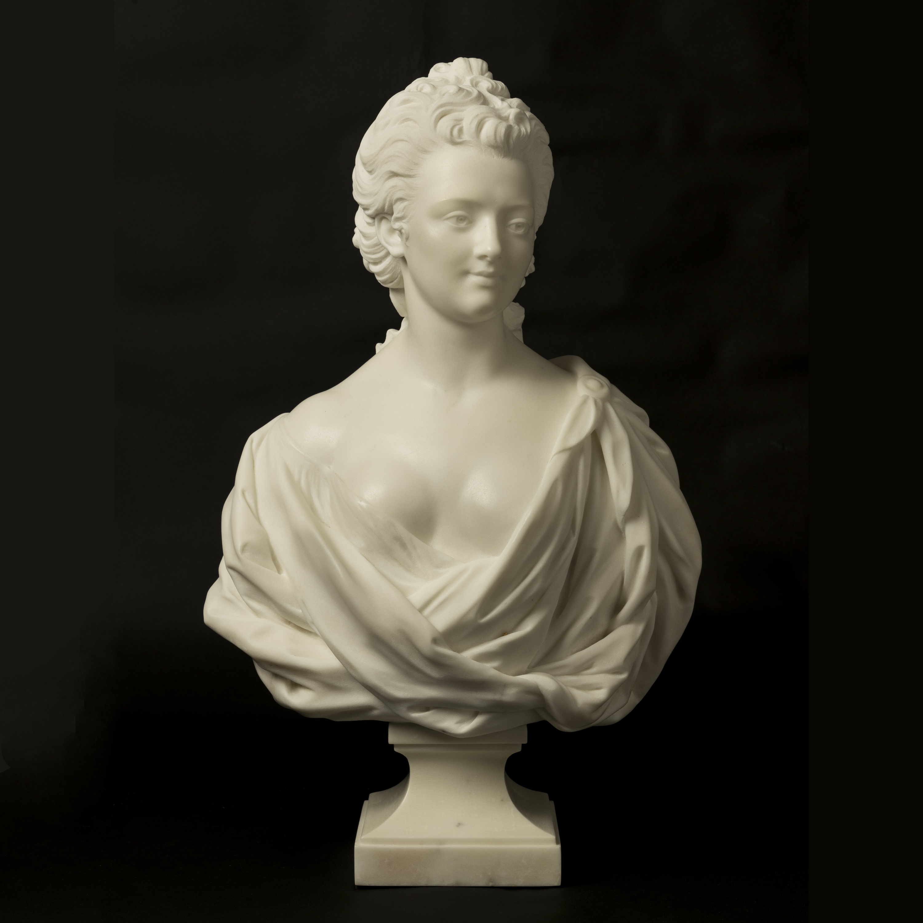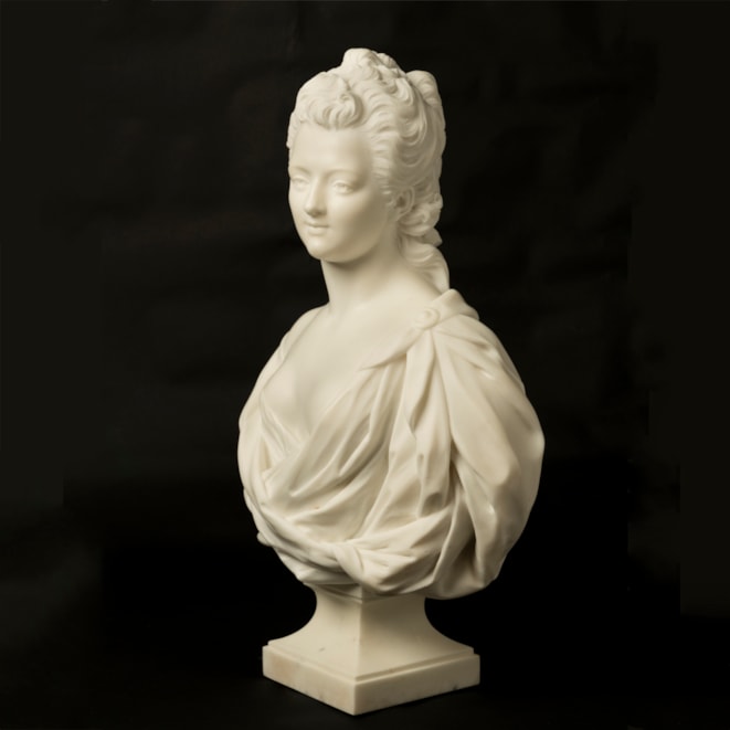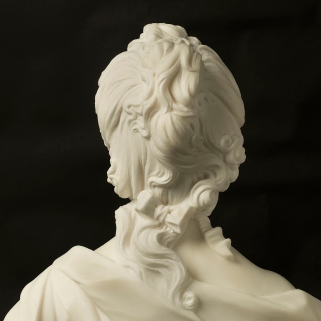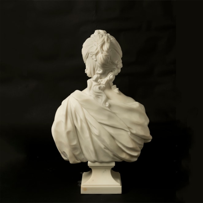 Carved from statuary marble, the female bust of a coiffed lady with ribbon-tied hair flowing down her back where it joins her voluptuous dress with billowing folds.