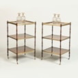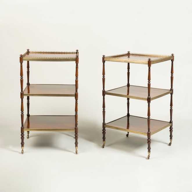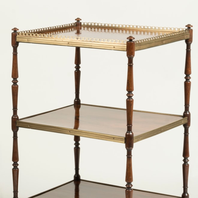 Of elegant proportions, with carved tapering and ring-turned rosewood supports, standing on brass castors, each of the three shelves with a handsome grained rosewood; the top with a pierced brass gallery.