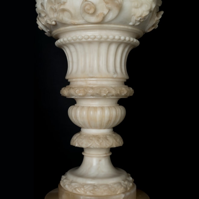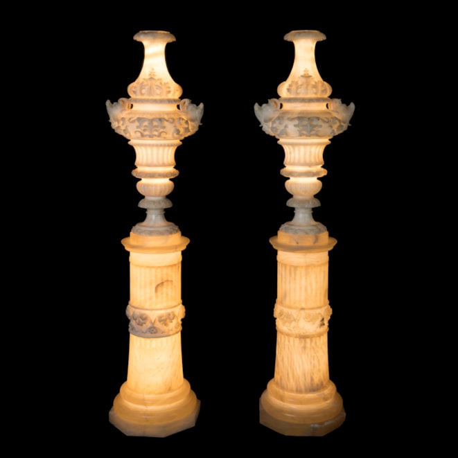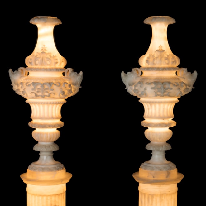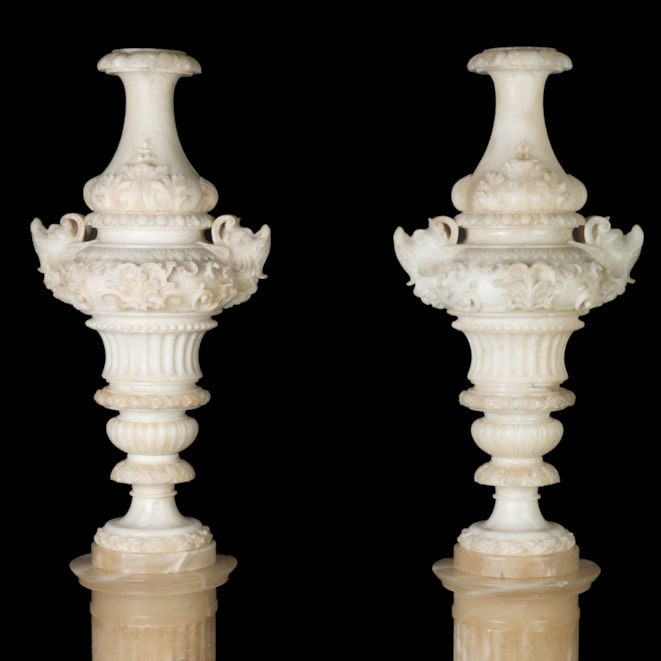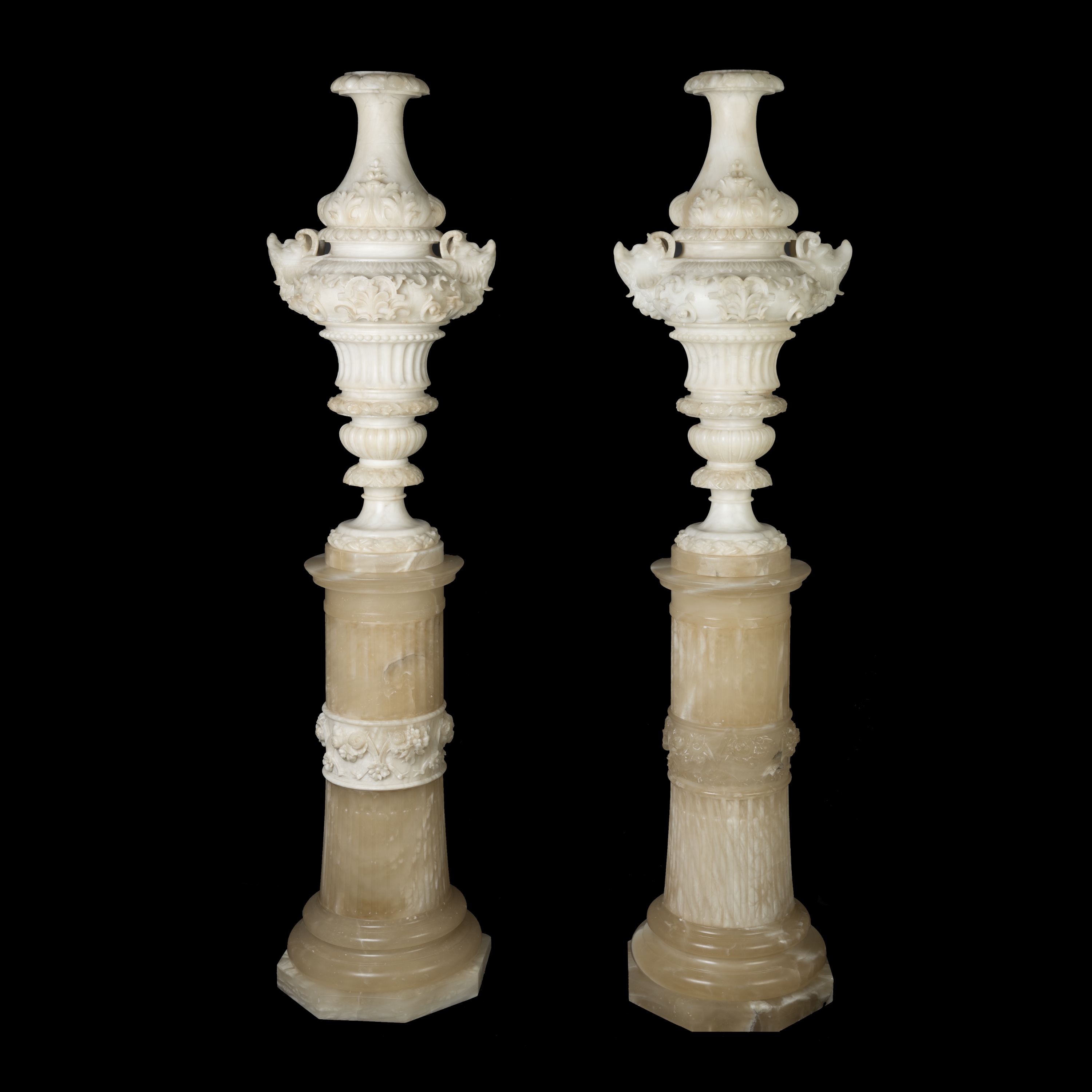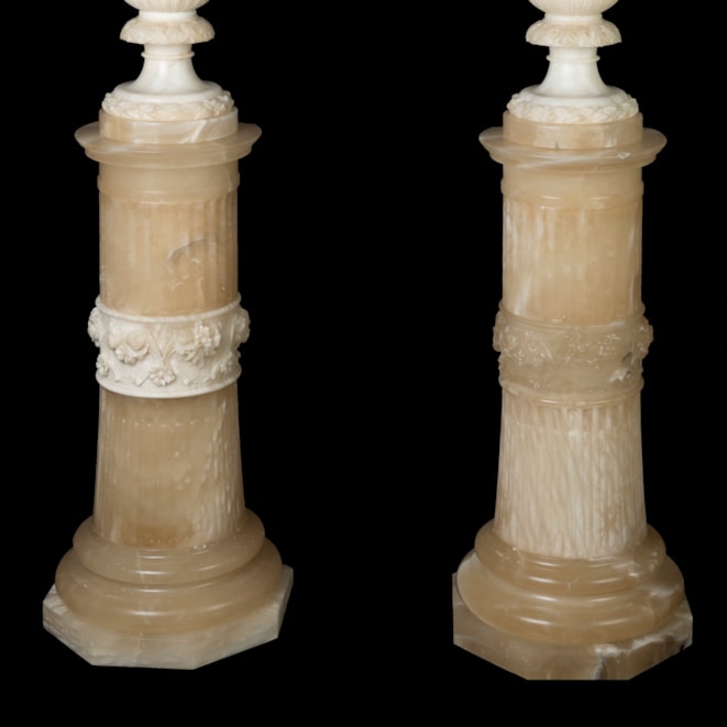 A Pair of Italian Carved Alabaster Ornamental Vases on Pedestals