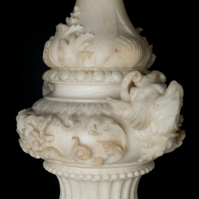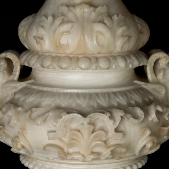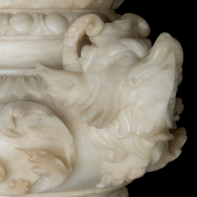 Carved with great finesse, the shaped vases on a laurel wrapped waisted socle, giving way to a lobed bulbous stem, the body of the vases fluted and carved in high relief with scrolling foliates and mythical chimera-mask handles to either side, surmounted by bell-shaped tops with acanthus carving; both pedestals stop-fluted and with a carved ribbon relief with similar foliate motifs.