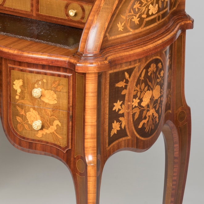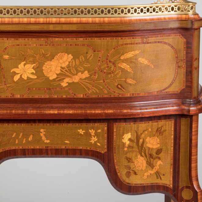 These small desks, characteristic of the 18th century and created by one of the most talented cabinetmakers of his generation, naturally served as both a model and inspiration for 19th-century designers. Cabinetmakers like François Linke, as exemplified here, reinvented these iconic pieces from the previous century.