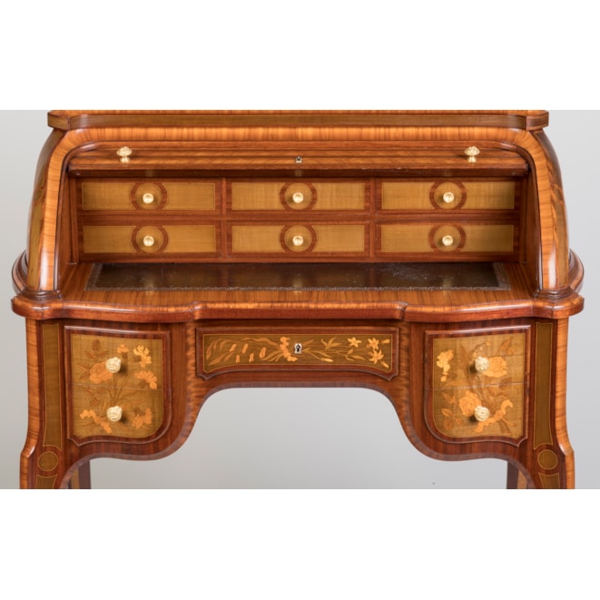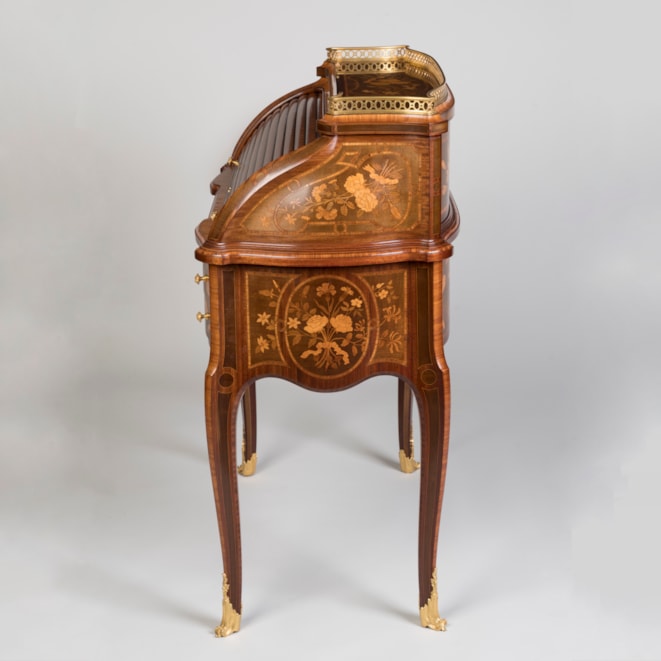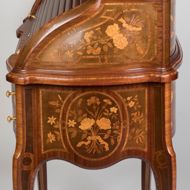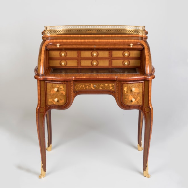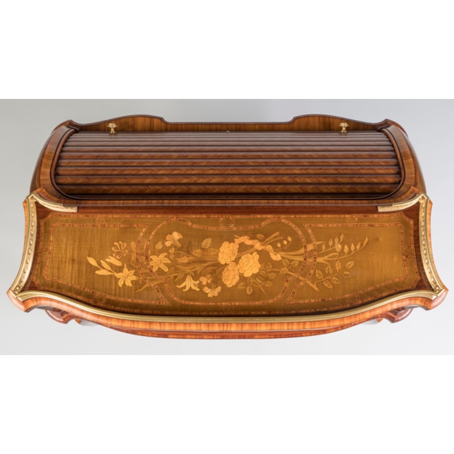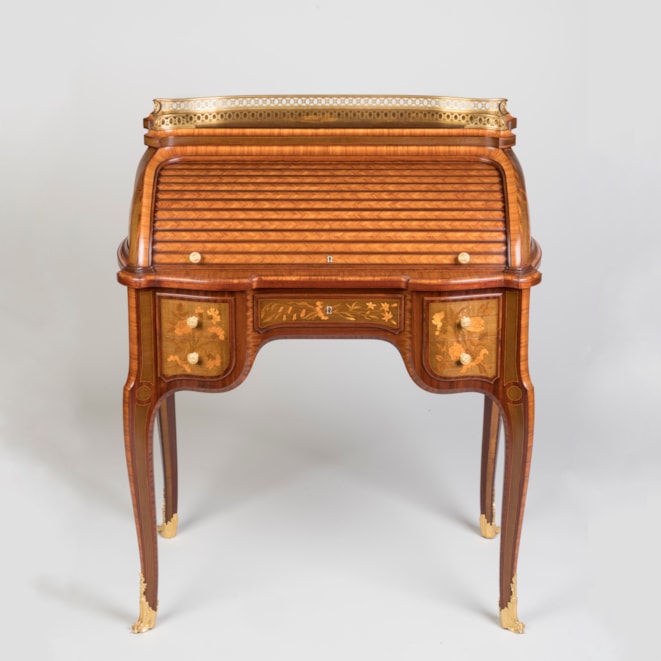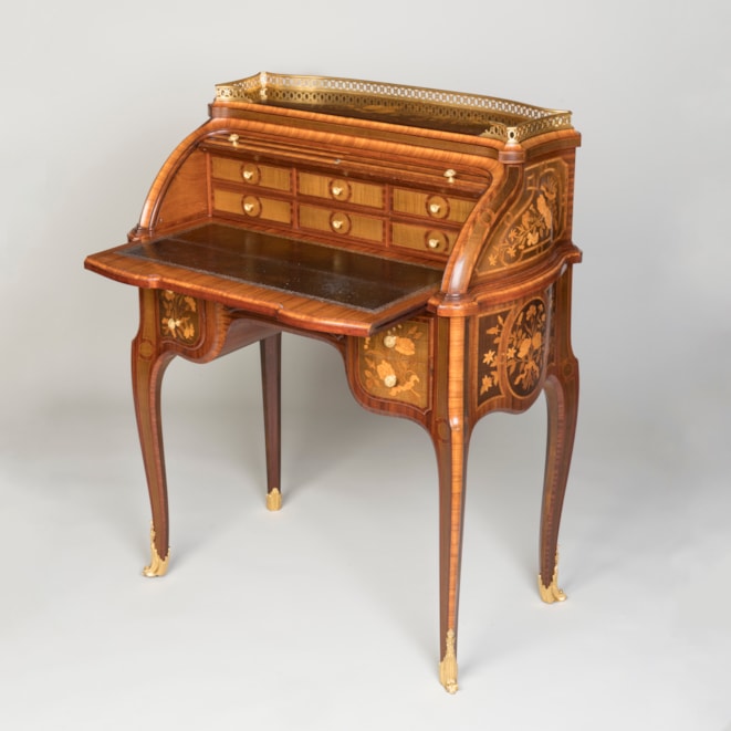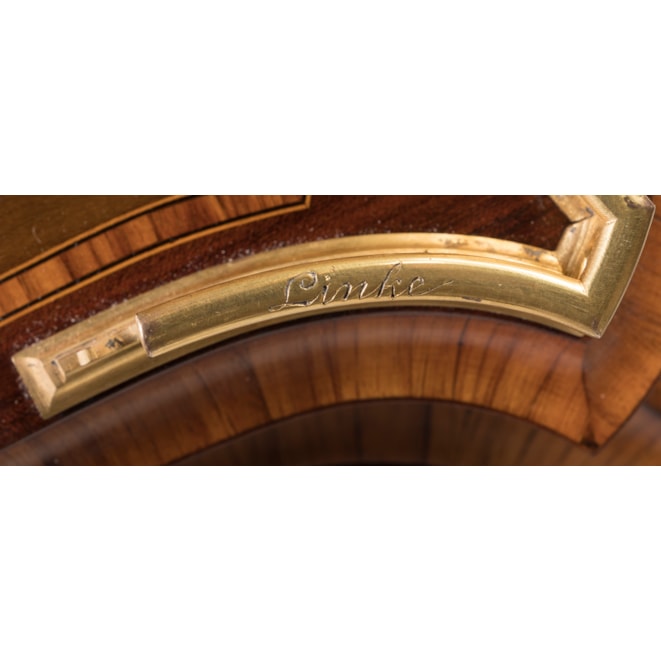 This cylinder desk is a recreation of one designed by Jean-François Oeben, who became maître ebeniste in 1761. Linke based this bureau on the one currently shown at the Musée Nissim de Camondo (CAM 191). Oeben crafted several cylinder desks of this style, including the one at the Nissim de Camondo Museum and another commissioned for the Dauphine of France, later finding its way into the apartments of Marie-Antoinette (sold at Sotheby's New York on October 22, 2005, lot 88).