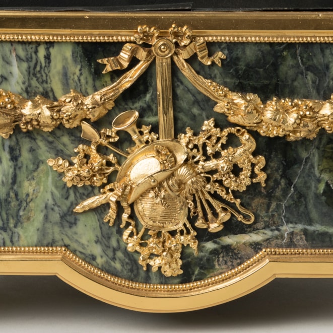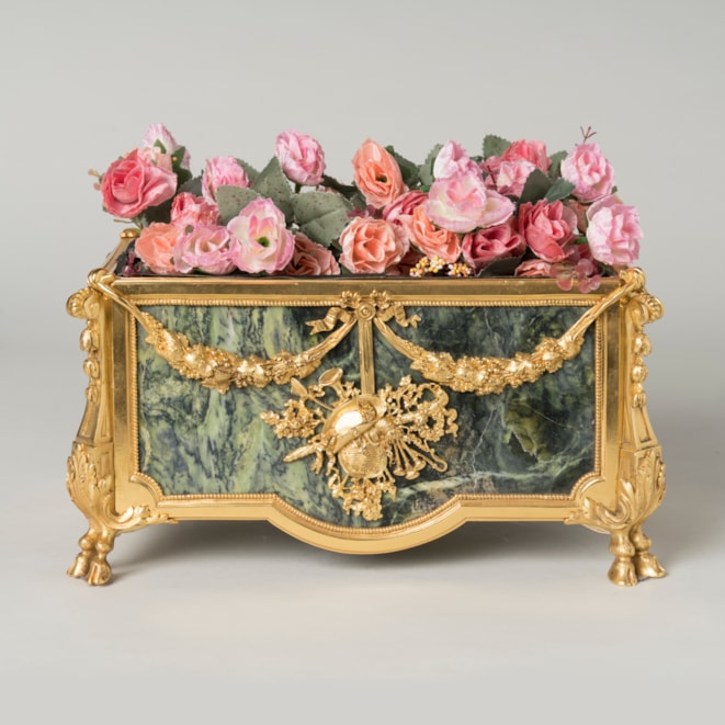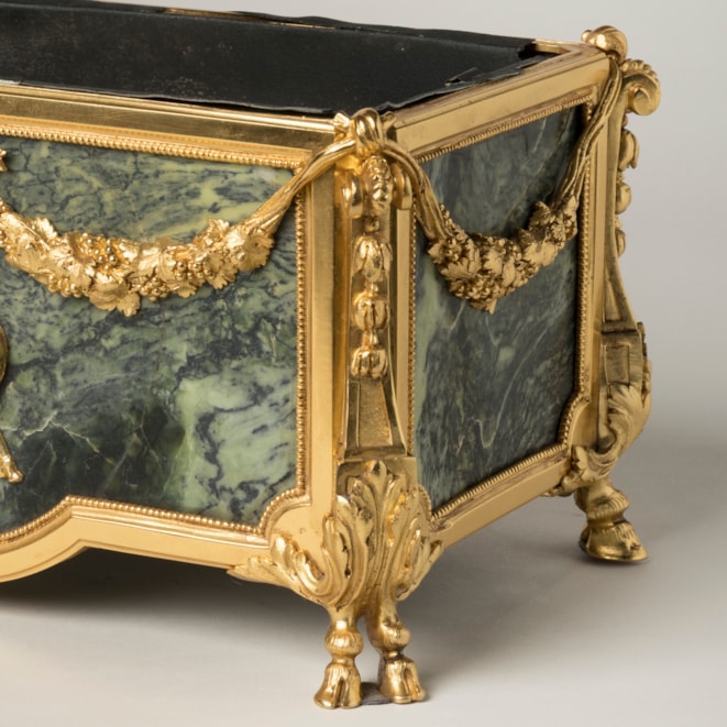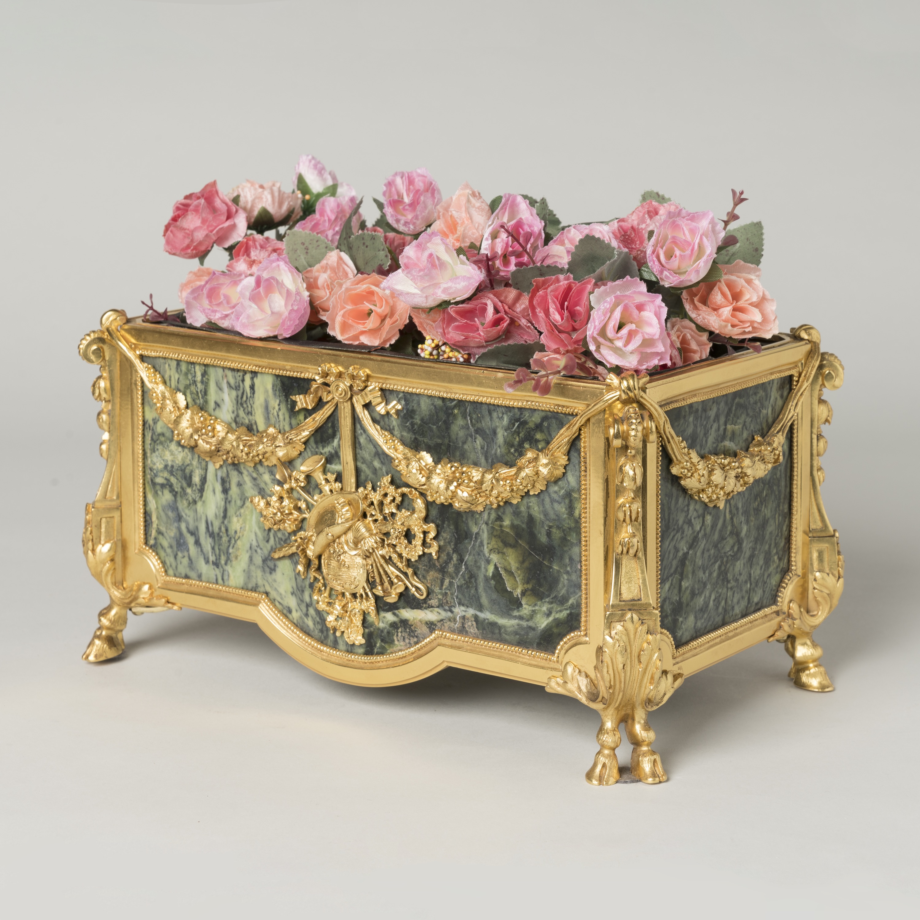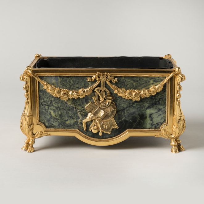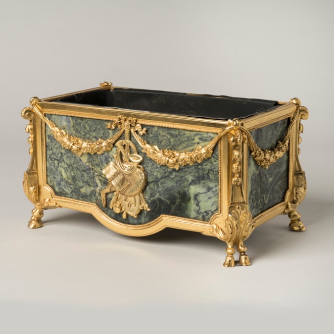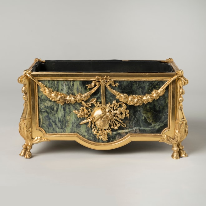 Constructed from green marble and mounted with gilded bronze mounts; the rectangular jardinière with paired hoof feet to the canted corners, each side draped with ribbon-tied floral garlands and a central ormolu trophy plaque. Complete with original liner.