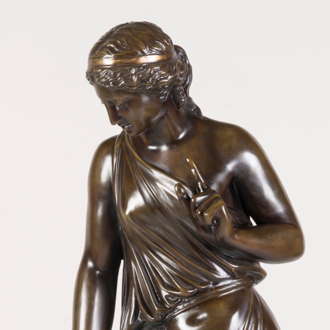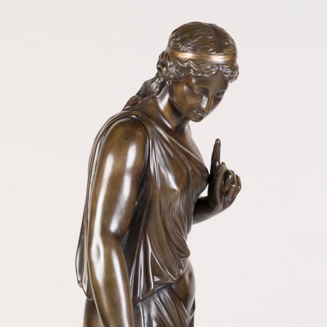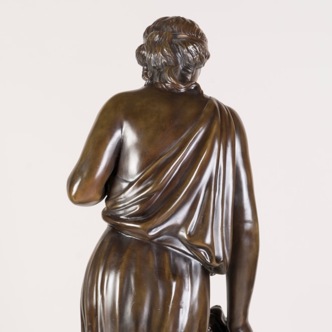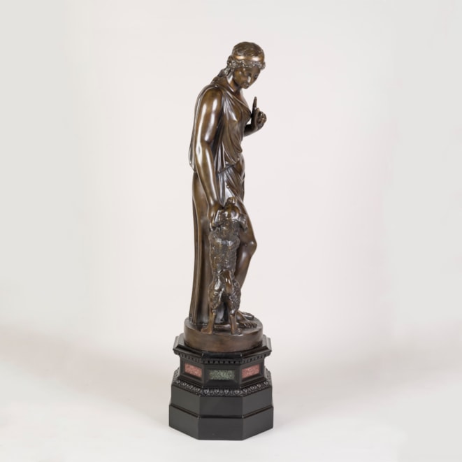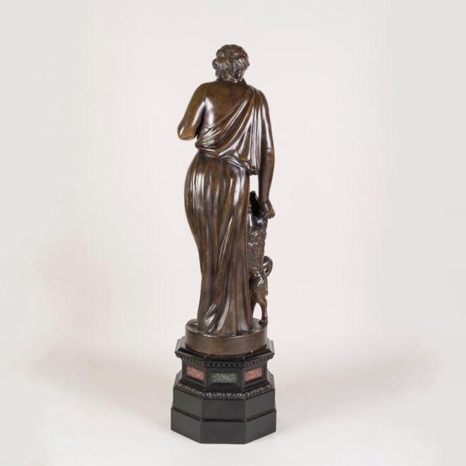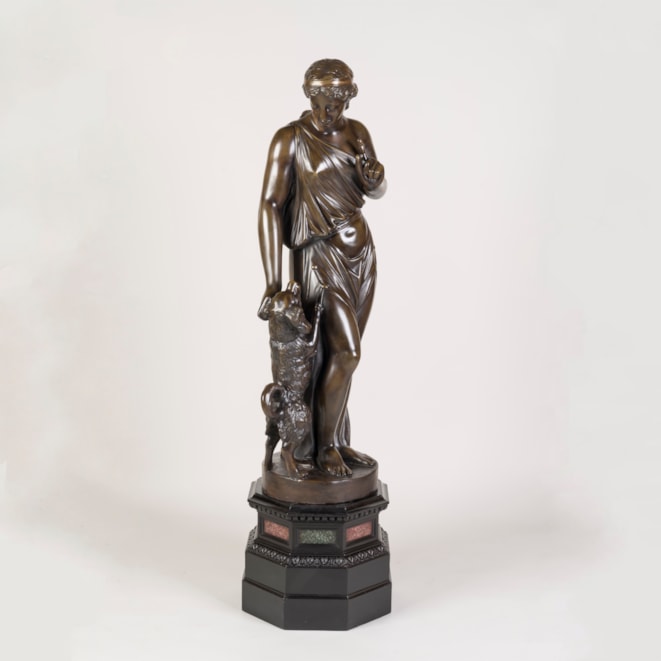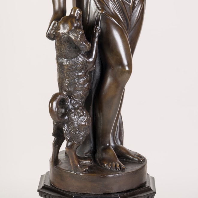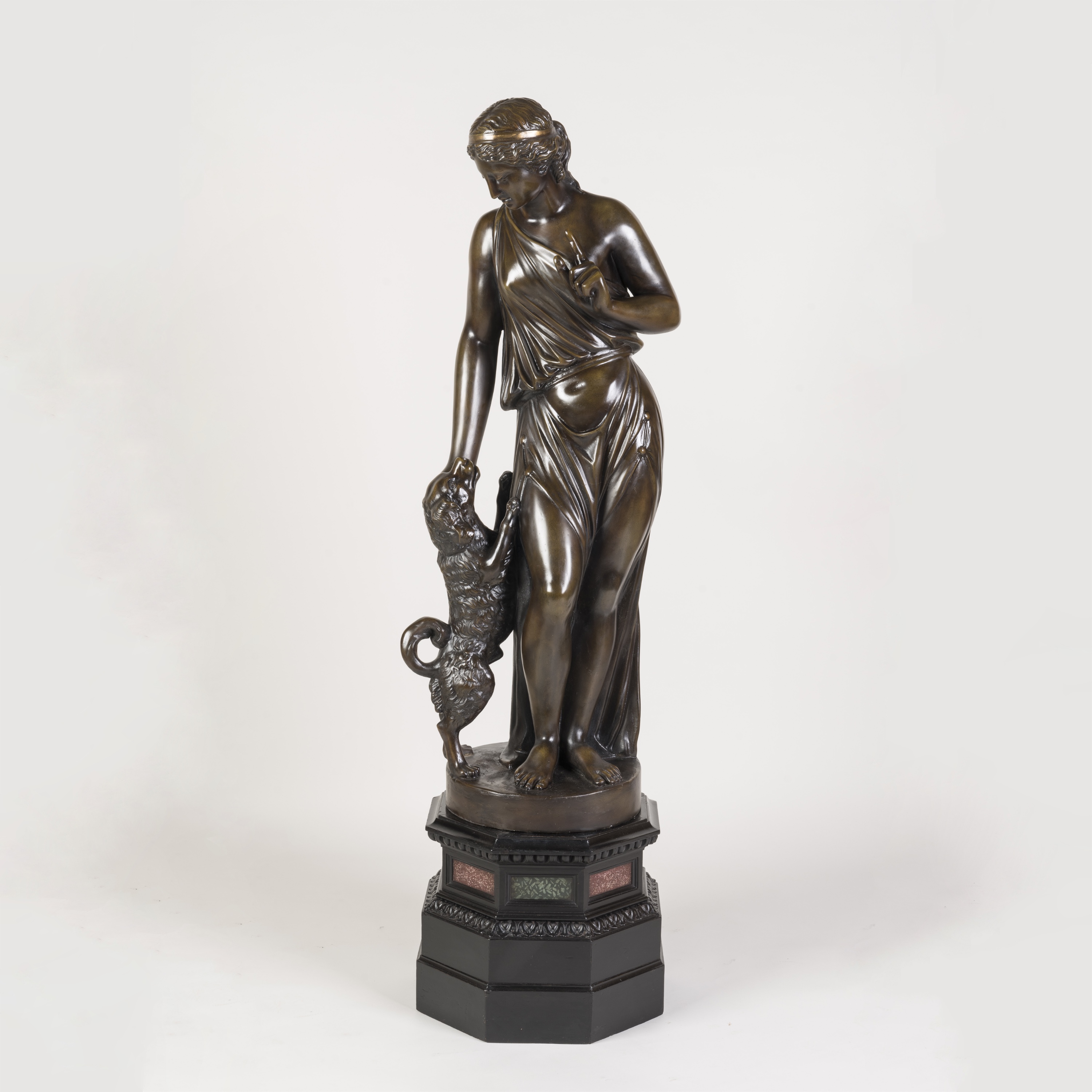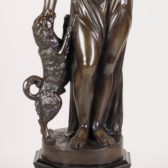 Constructed from plaster, painted and patinated to resemble aged bronze, the female figure draped in a toga, standing in contrapposto as she gestures towards her faithful companion.