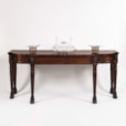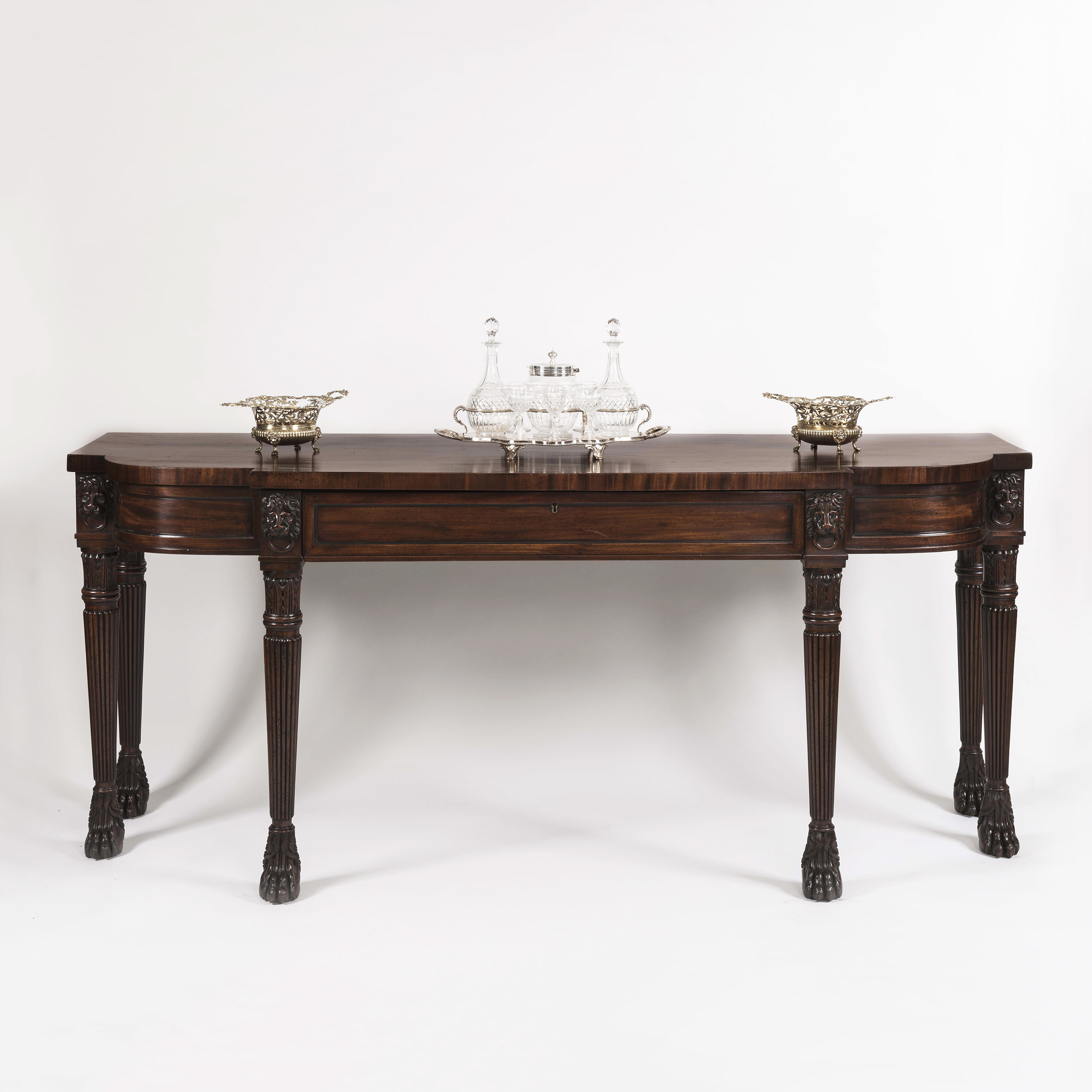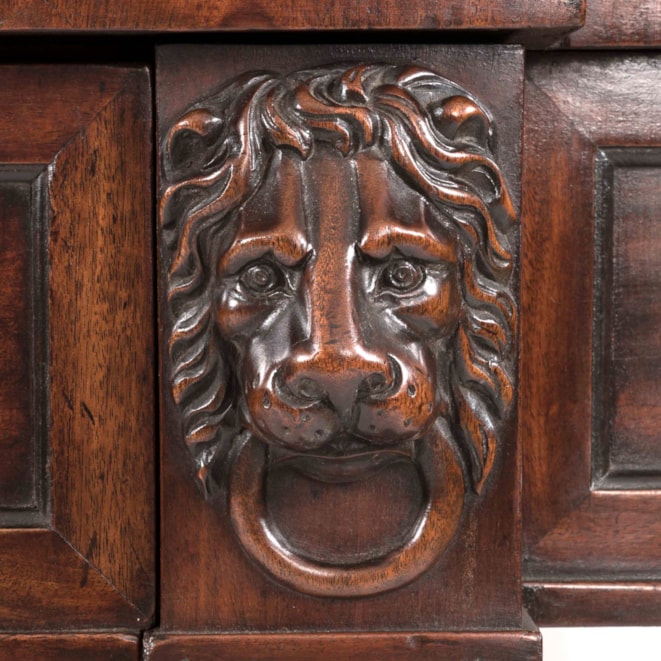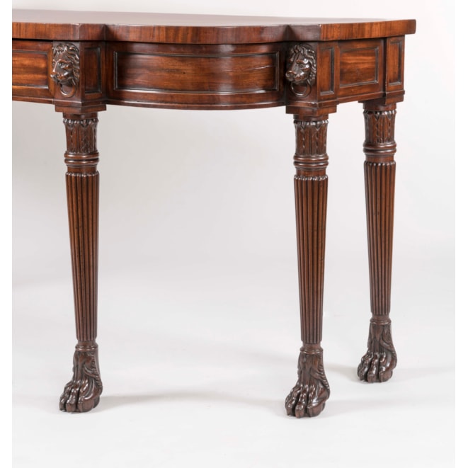 Constructed in Mahogany, the design source being Plate 92 from Smith (qv). Rising from animal claw footed ring turned, tapering and reeded legs, with carved stiff-leaf capitols; the fielded panelled platform of breakfront form, housing an oak lined lockable central drawer, now baize lined, with quadrant mouldings, having swept ends, with lion masks holding annuli.