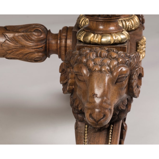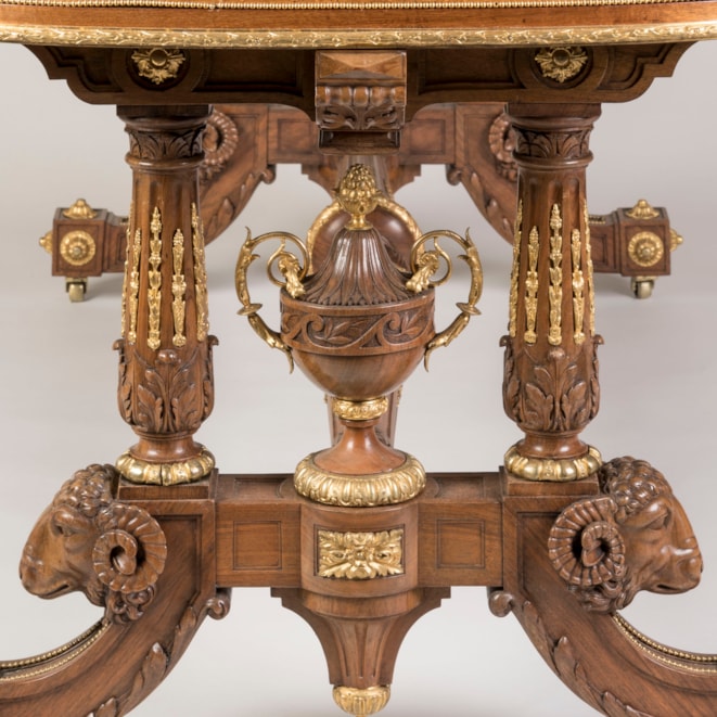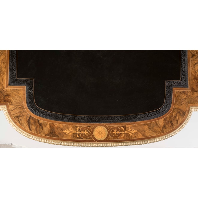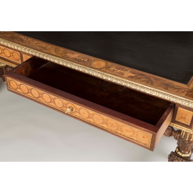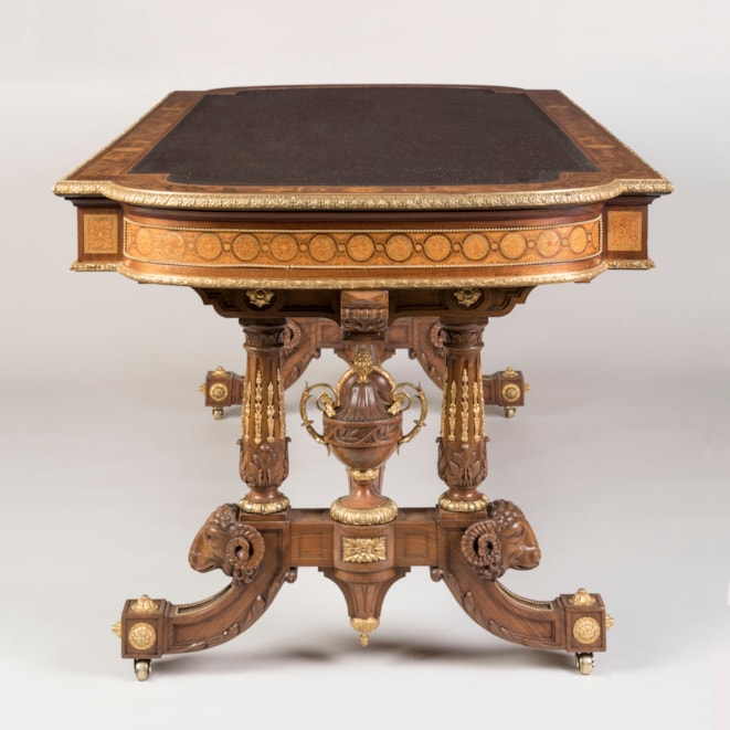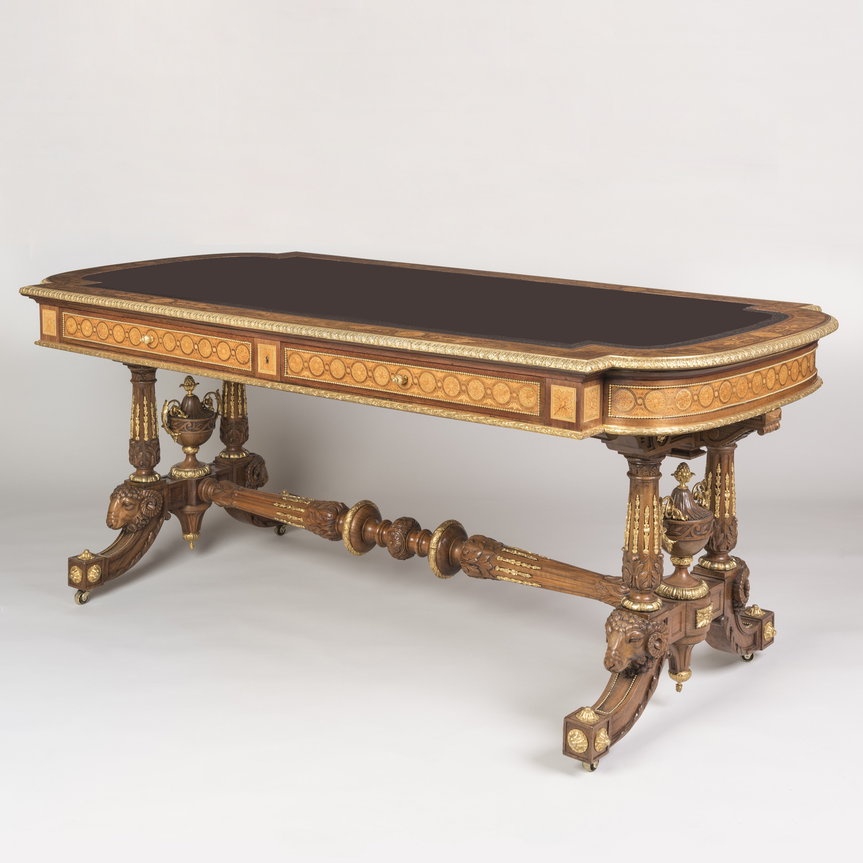 Of exceptional quality, constructed using beautifully grained woods, including burr walnut, boxwood, and sycamore, adorned with very finely cast, hand-chased and gilded ormolu mounts; the end supports rising from castor-shod downward curved legs with carved ram's head terminals, surmounted by fluted double columns with carved acanthus leaves flanking an urn with carved frieze and ormolu handles and berried finials; joined by a tapering, fluted, and turned stretcher with ormolu collars; the symmetrical shaped serpentine crossbanded and inlaid top on a burr walnut ground inset with a gilt tooled leather surface; with two lockable drawers housed in the frieze of conforming outline and inlaid with a continuous marquetry guilloche pattern. Stamped by Maison Pretot of Paris, the bronzes with the foundry marks of Henri Picard.