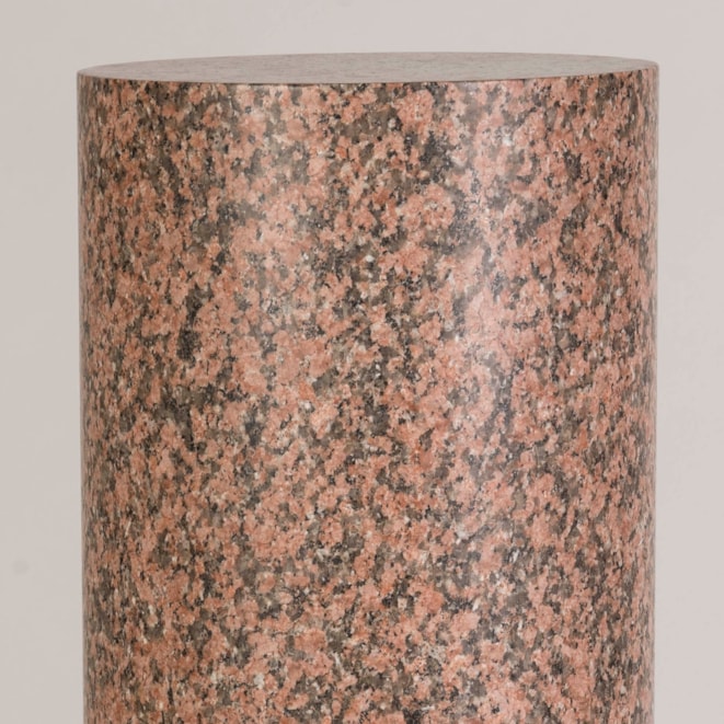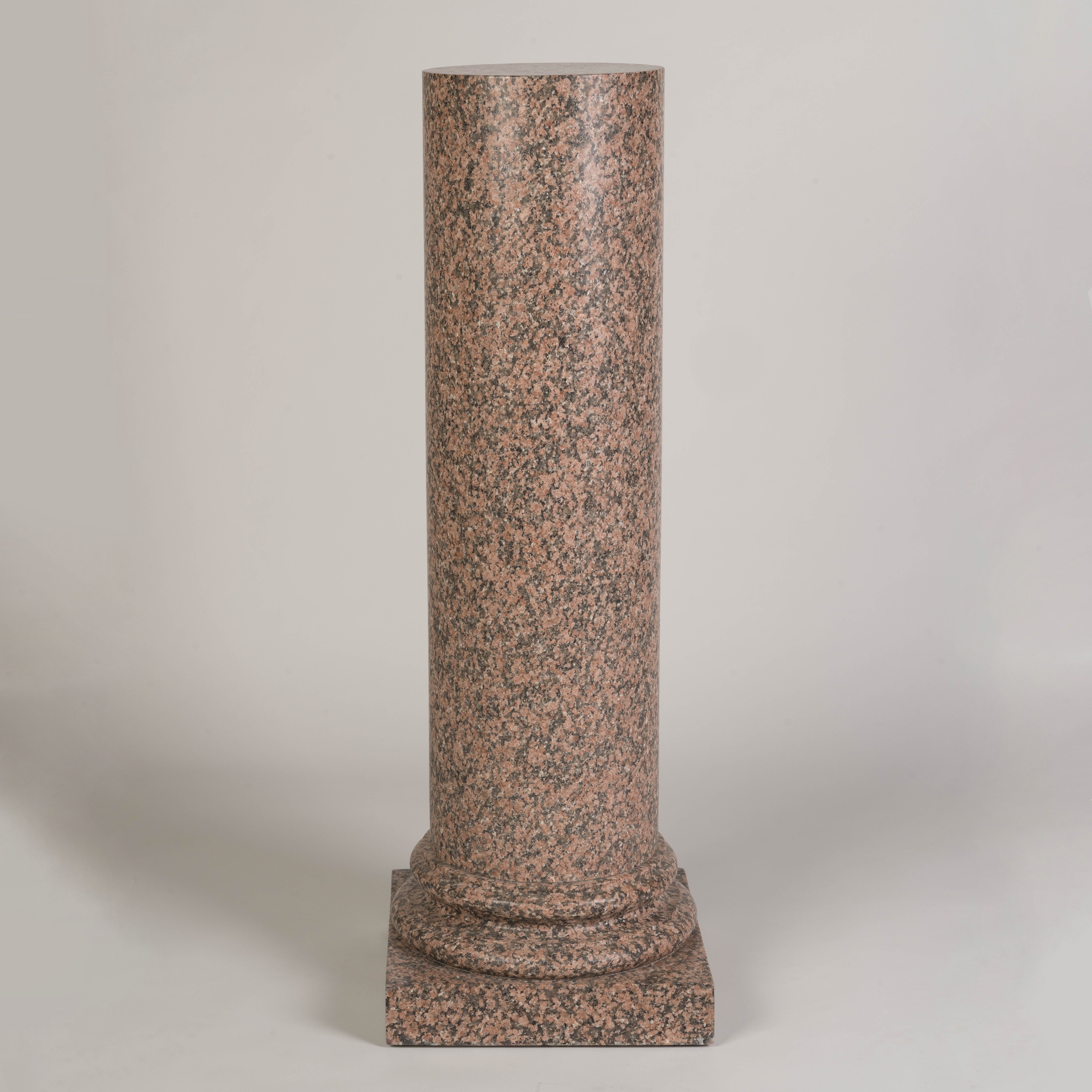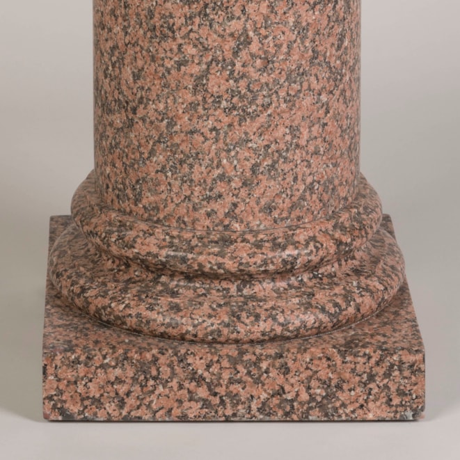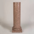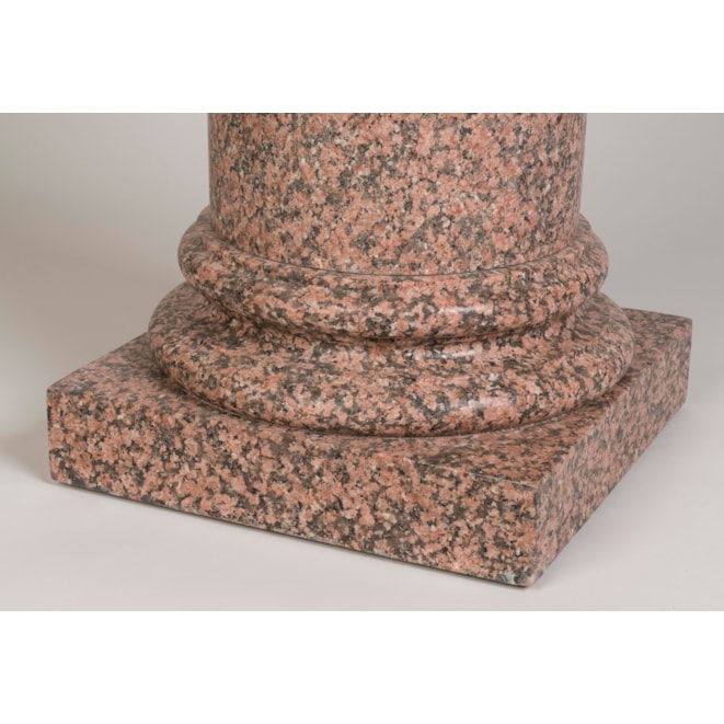 Carved from pink granite, the circular column with moulded details at the base and a square plinth support.