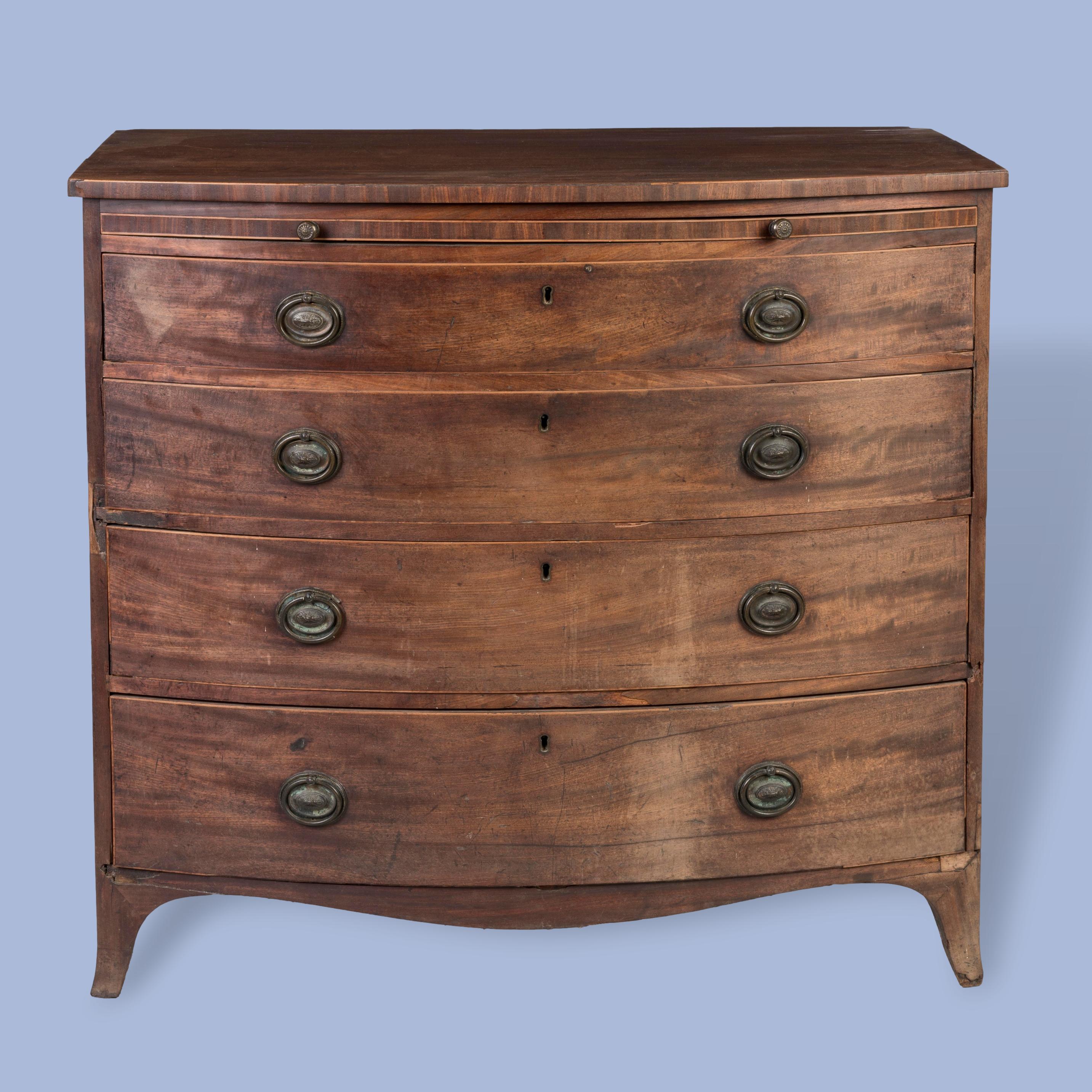 Constructed from mahogany, the bowfronted chest supported on splayed feet and a serpentine apron, the four graduated drawers with brass loop handles and paterae, with a leather-lined writing slide above.