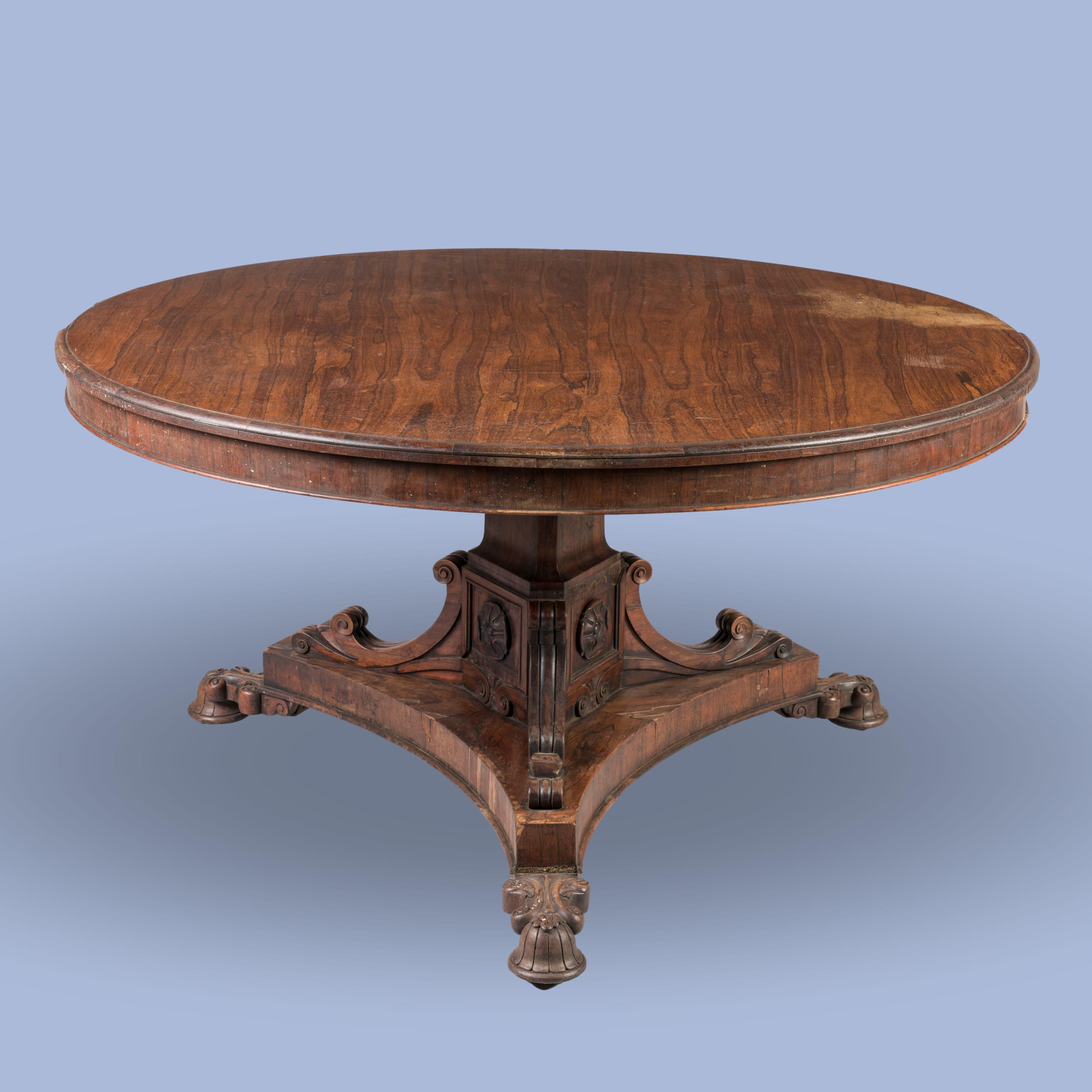 Constructed in a finely patinated and grained Rosewood; rising from an incurved tripartite base, with stylised Grecian feet, shod with castors; the central column supported by fielded panels with rose bosses, and braced with scrolled and carved spandrels; the circular tilt-top having a thumbnail moulded edge.