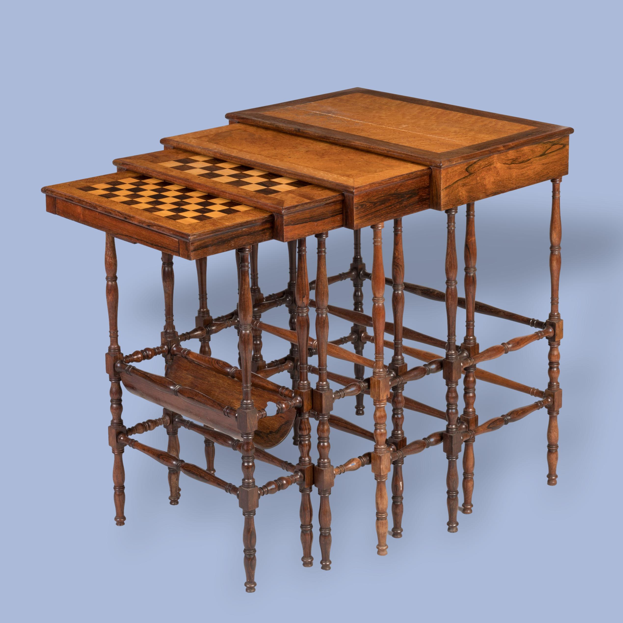 Interlocking, and of rectangular form, each table rising from baluster form turned rosewood legs, with stretchers of conforming shape: two tables having inlaid chess board tops, two arranged as side tables, the smallest fitted with a dished tray; specimen woods are used throughout, including burr walnut, burr Canadian maple, satinwood and harewood.