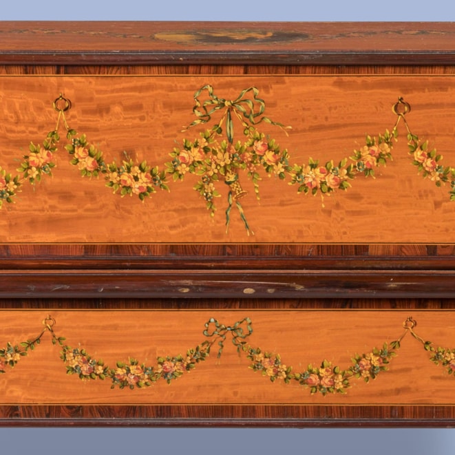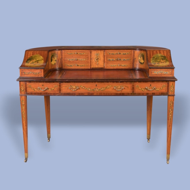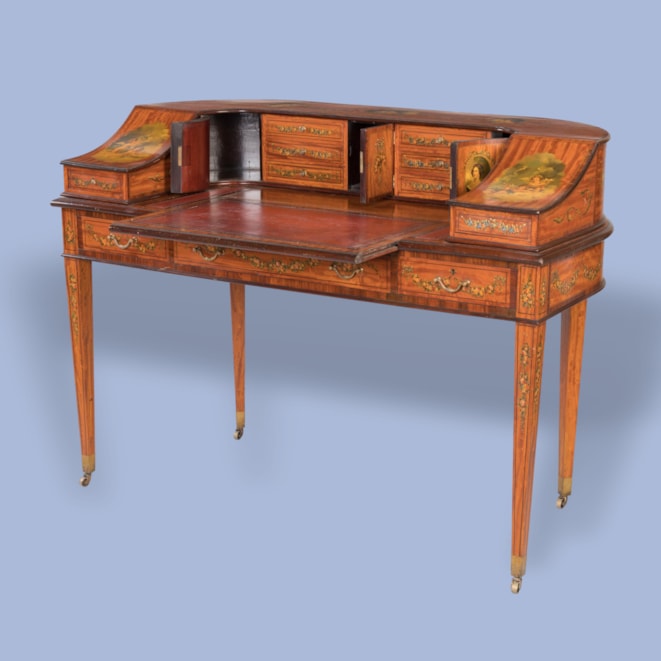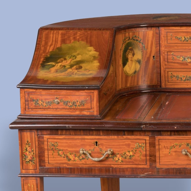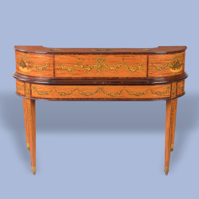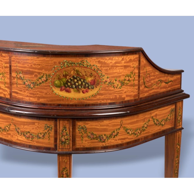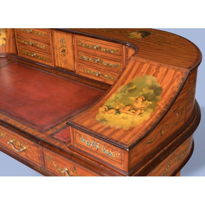 Of freestanding form, constructed from satinwood, with inlaid stringing, rosewood crossbanding, and extensive polychrome decoration; rising from square section tapered legs terminating in brass castor shod feet, decorated with pendant floral garlands; the apron inset with three drawers decorated with floral garlands and having gilt handles; the sliding leather inset writing surface flanked by hinged letterboxes with curved lids decorated with scenes of frolicking putti among clouds; concave cupboards at the angles with cartouches of female portraits; the central cupboard flanked by banks of stationary drawers; the front, top & sides all similarly decorated with symbols of love.