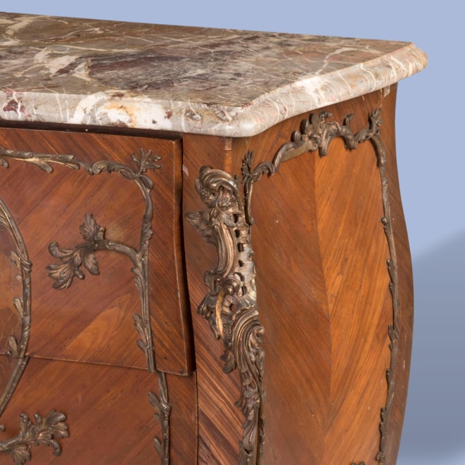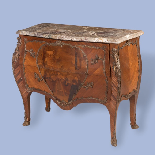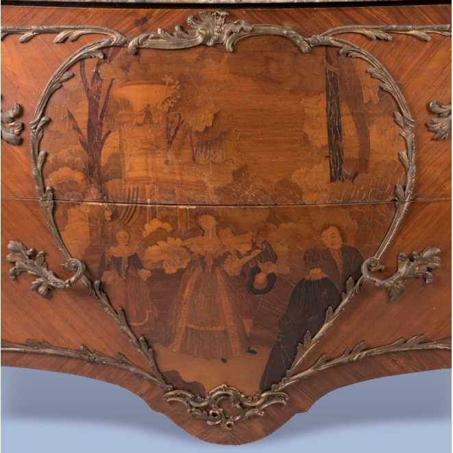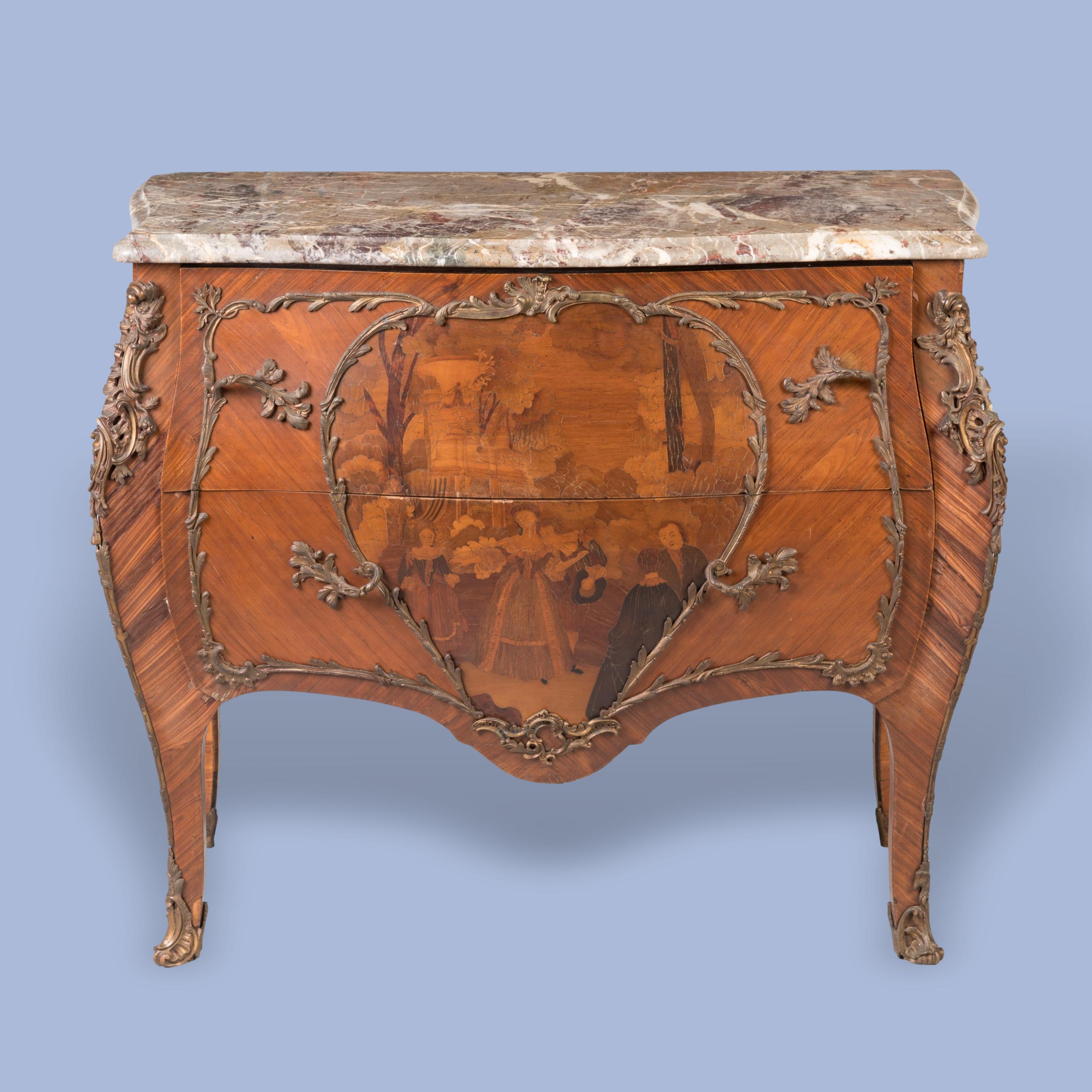 Constructed in Kingwood, dressed with ormolu mounts, and marquetry decorated; of bombe form, rising from bronze sabot-shod cabriole legs, having espagnolettes; the two drawers having a heart shaped bronze cartouche depicting a fête galante in marquetry, with bronze handles, surmounted by a thumbnail moulded edge brecciated shaped marble top.