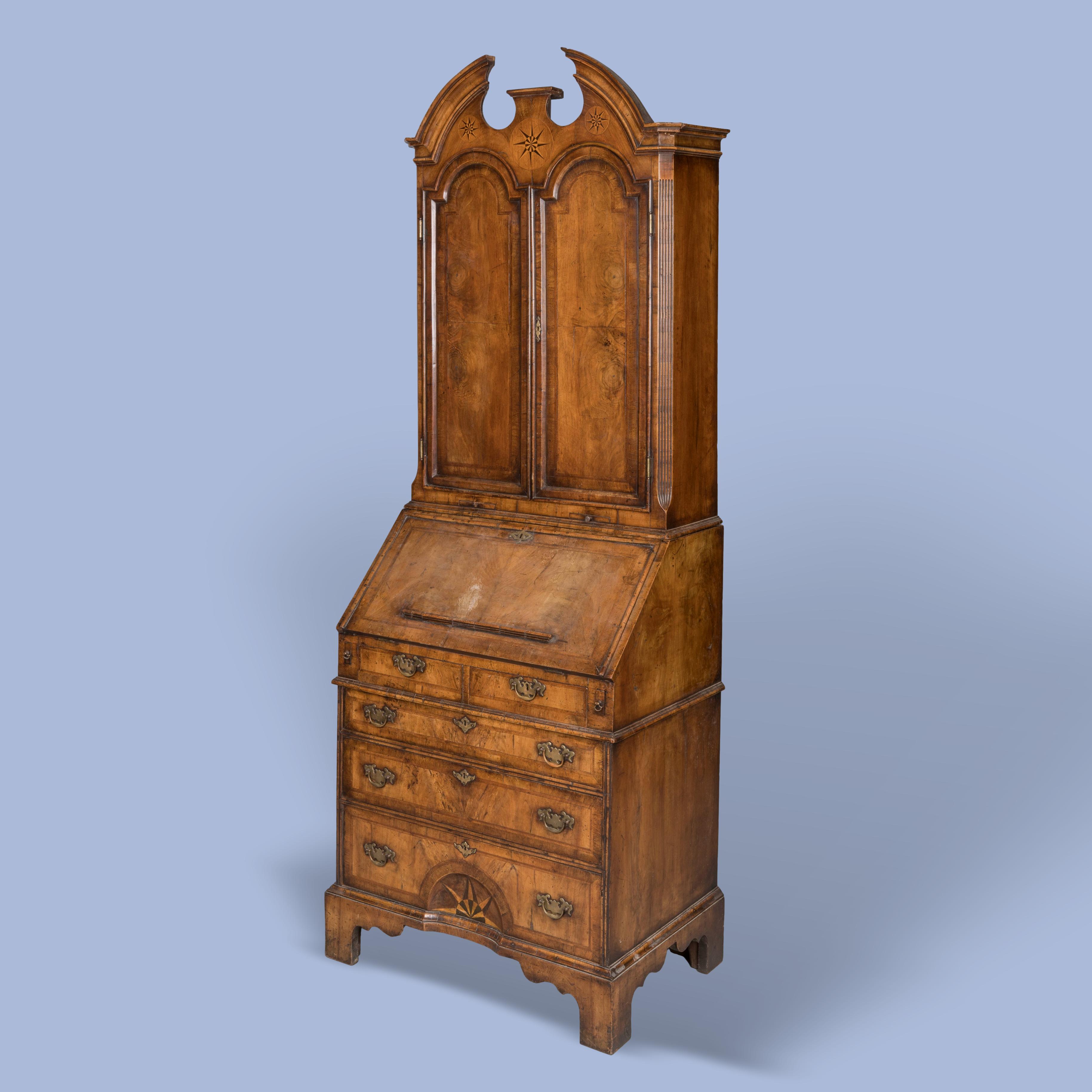 Of good proportions, constructed in walnut with feather banding: rising on shaped bracket feet, three graduated drawers the lowest having a sunburst parquety panel, atop, two short drawers, all fitted with solid shaped backplates and swan neck handles, cut brass escutcheons; the hinged fall having a notebook rest, concealing the shaped and stepped interior, fitted with further small drawers and pigeonholes; the upper section having a pair of candle slides; the cabinet being enclosed by a pair of arched panel doors, inside an arrangement of vertical dividers, and further drawers and pigeon holes the pediment of broken arch form and with, further sunburst parquetry inlays.