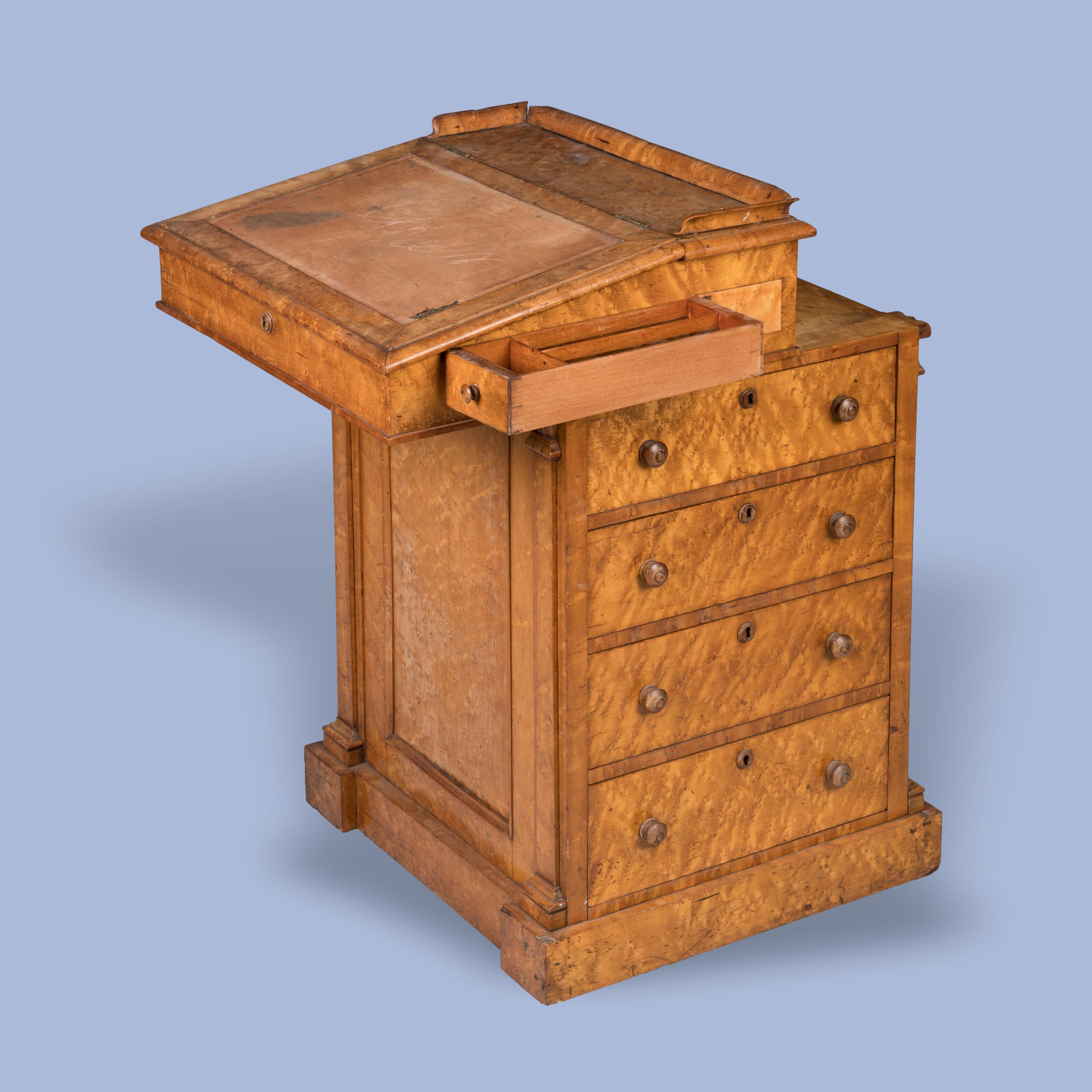 Constructed in a finely figured and patinated Maple; rising from a plinth base, incorporating four graduated drawers to the side, with turned wood knobs; the other three sides of fielded panel type, with a slide action writing cabinet having a hinged lifting top inset with a tooled leather surface, fitted with drawers to the interior, and an outswept gallery.