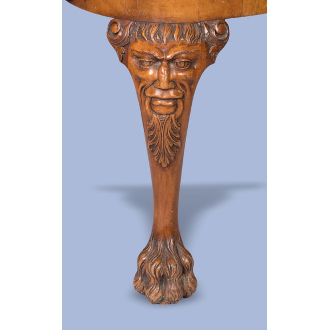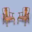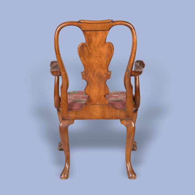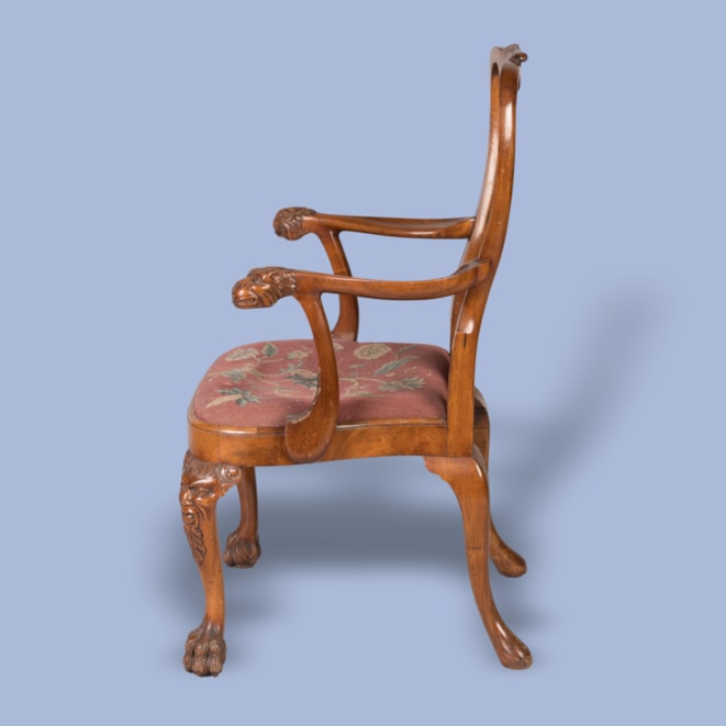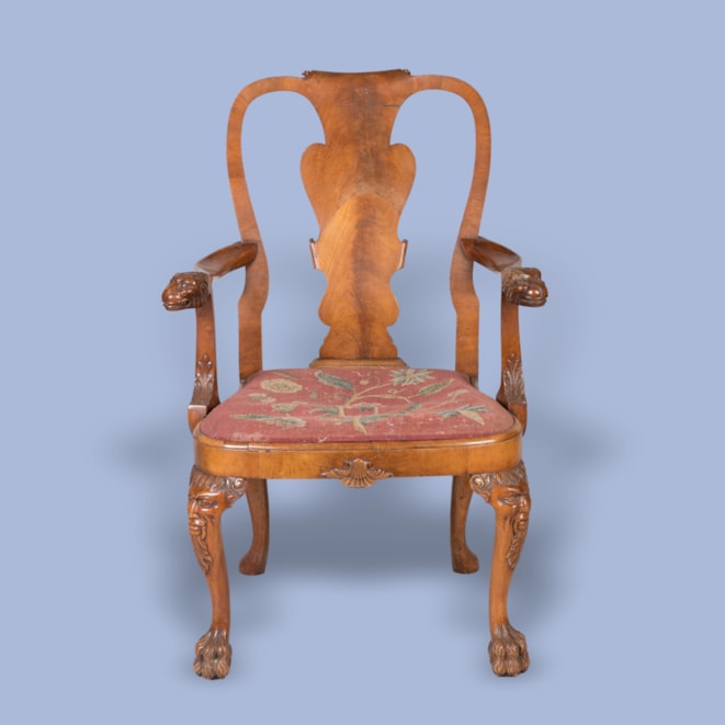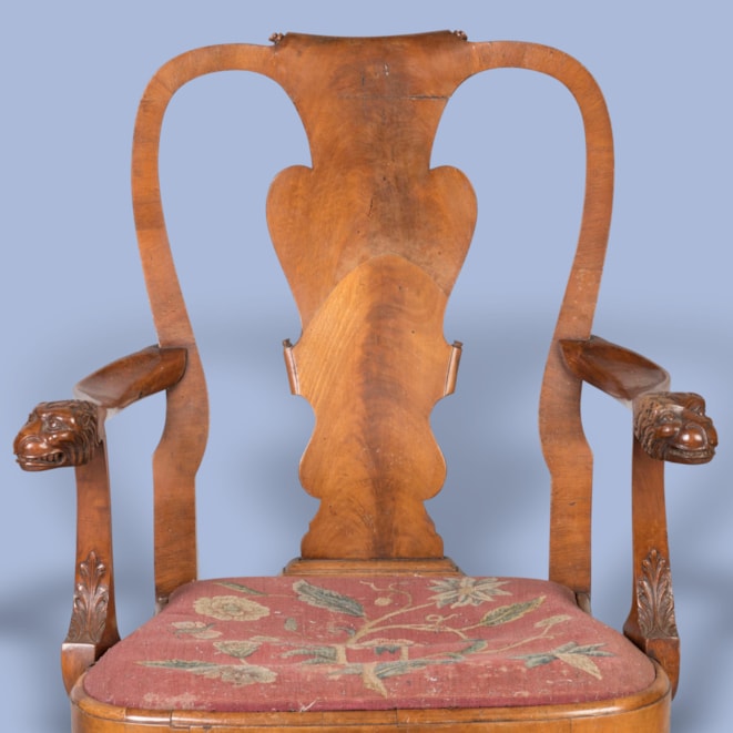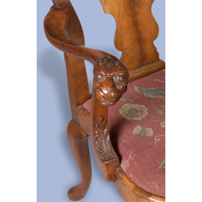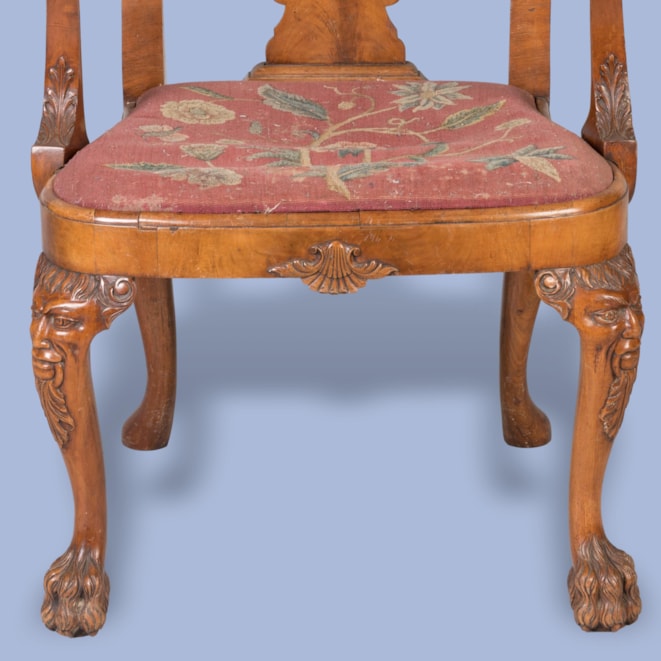 Constructed from walnut, these armchairs are based on the most desirable early Georgian and Queen Anne chairs exhibiting the characteristic vase-shaped splat alongside elegant cabriole legs terminating in lion’s paw feet. Unusually, these armchairs exhibit anthropomorphic grotesque features on the knees as well as the terminals of the armrests, instead of the more common shell and foliate motifs. With drop-in needlepoint seats.