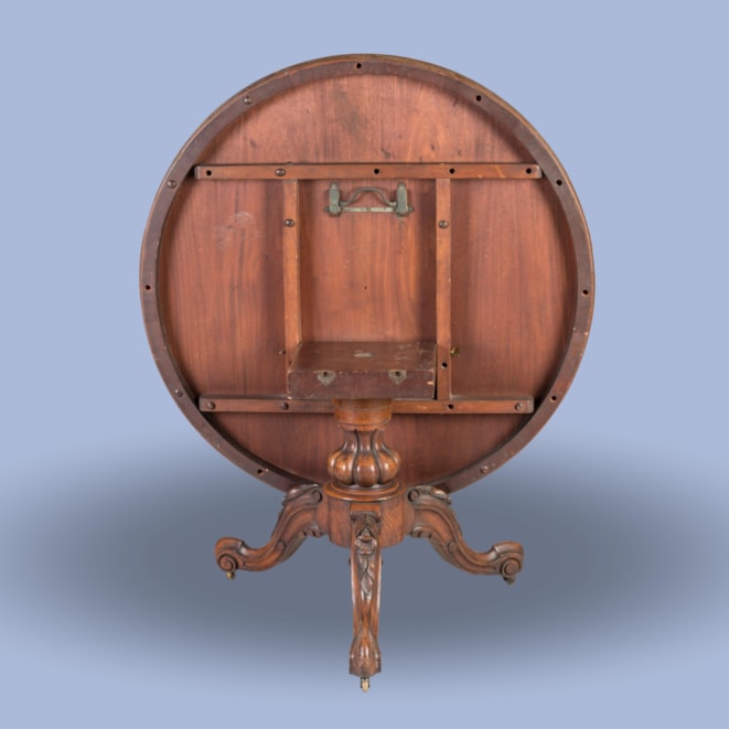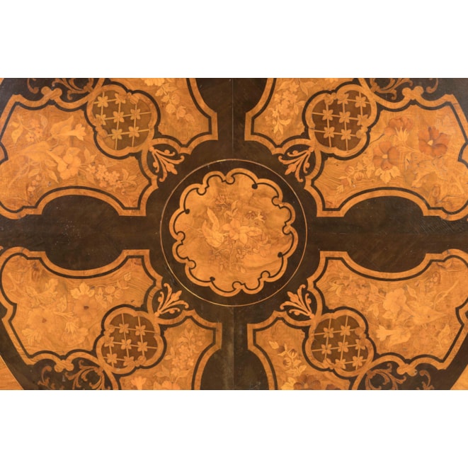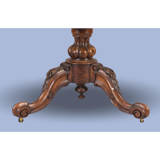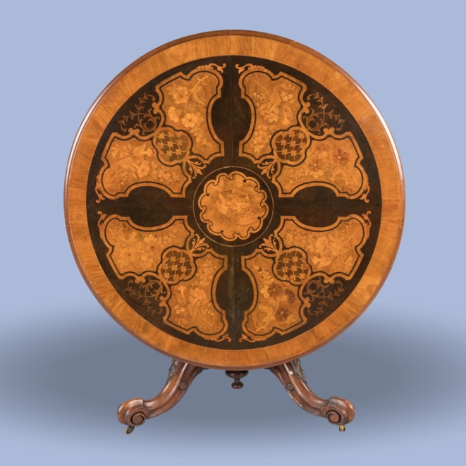 Constructed from walnut and various specimen woods, the circular top inlaid with panels of flowers and scrolls on an ebonised ground and raised on a turned and fluted centre support with three downswept legs with foliate carving to each knee and scrolling feet concealing brass casters.
