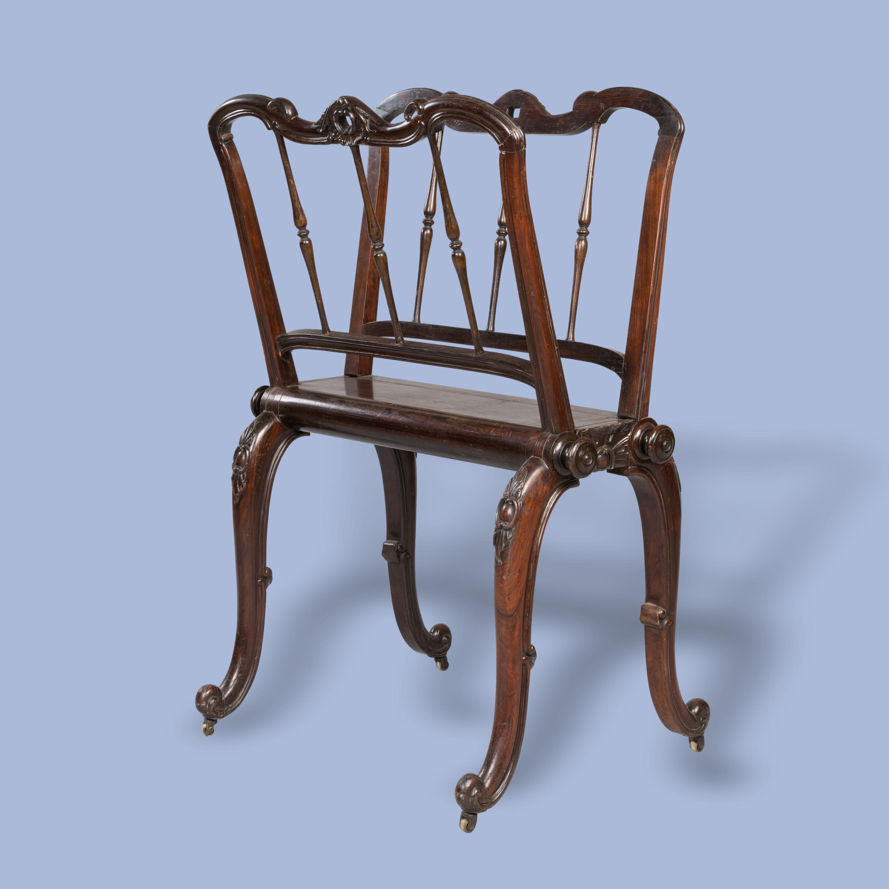 An adjustable Folio Stand of the late Georgian period, constructed in a finely patinated Rosewood; the swept cariole legs supporting the carrier, of serpentine form, with centrally carved flower head handles.