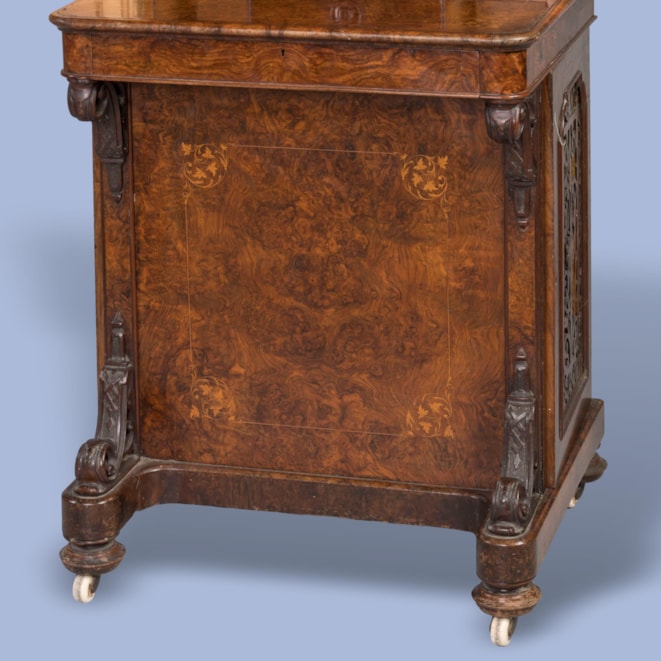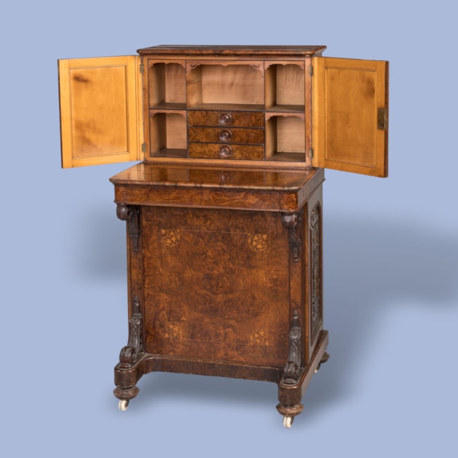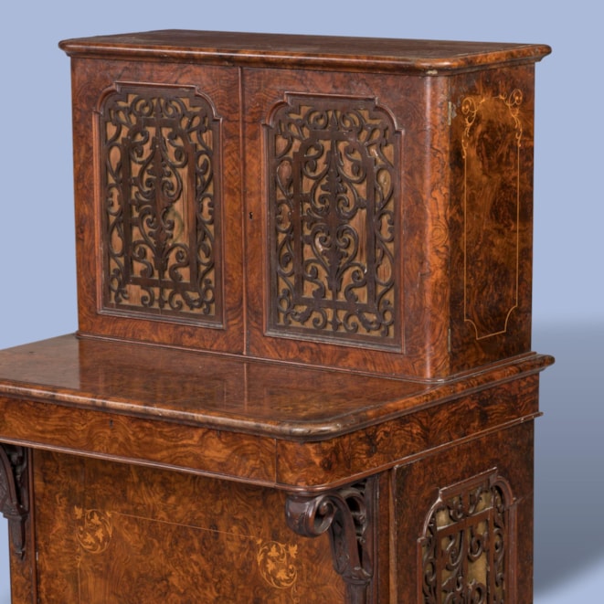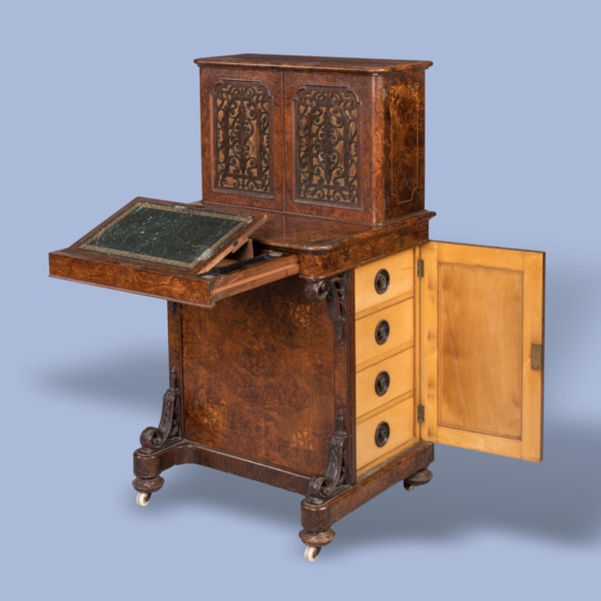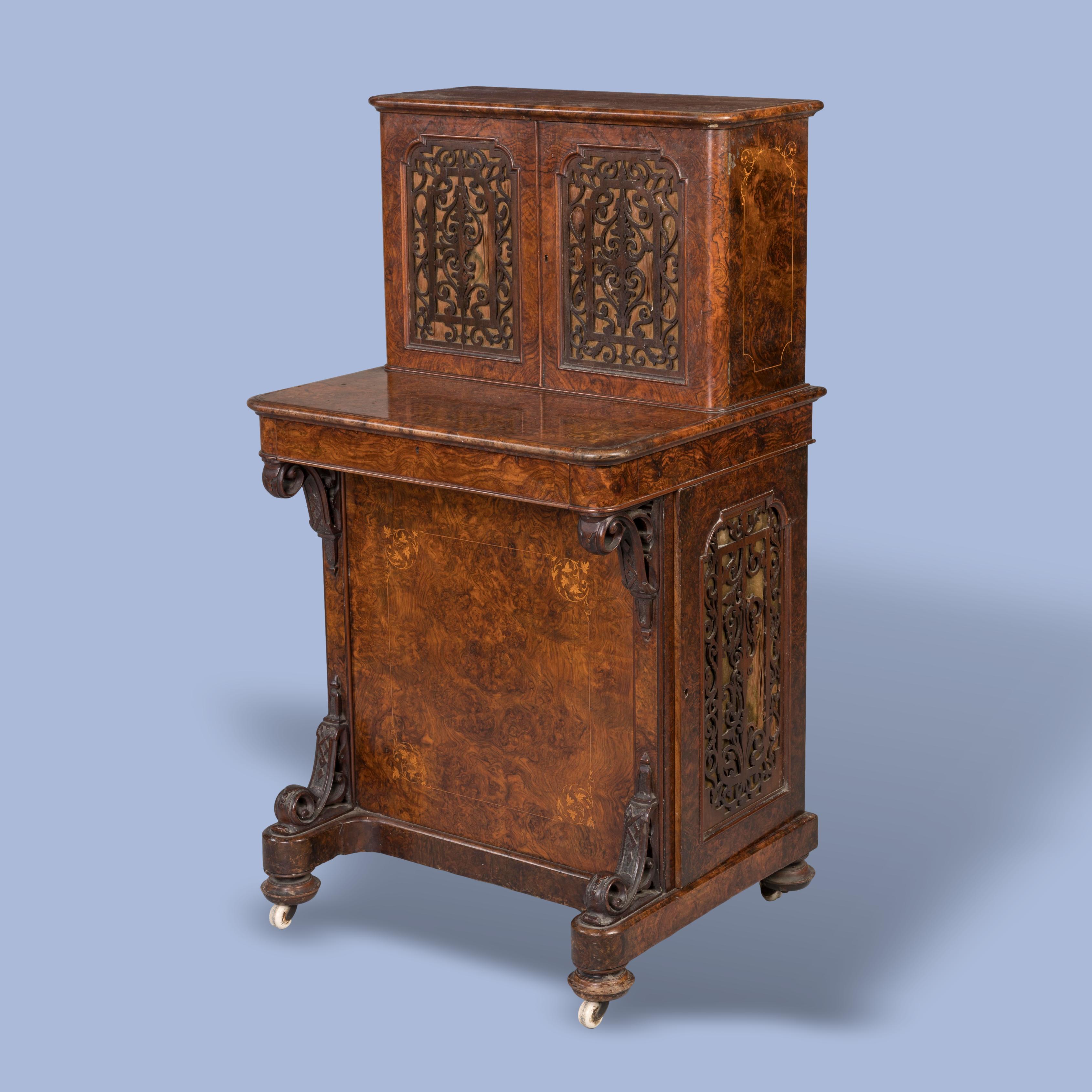 Constructed in Circassian Walnut, with line and marquetry inlays; rising from turned oblate bun feet; the lower section housing a hinged door with fretwork panelling, opening to reveal four Lemonwood faced graduated drawers with inset turned knobs; the writing compartment braced by foliate spandrels above and below, the slide opening to reveal an easel support writing slope with inset tooled leather and a pen and ink tray; over a double door fretwork cupboard with a shelved interior.