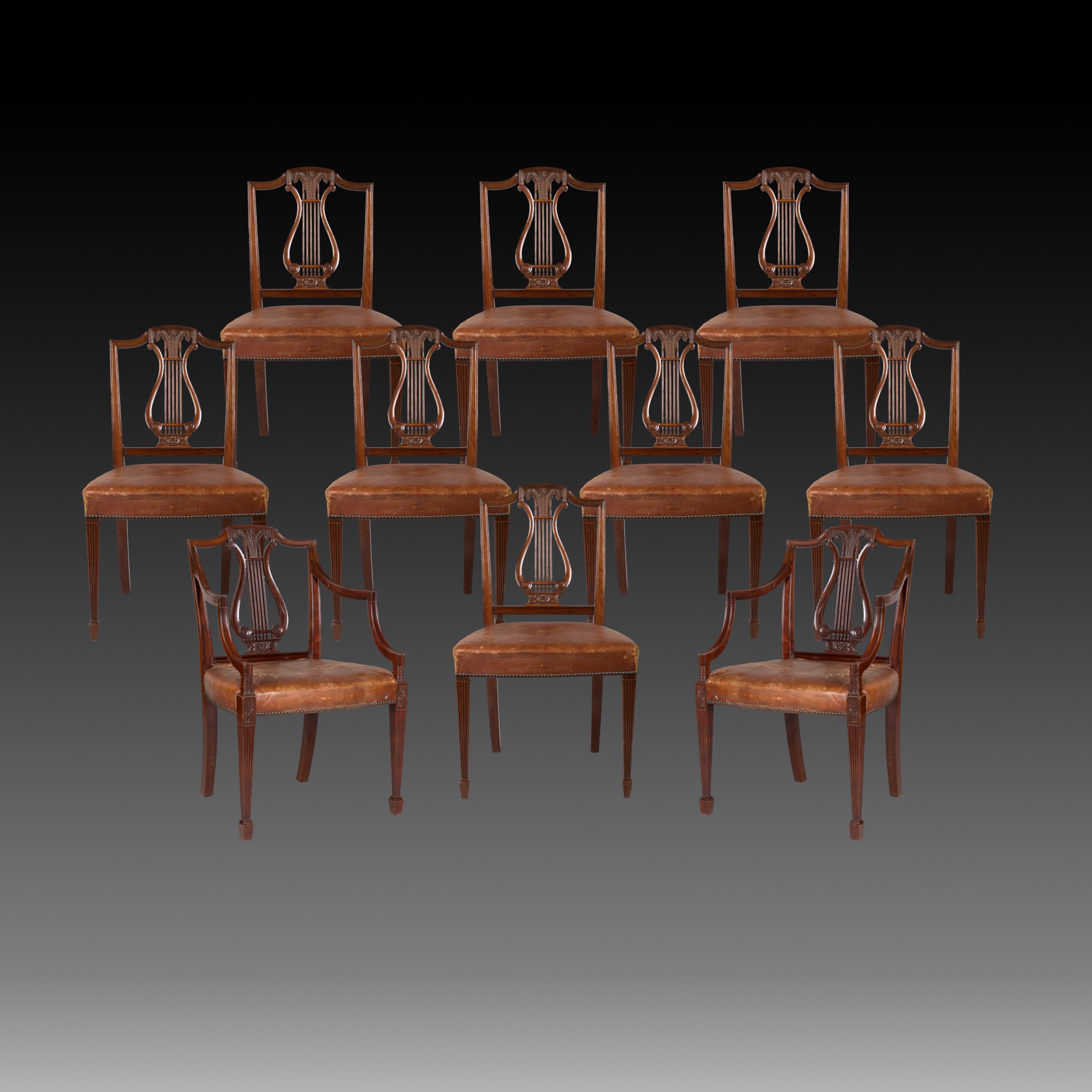 Carved from mahogany, the set composed of 8 side chairs with 2 carvers, the fluted and tapering front legs terminating in spade feet, with sabre legs to the rear; the carved backsplat in the shape of a lyre displaying Neoclassical relief decoration of a wheat sheaf evoking the famous Prince of Wales feathers.