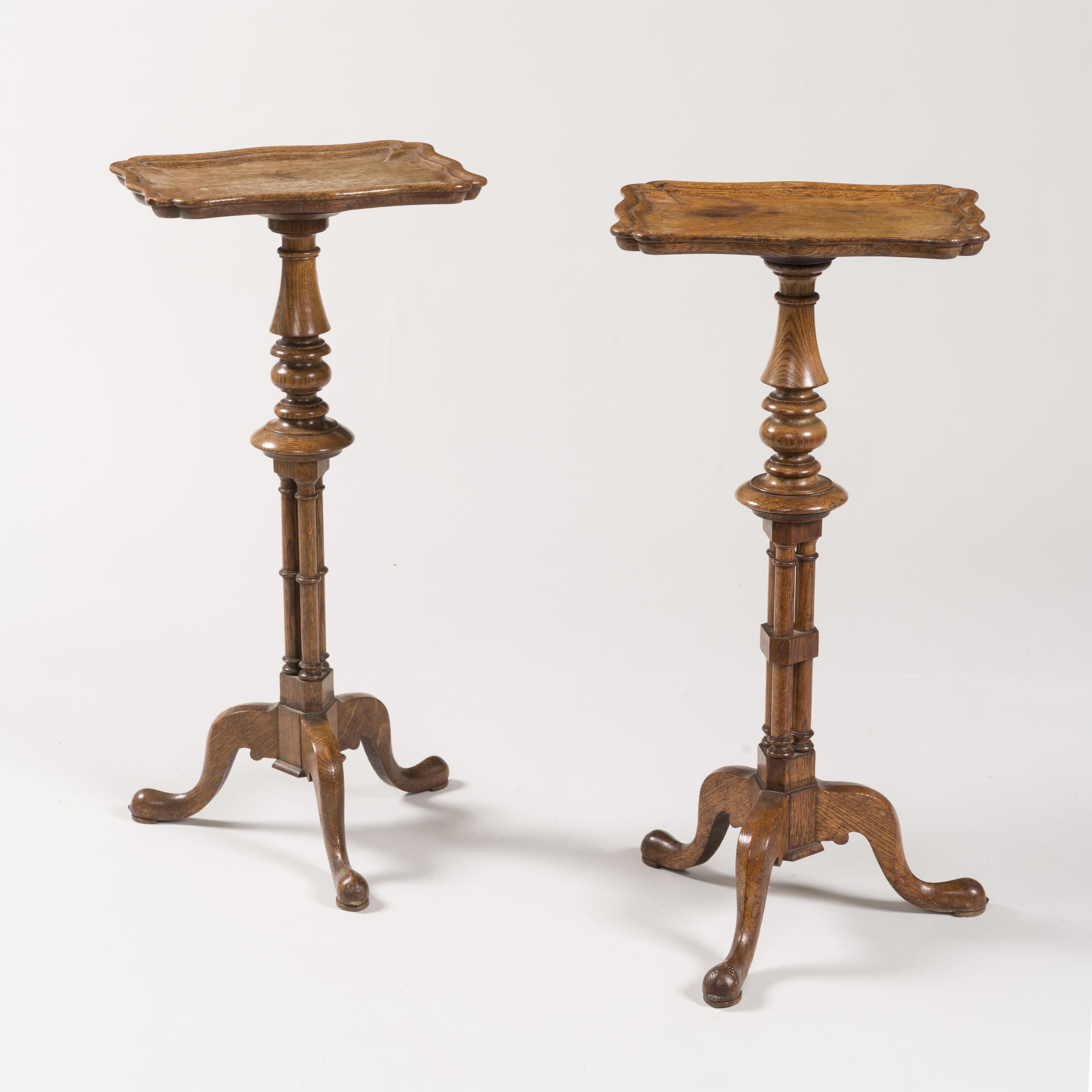 Carved from native English oak, each table having cabriole tripod legs with pad feet, the clusters of tri-columns converging with the waisted, knop turned and tapering stem which supports the serpentine rectangular tops with pie crust moulded edges.
