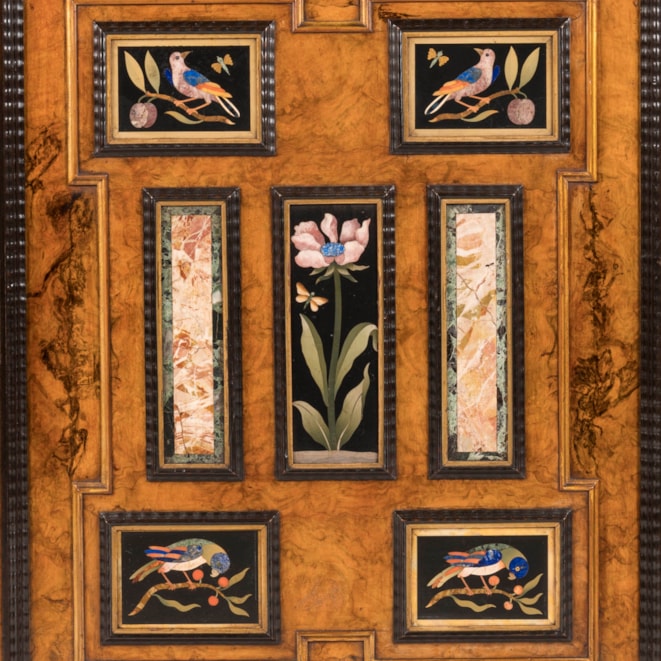 - This English cabinet has 16 Florentine pietra dura panels, featuring Sicilian Jasper, Brocatelle d’Espagne, verde antico, griotte rouge marbles