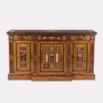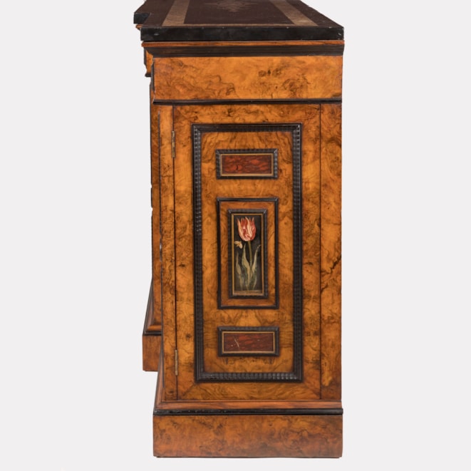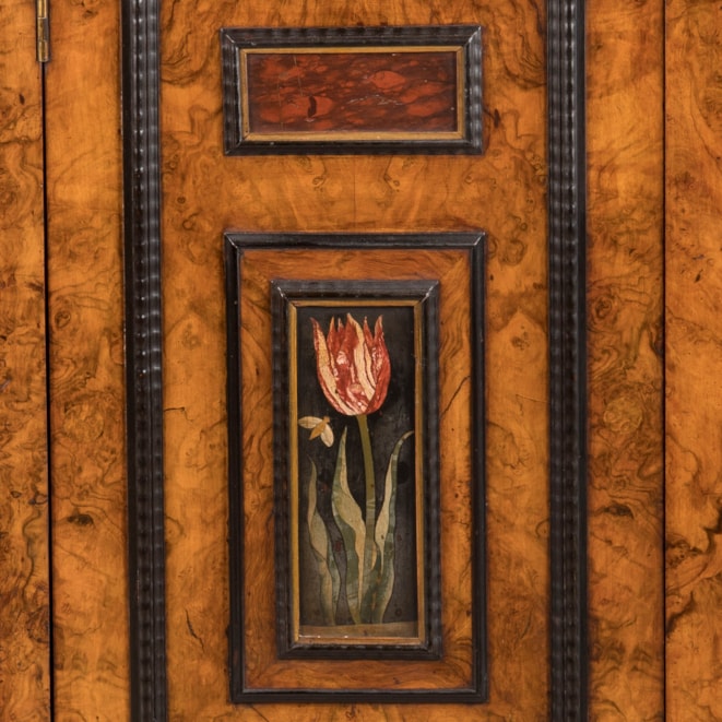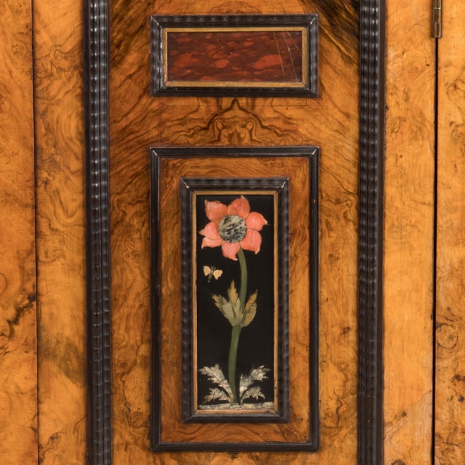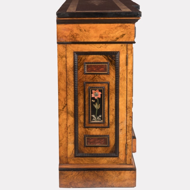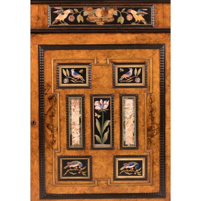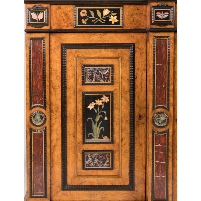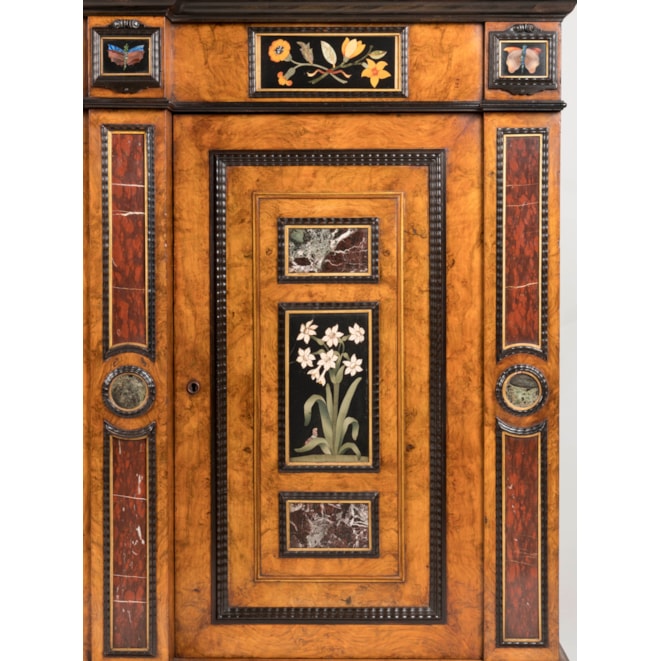 The 19th century black marble top inlaid with a central cartouche of Sicilian Jasper surrounded by Brocatelle d’Espagne and specimens of verde antico, the cabinet  of breakfront outline constructed of burr walnut with ebonised ripple mouldings and banding incorporating 16 Florentine pietra dura panels and no less than 22 marble specimens of griotte rouge and verde antico, the central door with a single pietra dura flower flanked by marble specimens and having pictorial pietra dura to the four corners depicting birds, flanked by a door to either side equally inlaid with a pietra dura panel depicting flowers, interspersed by marble-inlaid pilasters, all opening to reveal a shelved interior; the sides of conforming design with a central pietra dura panel of a flower in bloom, within a panelled and ripple moulded configuration surrounded by a pair of marble specimens, the frieze dressed with four pietra dura panels depicting butterflies interspersed by a further three pictorial pietra dura panels depicting flowers and birds.