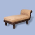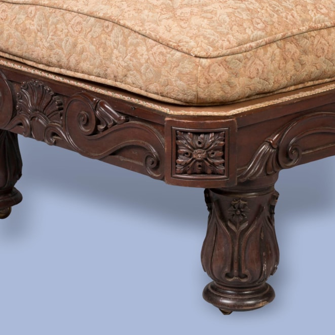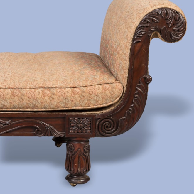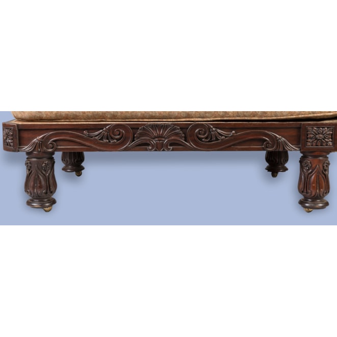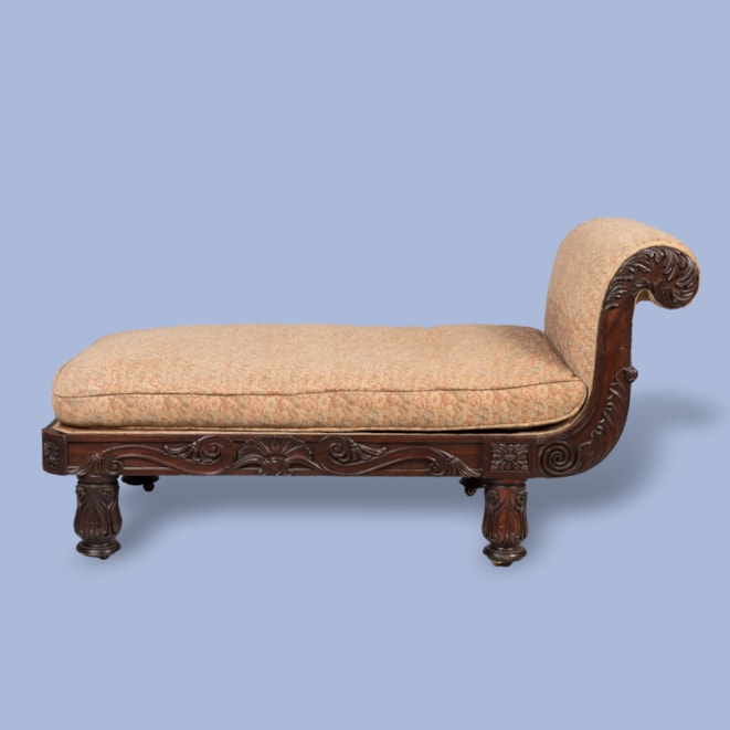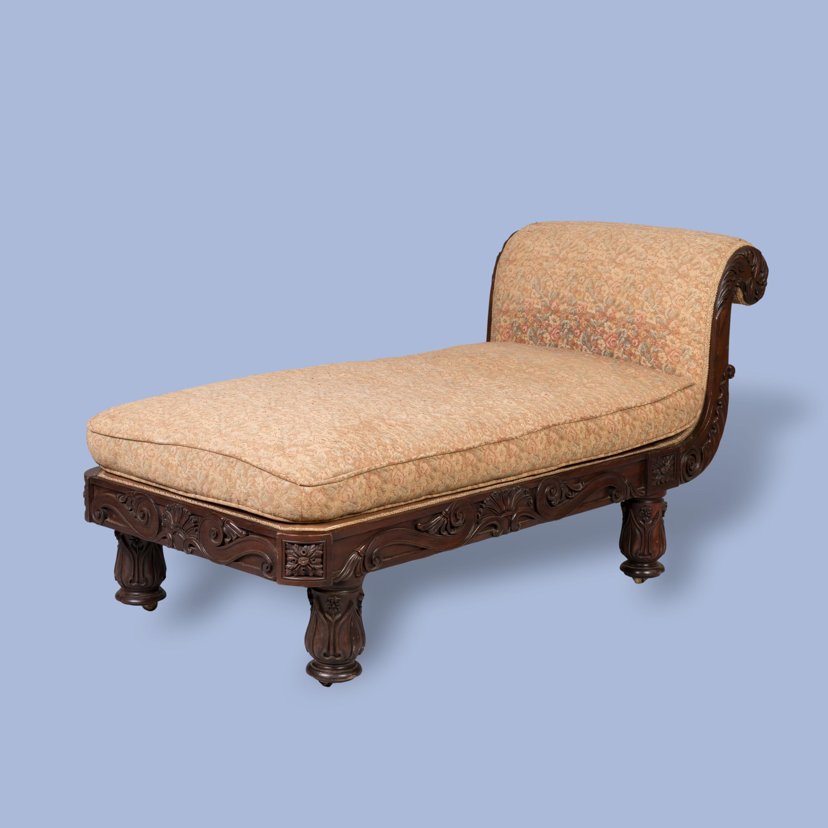 Constructed from mahogany, with confident and typical William IV carving; supported on lotus leaf and floral carved legs with concealed castors; the frieze adorned with scrolled motifs interspersed with shells and carved paterae, one side with a curved backrest carved with acanthus leaves. With fabric upholstery and a squab cushion.