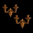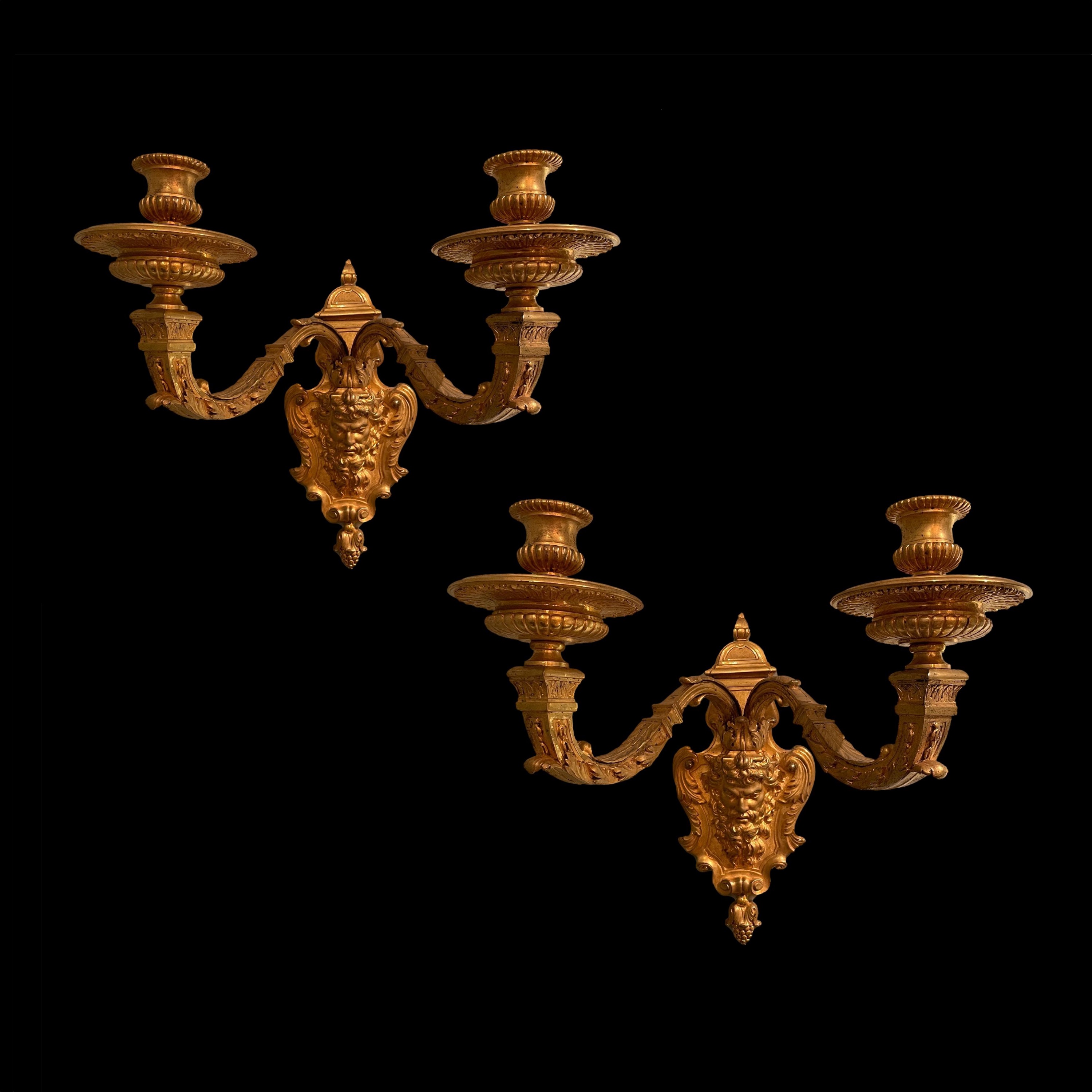 Constructed in finely cast and chased ormolu, twin serpentine square section arms, decorated with foliates support everted drip pans, and baluster turned bobeches, issue from shaped backplates centred about 'Green Man' masks, with pendant seeding fruit terminals, with domed finials over.